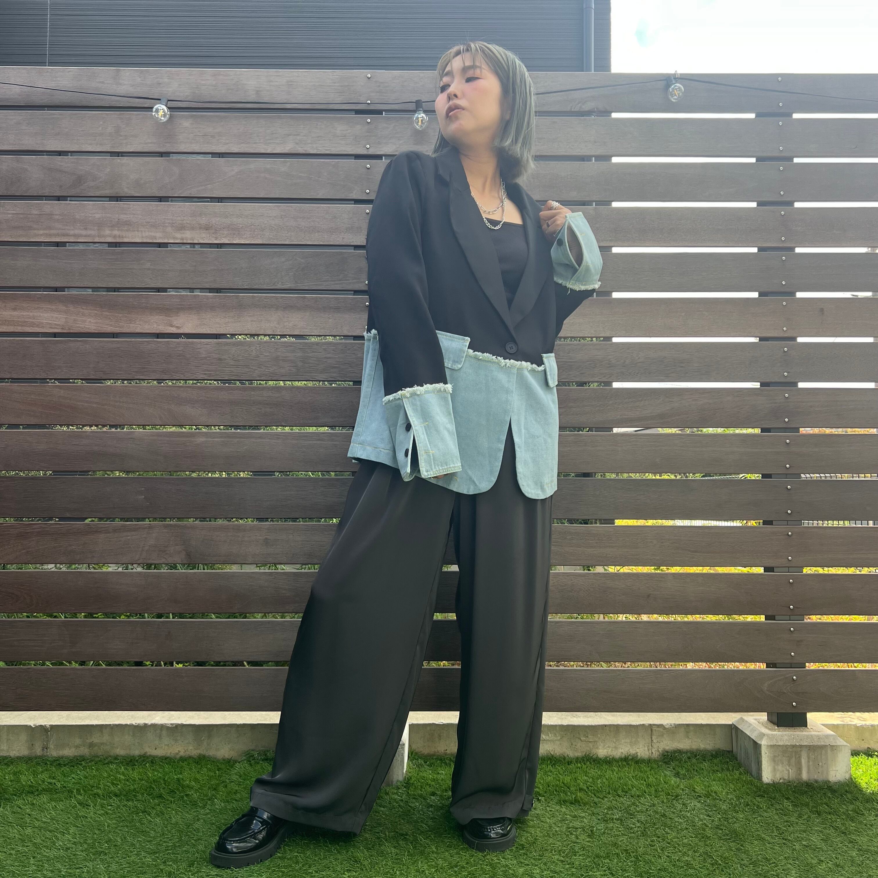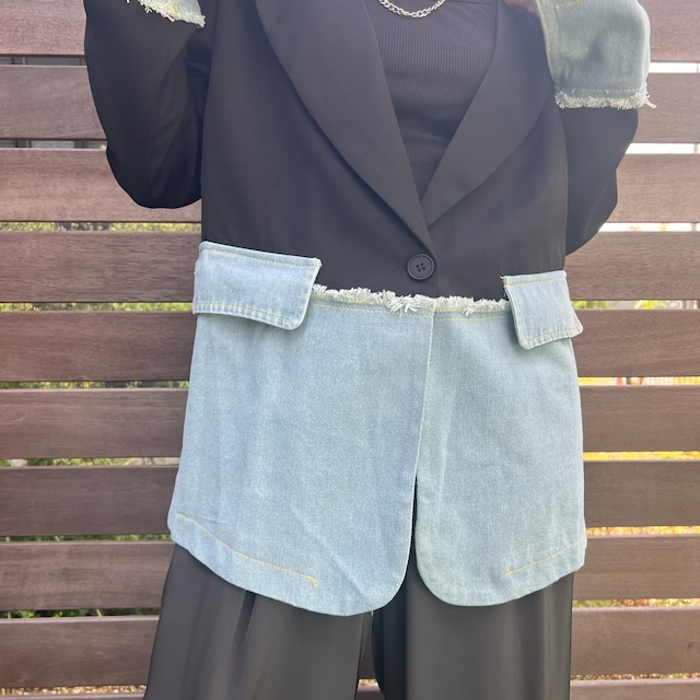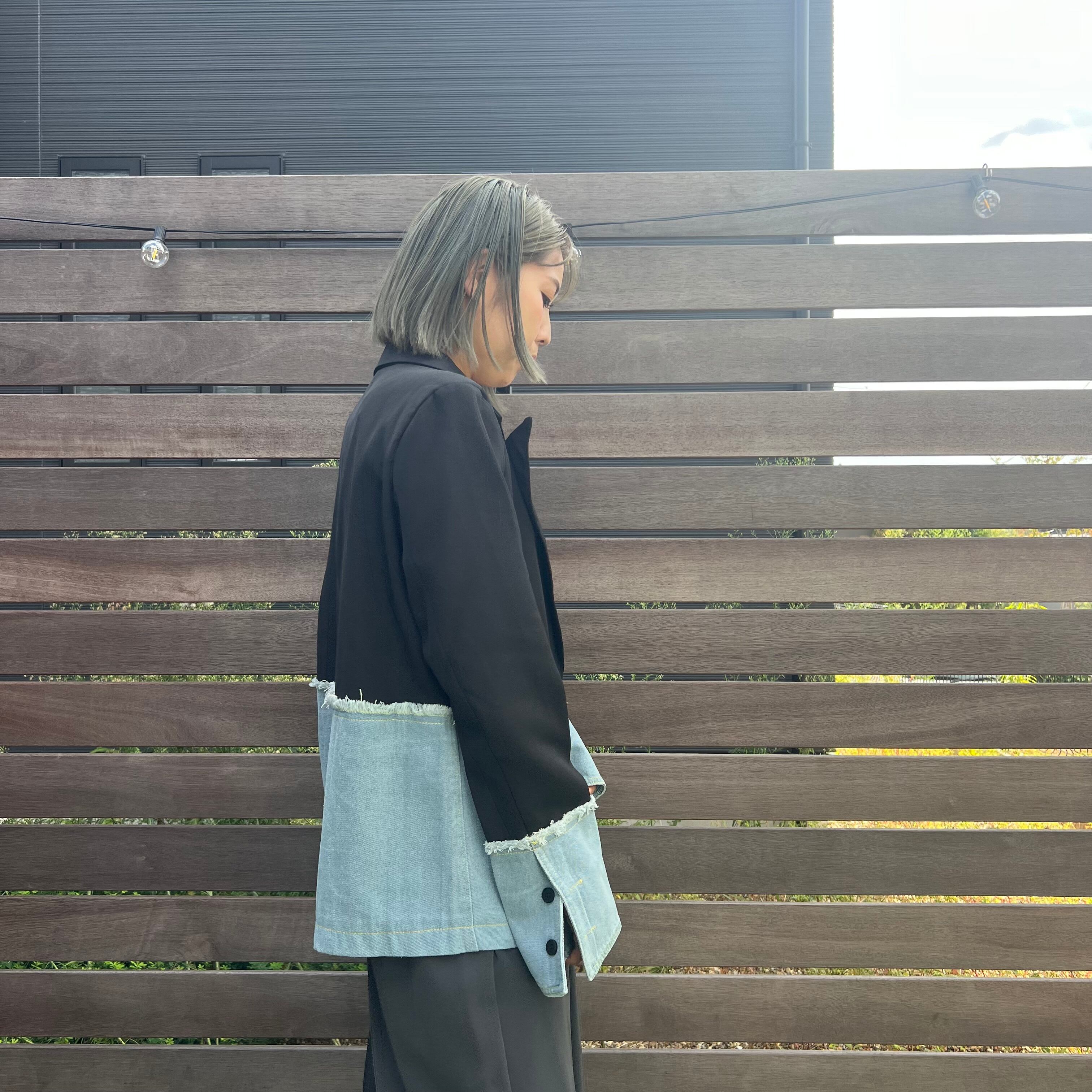 デニム素材とポリエステルを巧みにドッキングさせたこのジャケットは、カジュアルでありながらもお洒落な雰囲気を醸し出します。デニム部分には柔らかな肌触りの綿100%を採用し、快適な着心地を実感できます。異素材の組み合わせが、あなたのファッションに新たな魅力を添える一着です。