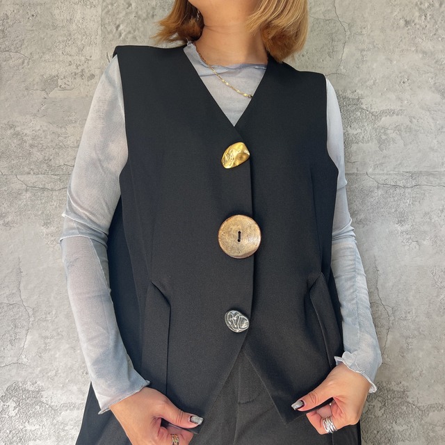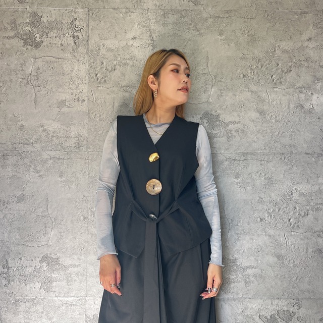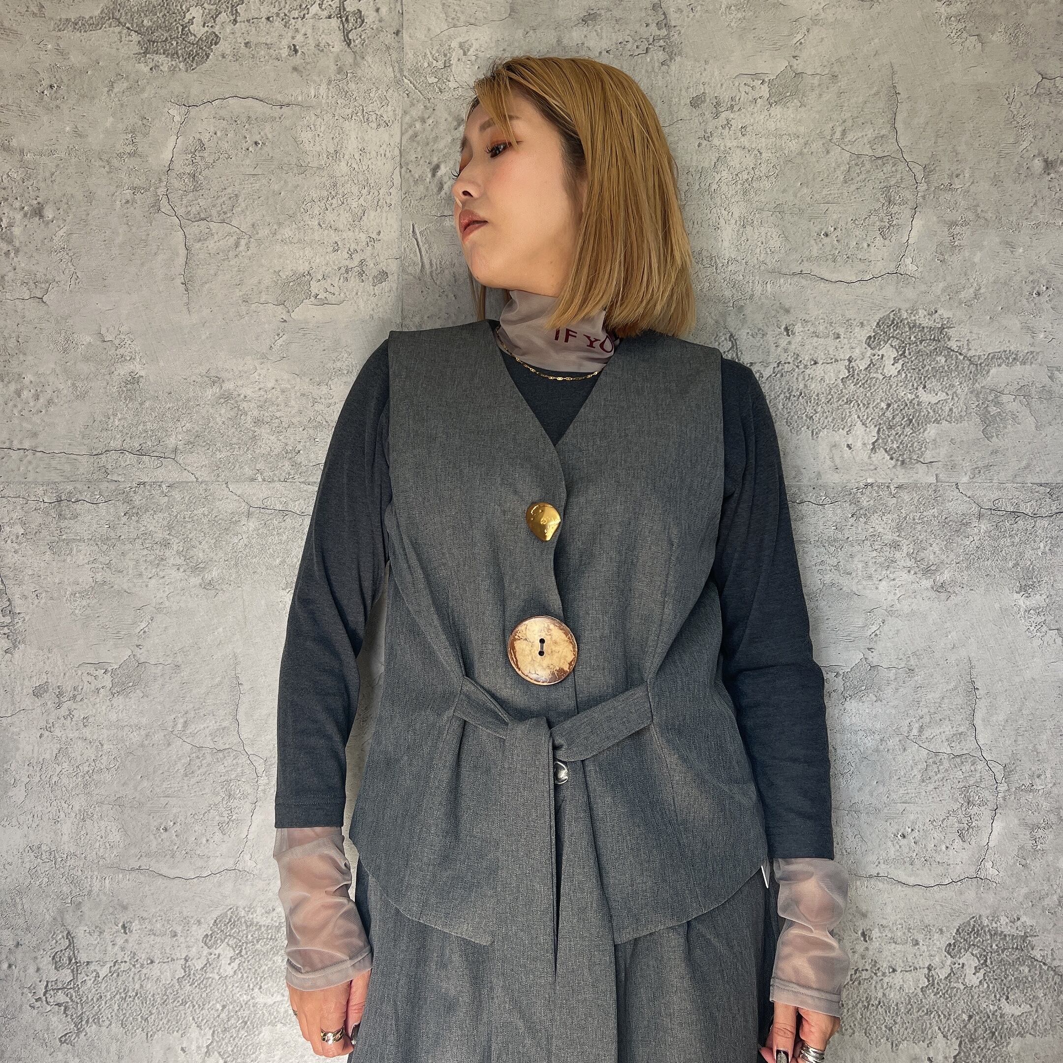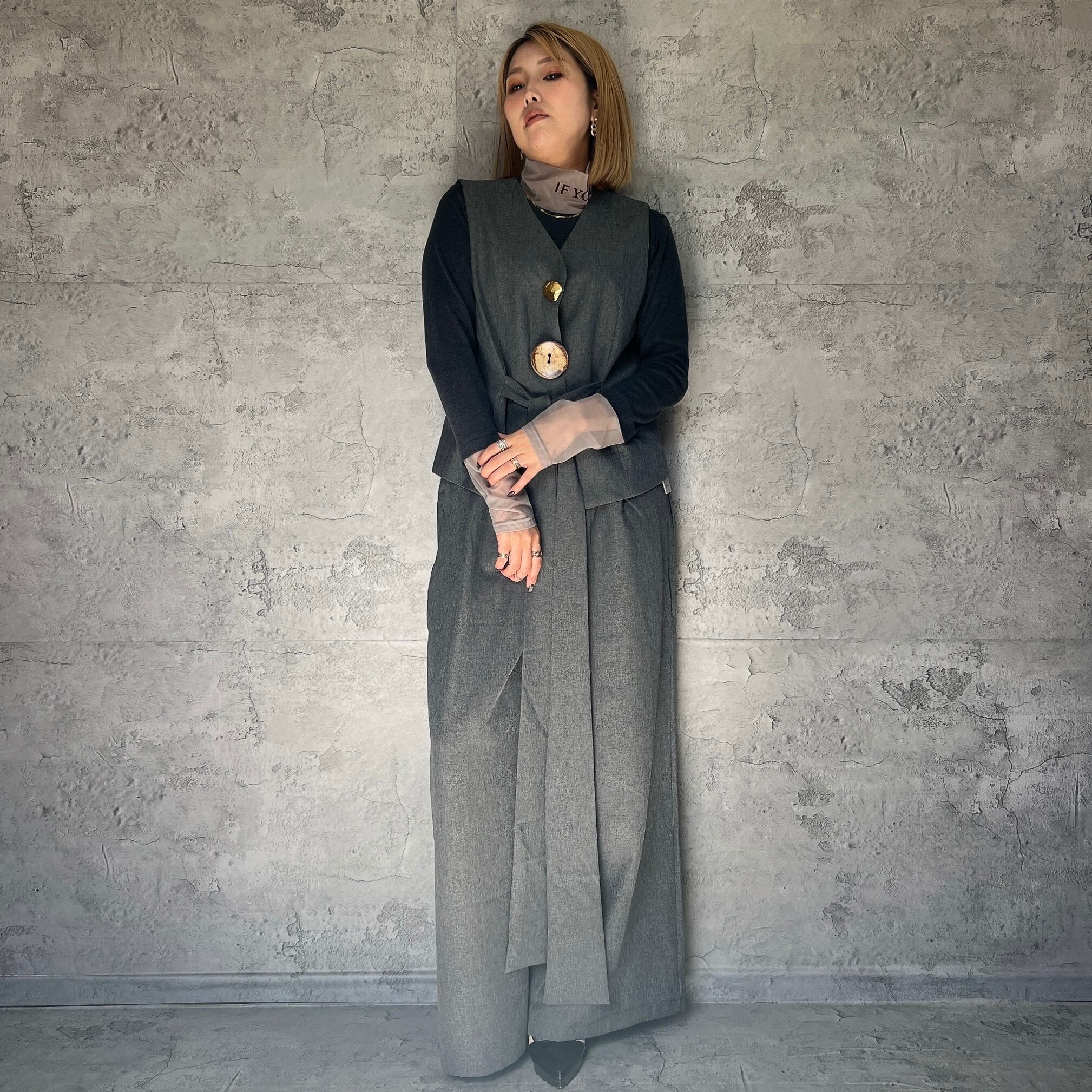 目を引くデザインボタンが特徴のセットアップ。ウエストが絞れたり垂らしたりとその日のテーマによってコーデできるよ◎