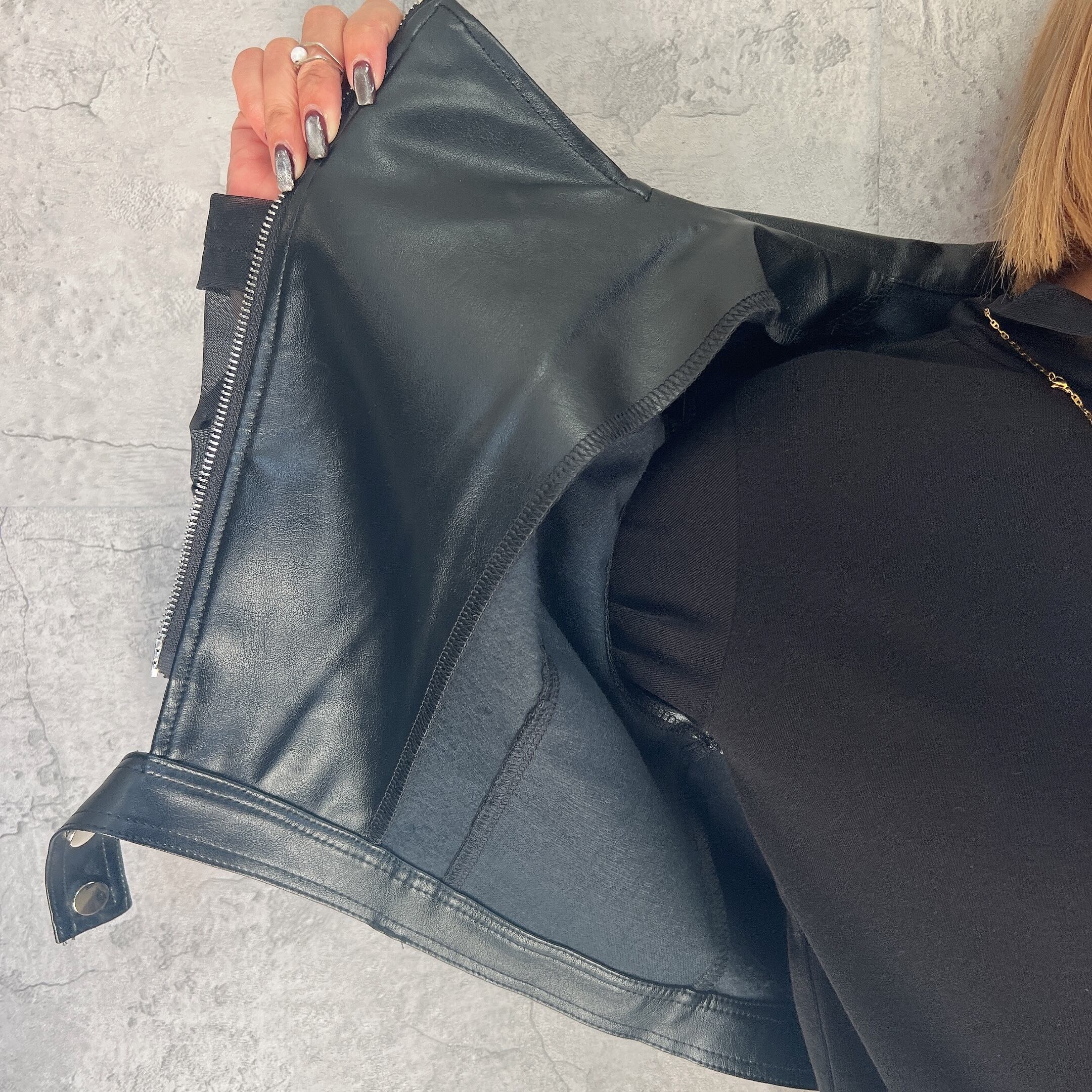 このノースリーブフリルライダースは、表地に合成皮革を使用し、裏地はポリエステル100%で、しなやかさと高い耐久性を兼ね備えています。強めの印象を与えつつ、フリルデザインが柔らかな女性らしさを演出。そのため、カジュアルなシーンから特別な日まで、幅広くお使いいただけるアイテムです!
