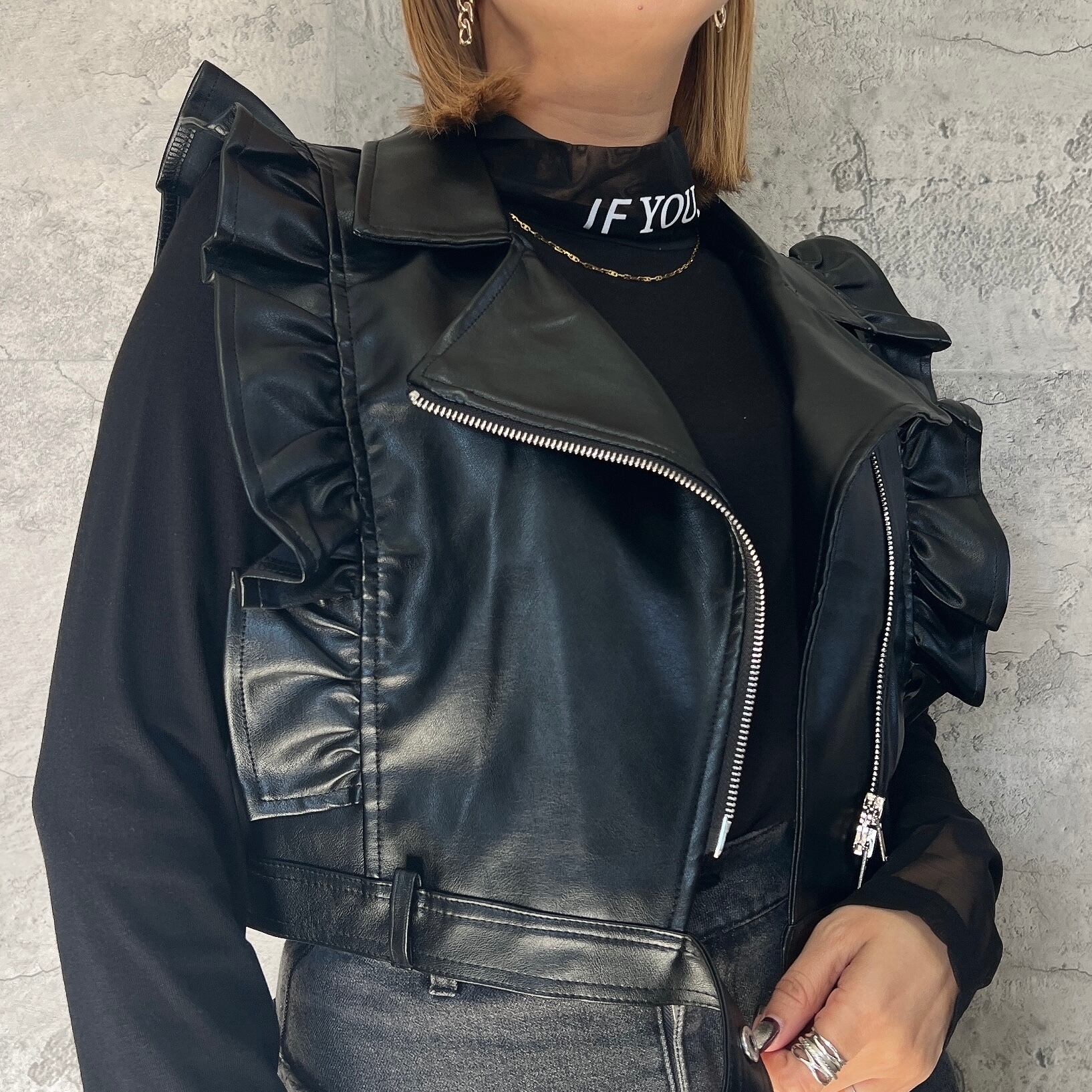 このノースリーブフリルライダースを取り入れて、上品でクールなスタイルをお楽しみください!あなたのワードローブに新たな定番アイテムが加わります。