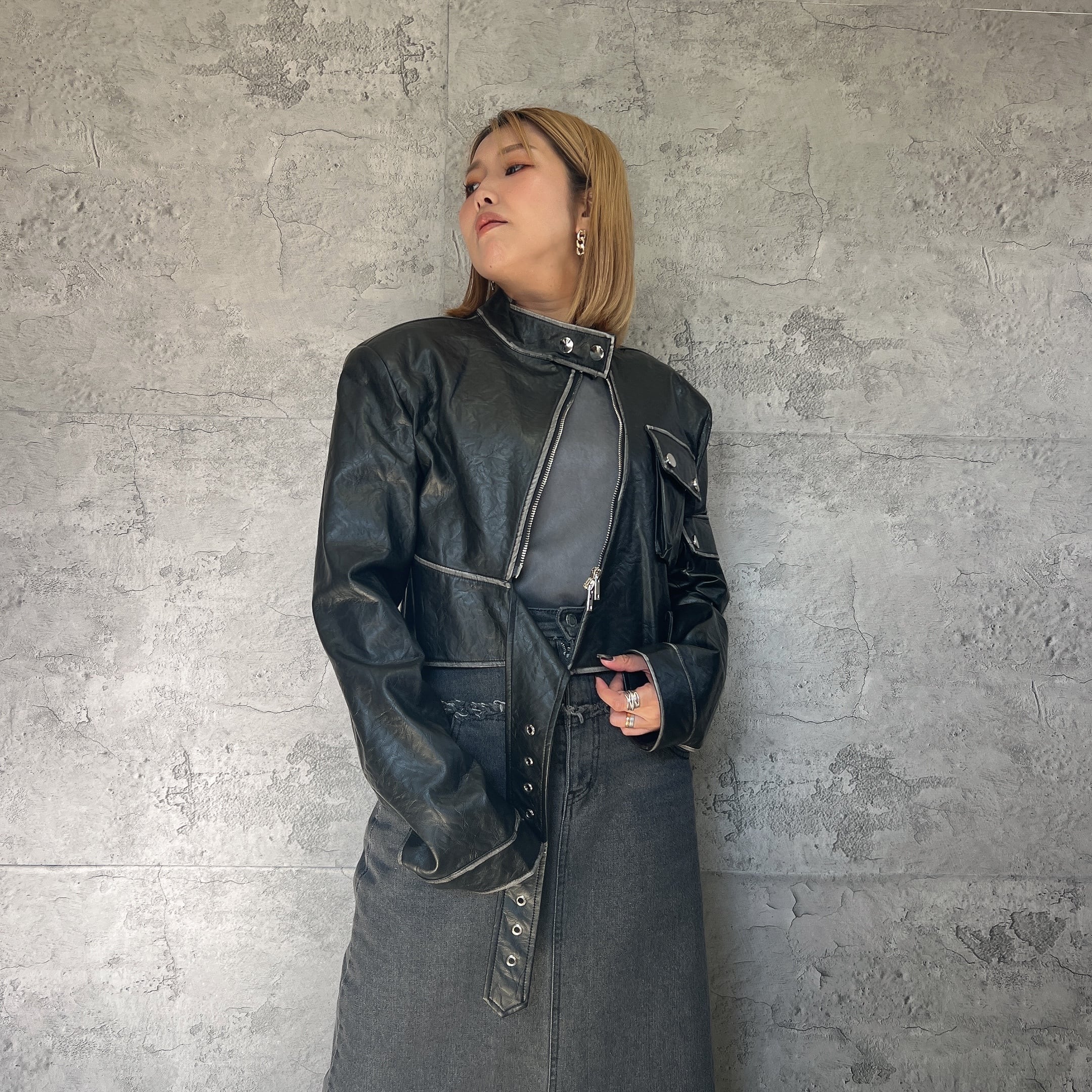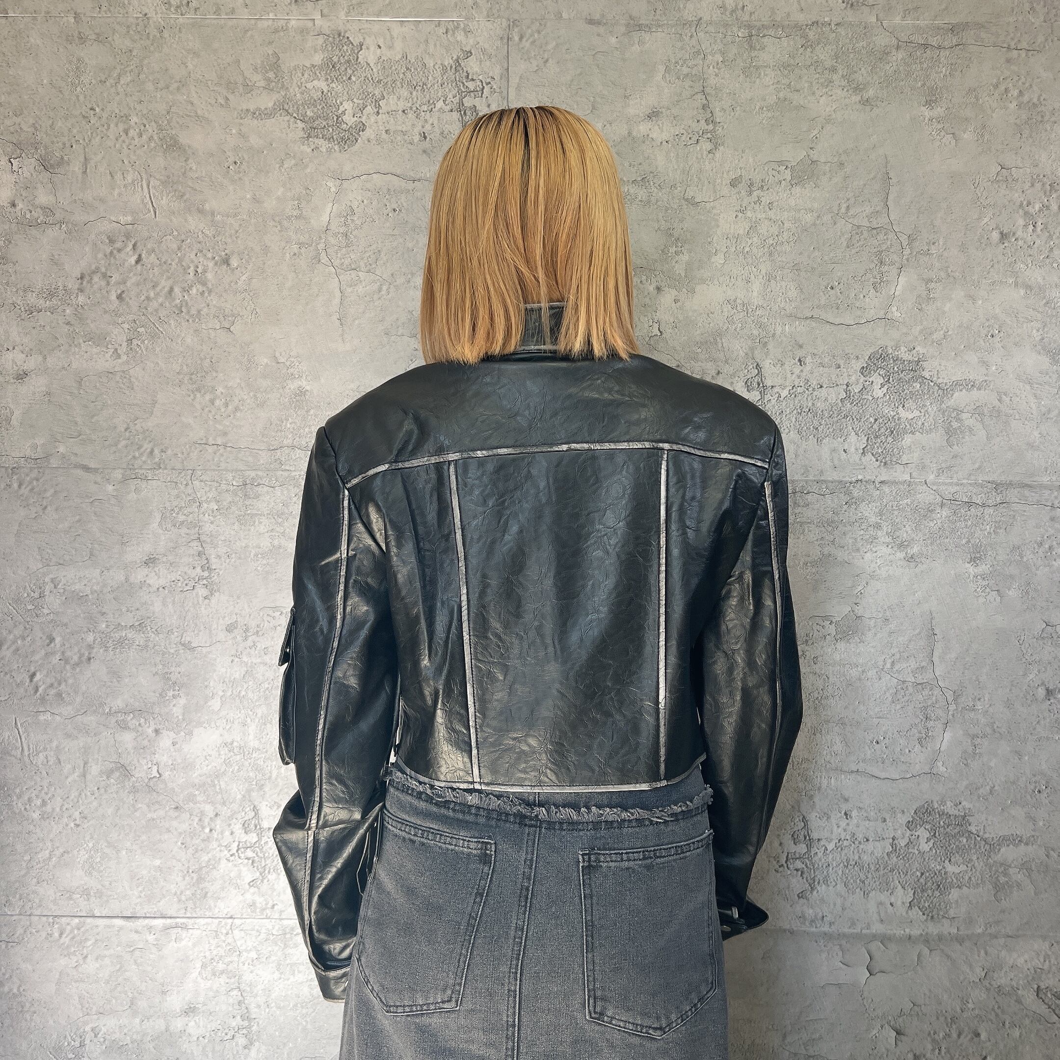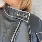 このヴィンテージ風ライダースは、柔らかいフェイクレザーを使用し、至る所に施された白いペイントが特徴です。見る人を惹きつけるデザインで、ヴィンテージ感が抜群に表現されています。かなりのショート丈で、スタイルアップも狙える一着です!