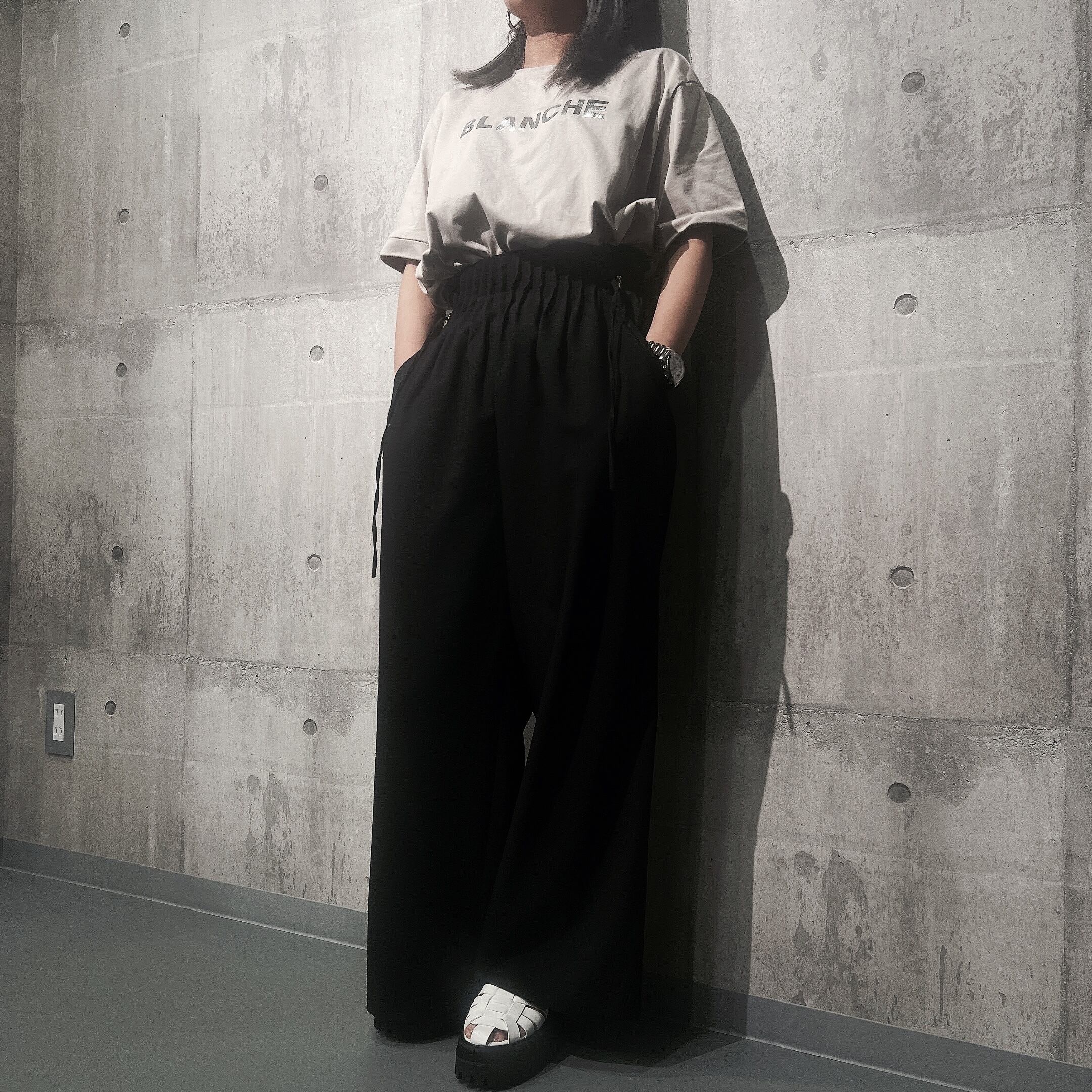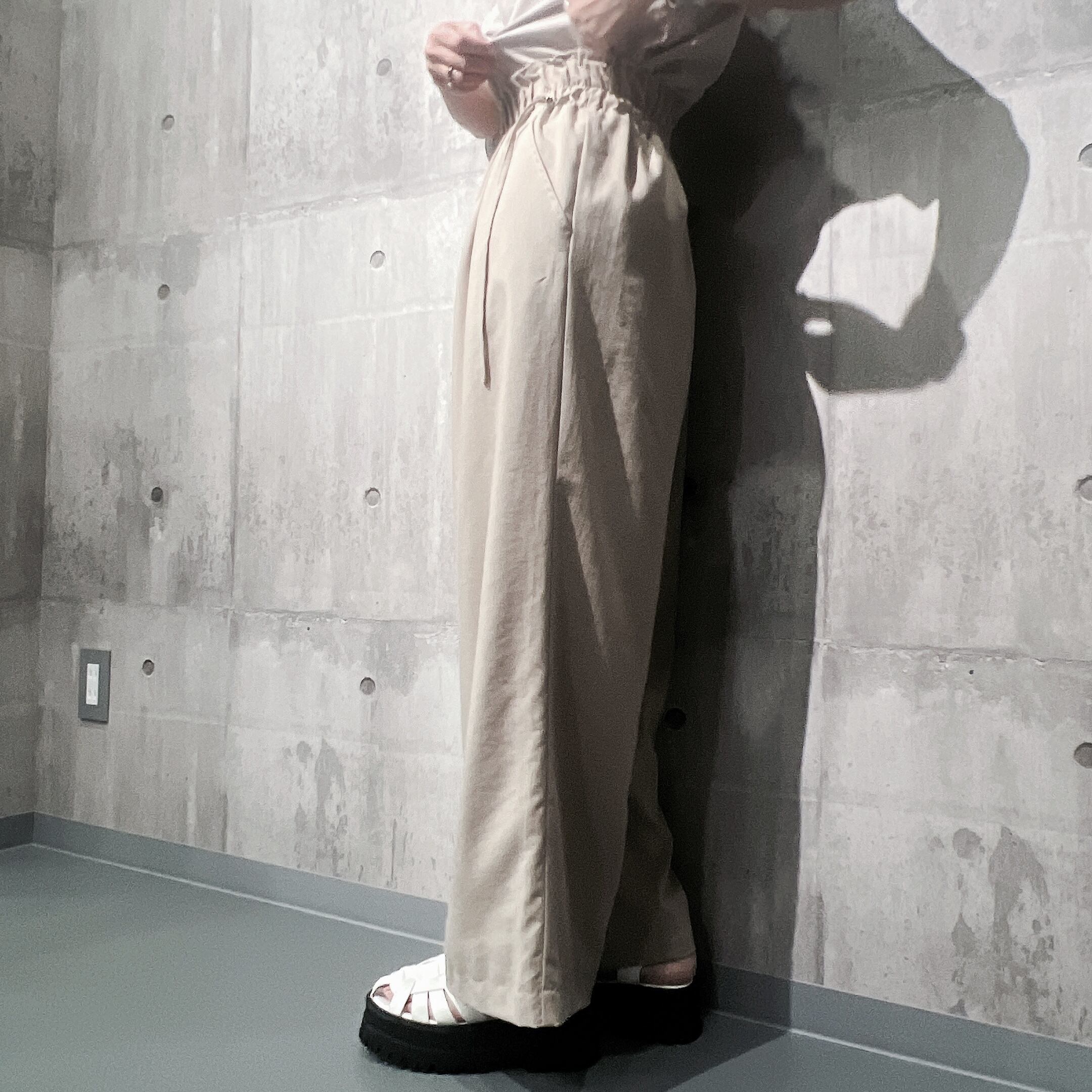 ウエストはゴム仕様&ドロストでウエスト調整もしやすく、ウエスト位置で着丈を短くしたり長くしたりして頂けます。