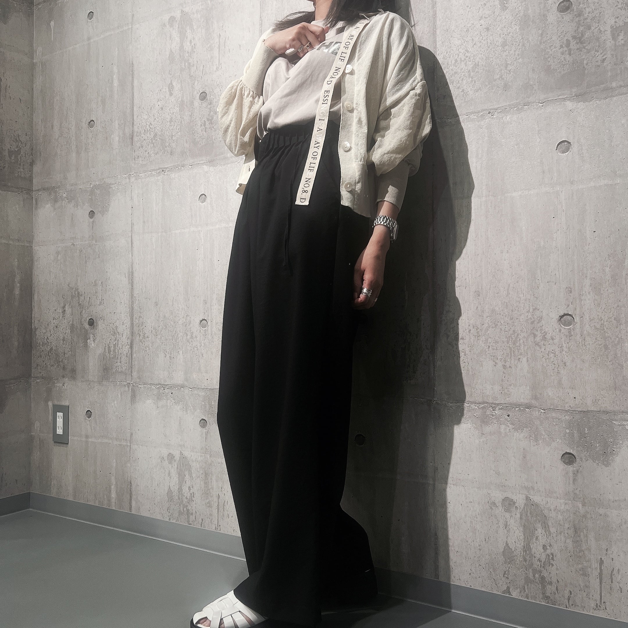 インナーを軽くインしてウエストを少し見せたスタイリングがおすすめです。