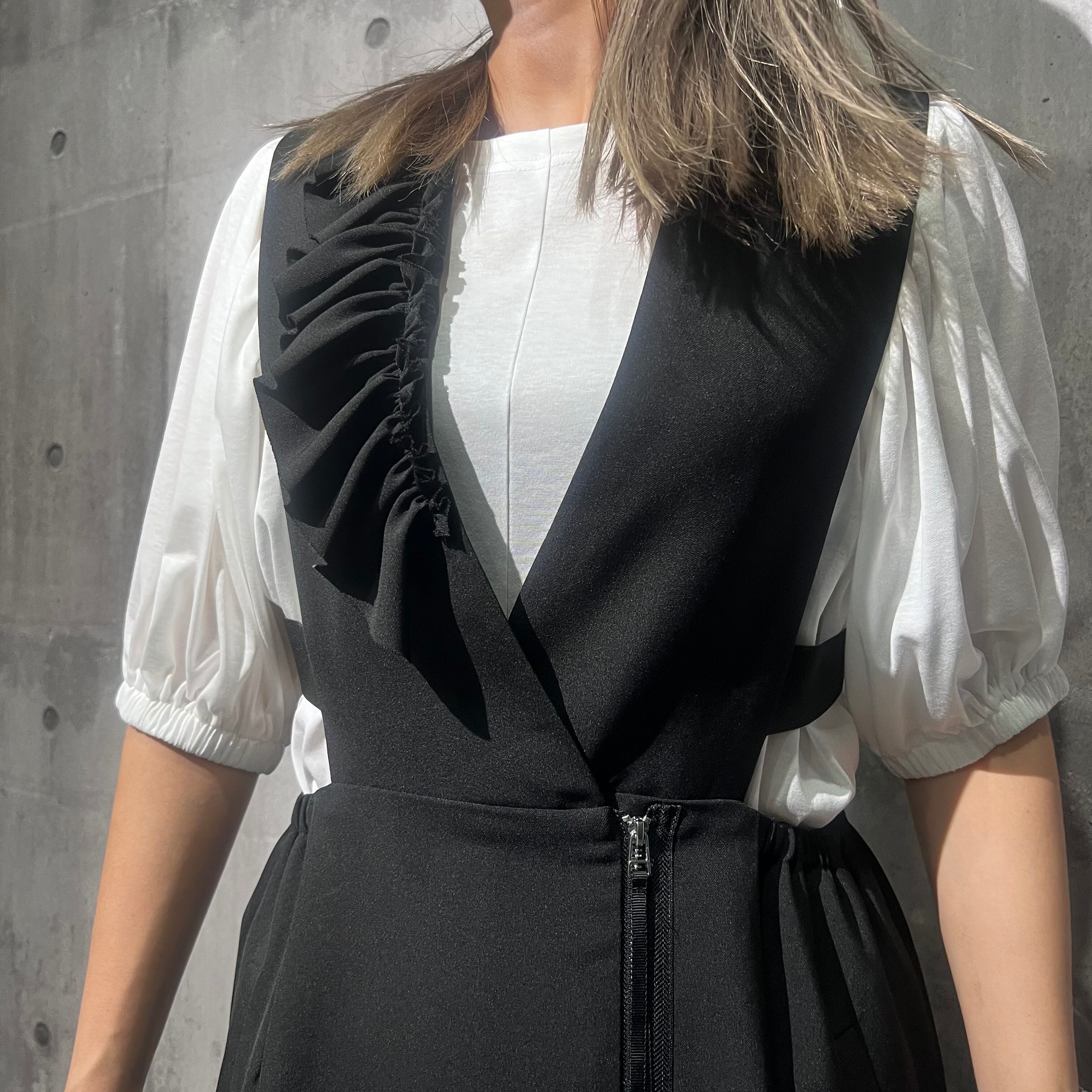 片側にあしらったフリルが可愛く、フロントジップやカットアウトデザインがモード感をあげてくれます。