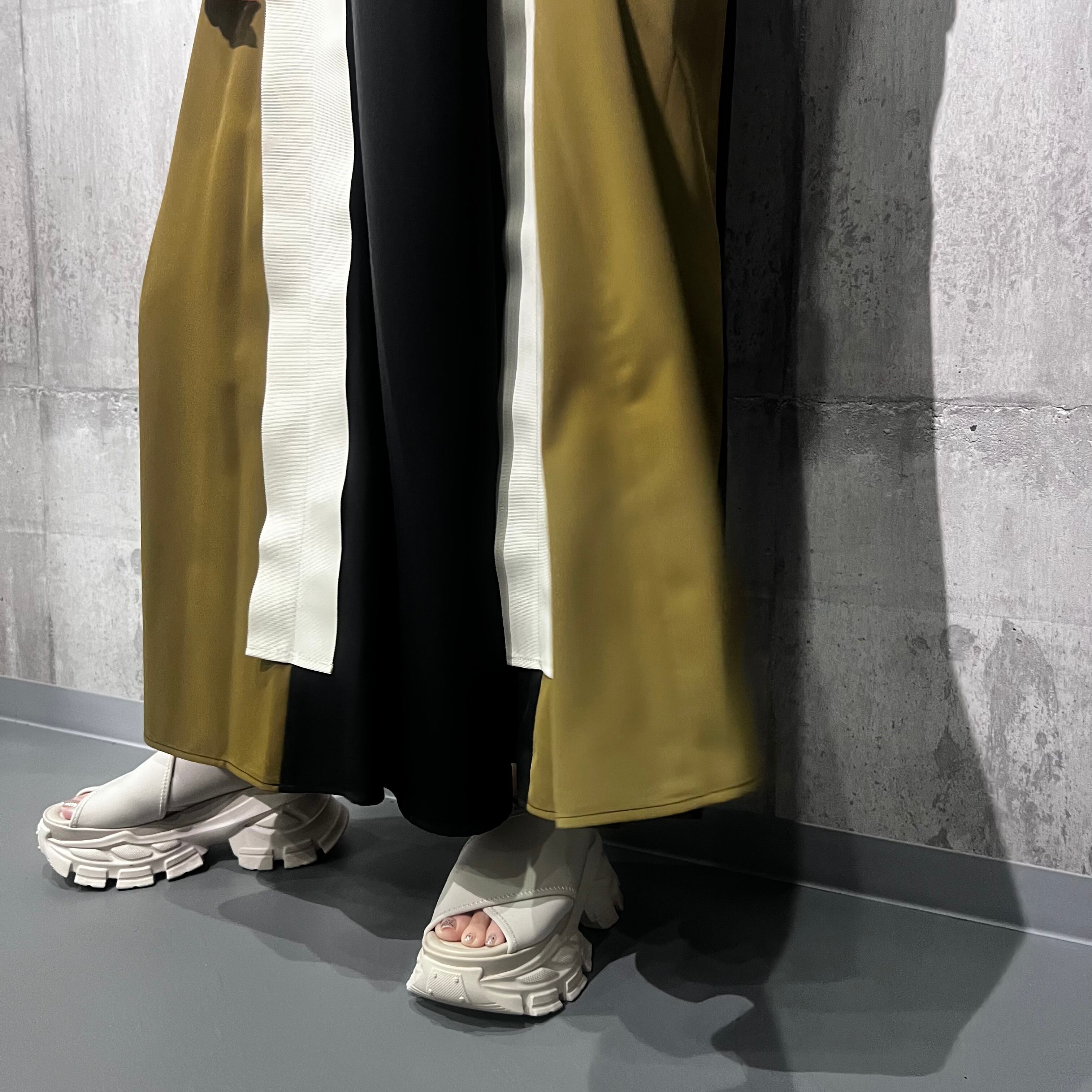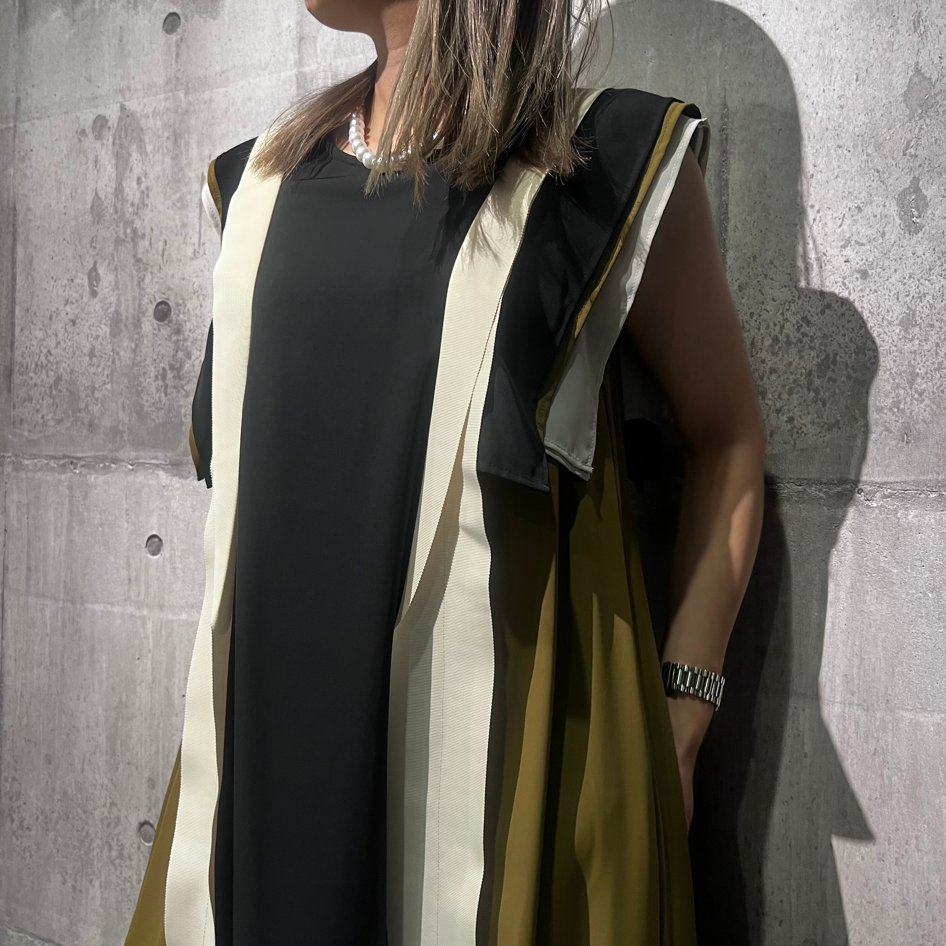 広幅のテープで縦長効果を演出したスッキリみえのドレスレベルのワンピース。