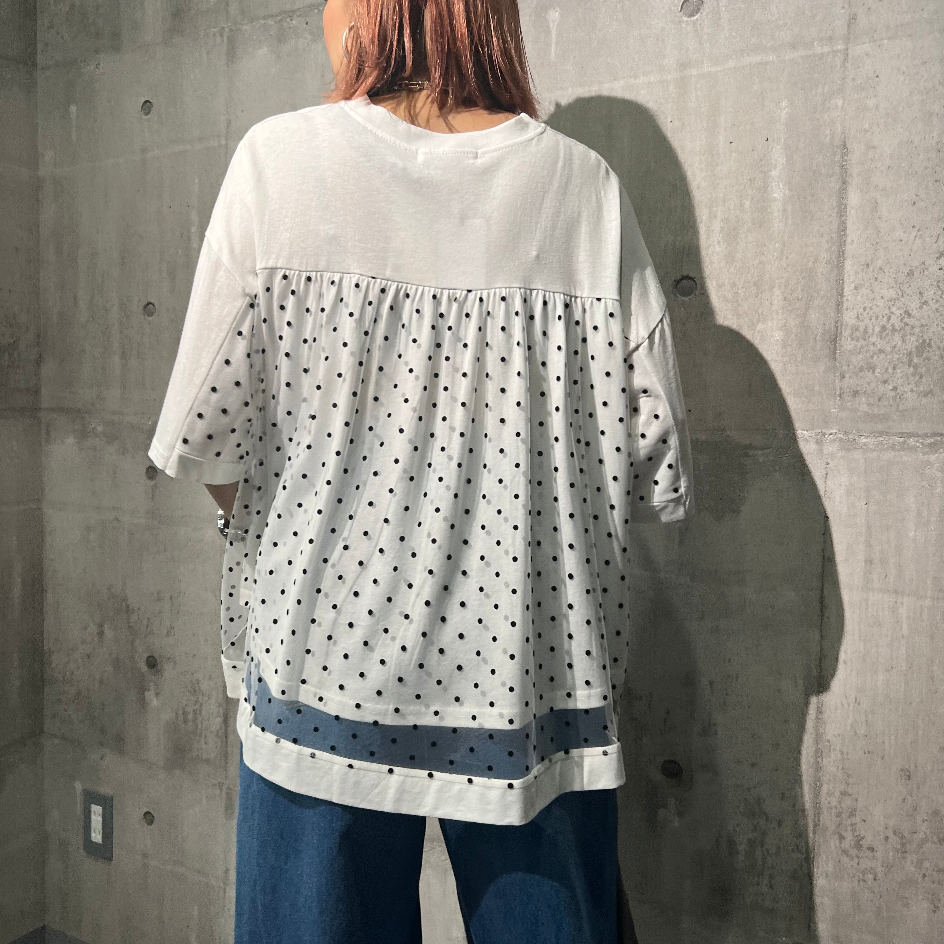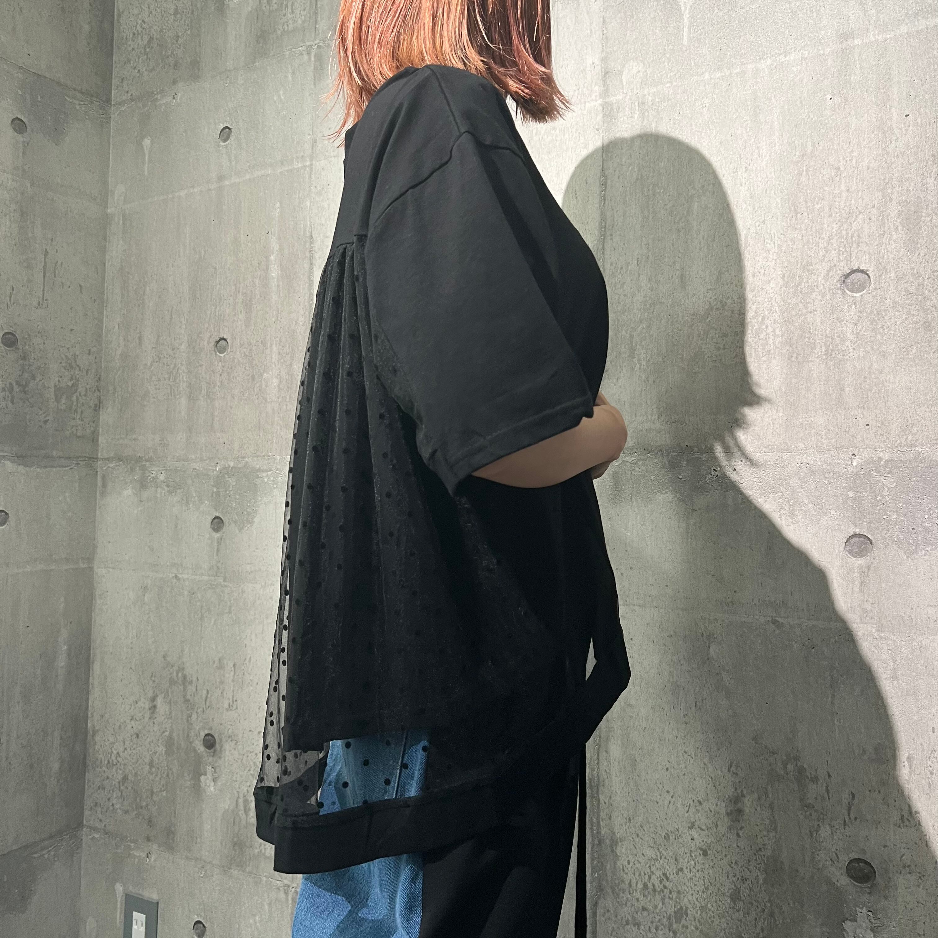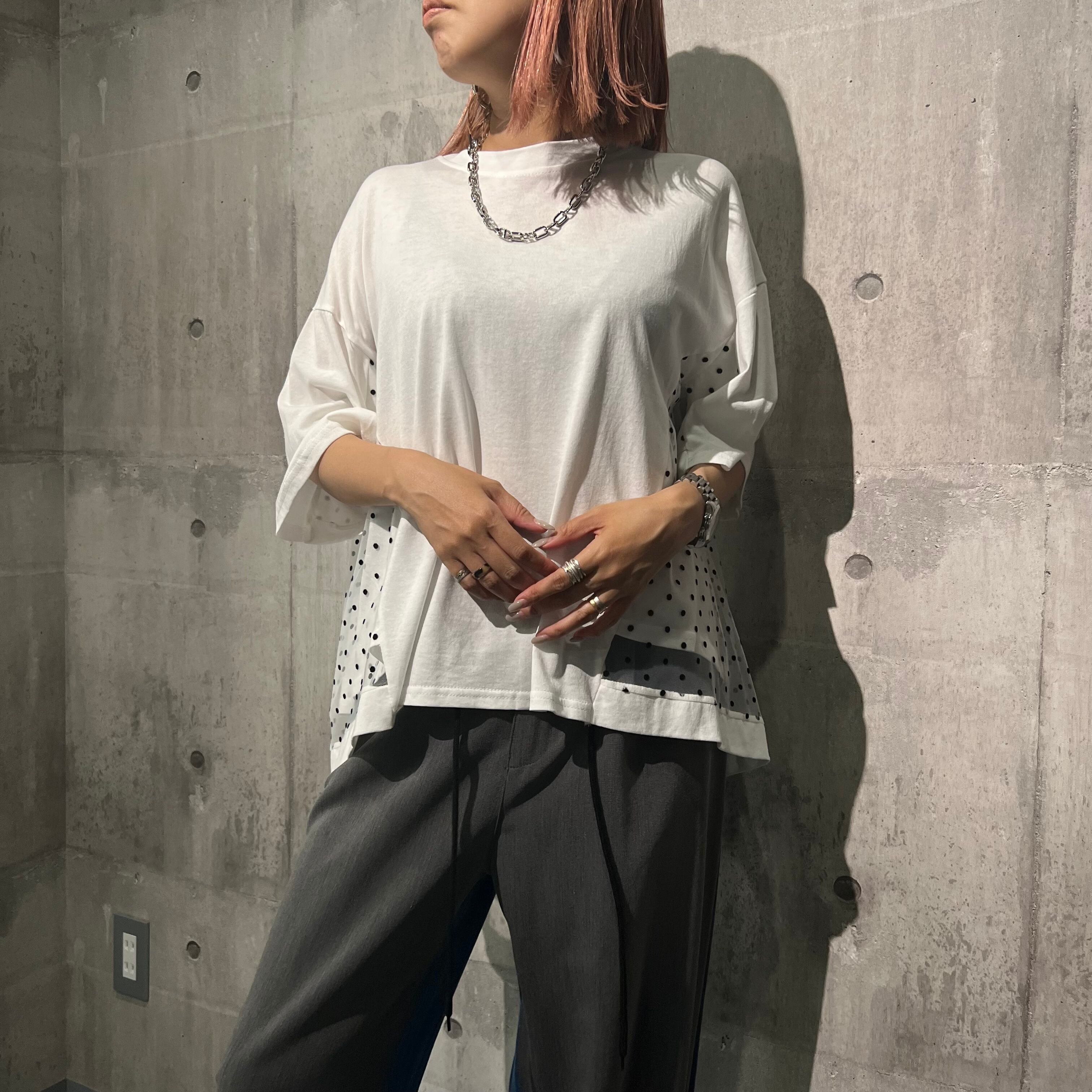 レトロな雰囲気漂うドットフロッキーチュール2TEX TOPS。柔らかい風合いとふんわりとした透け感が魅力です。センタープレスのデザインで、女性らしいシルエットを演出します。