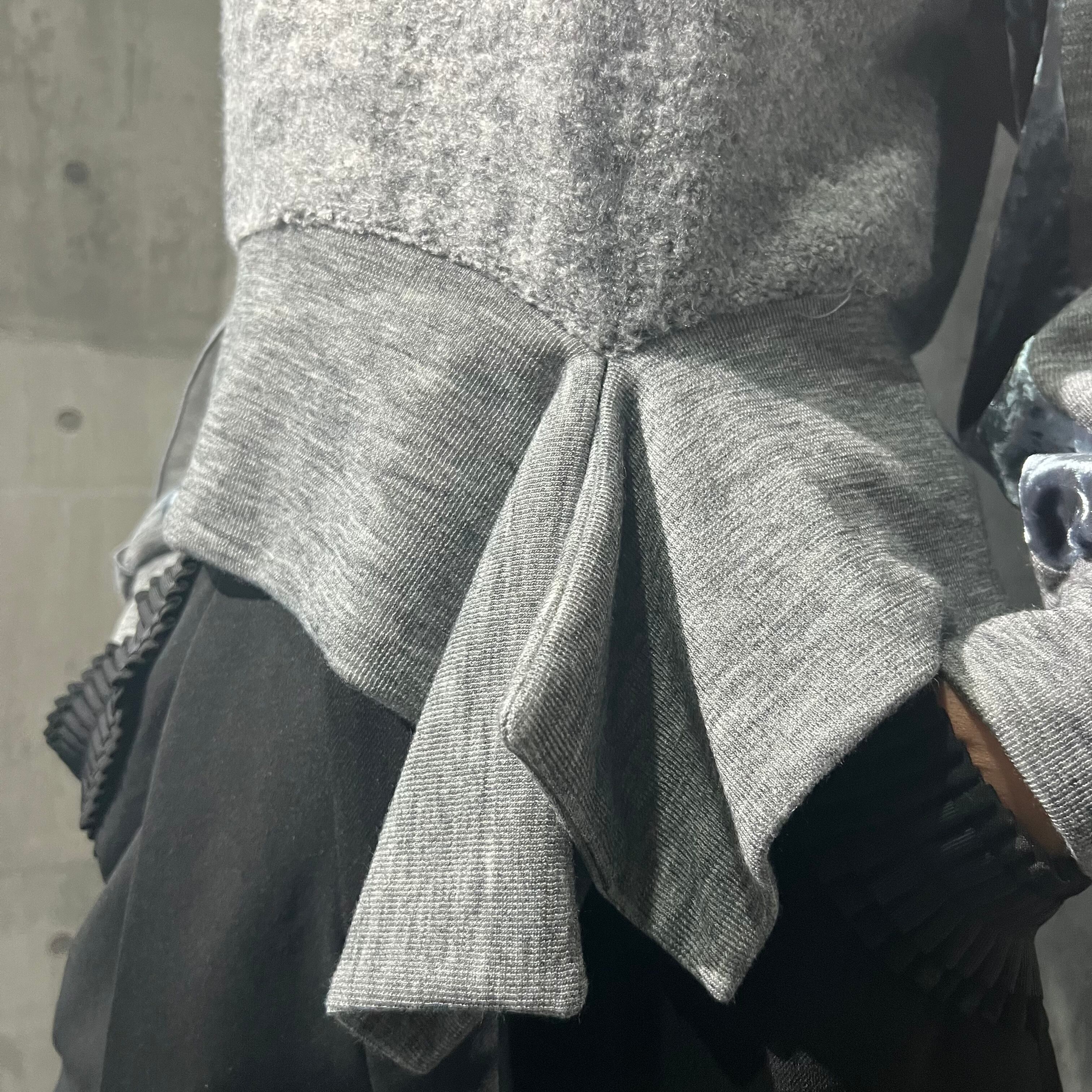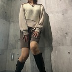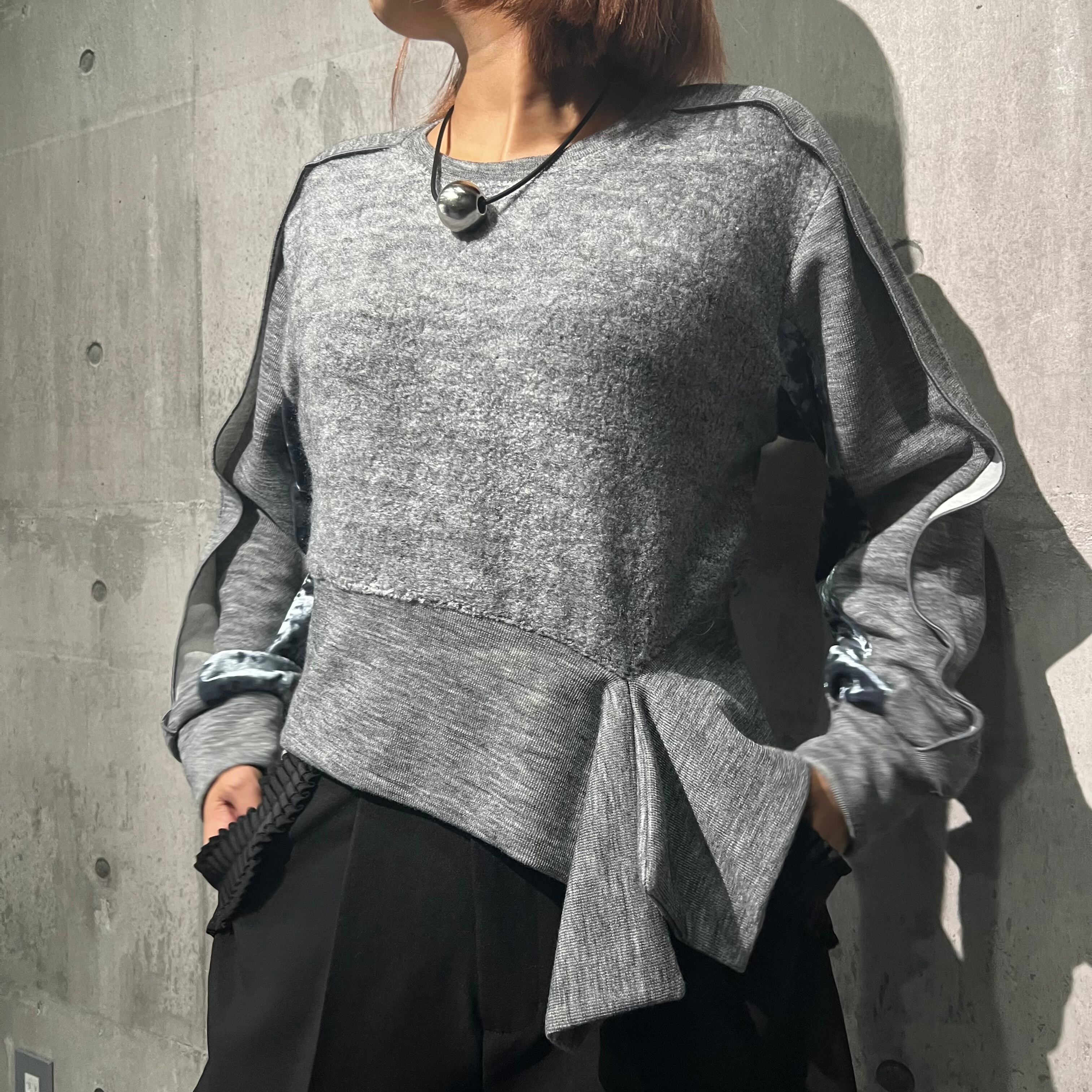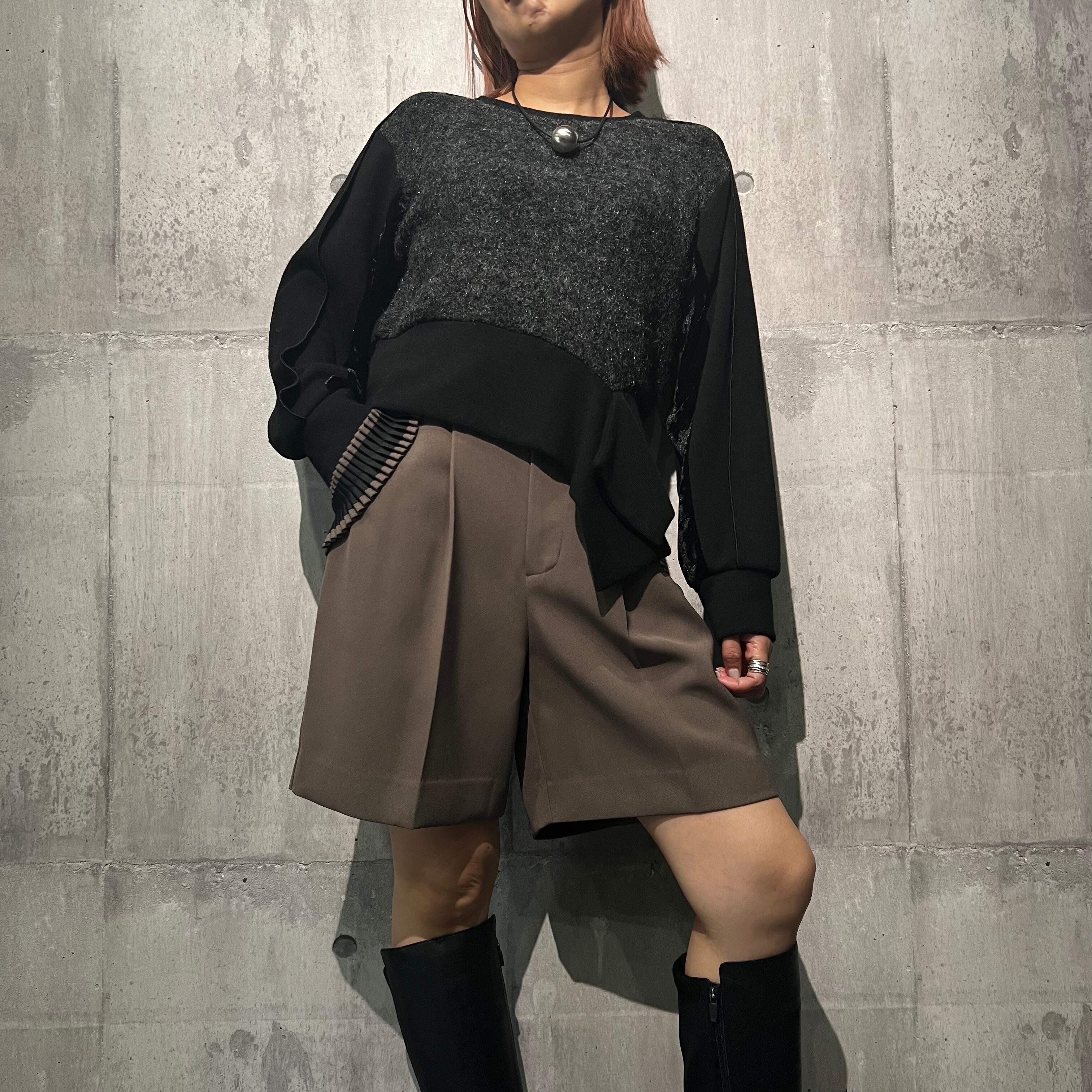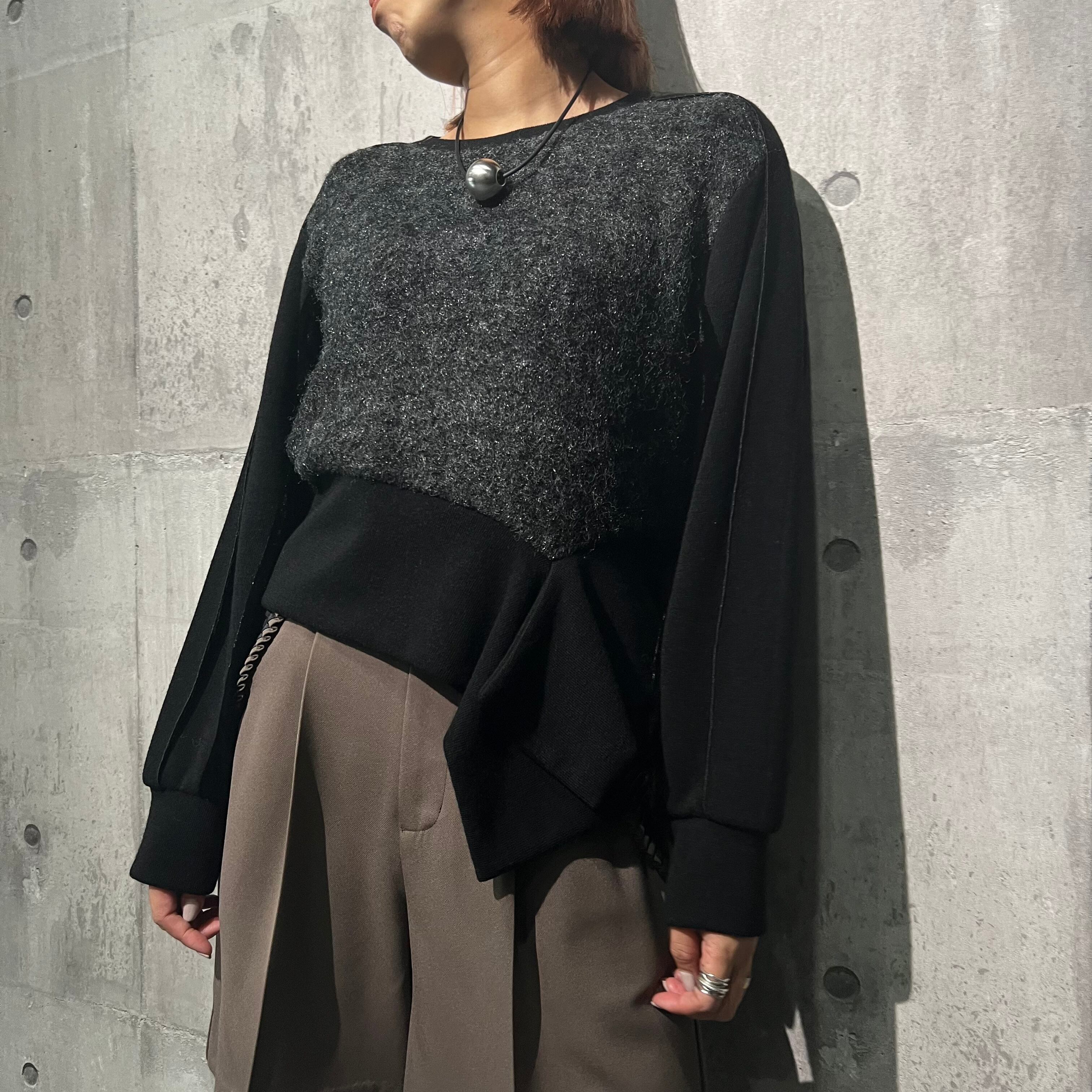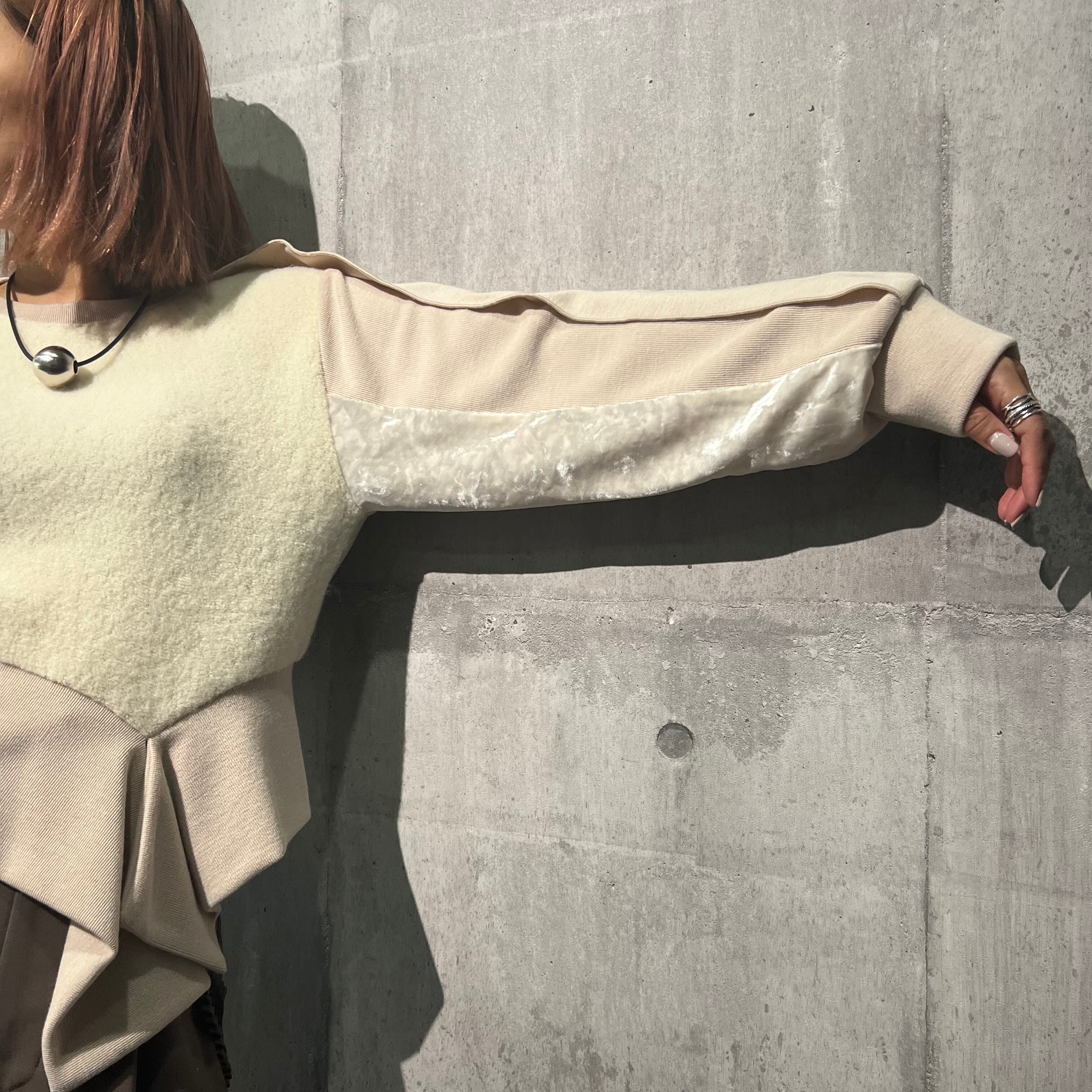 ふわふわのニットボア素材をメインに3素材をパッチワークしたショート丈のプルオーバー。