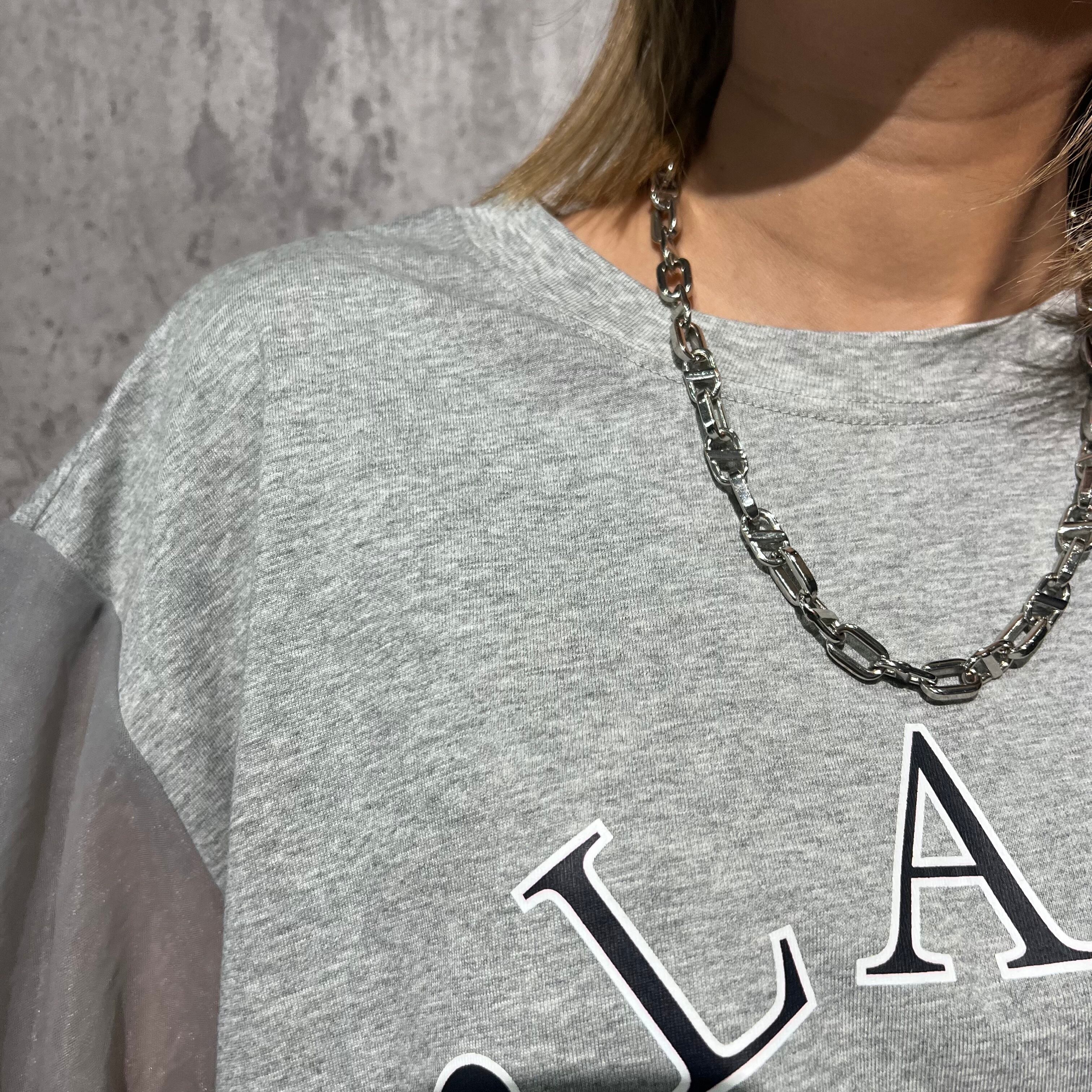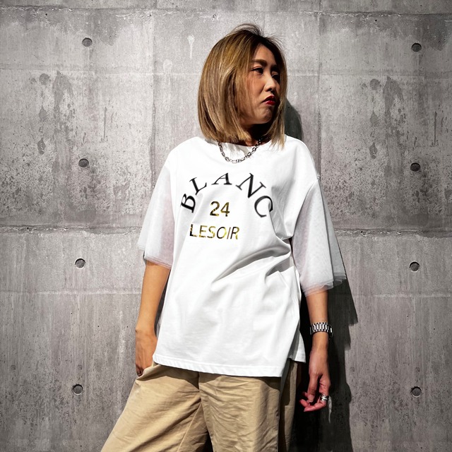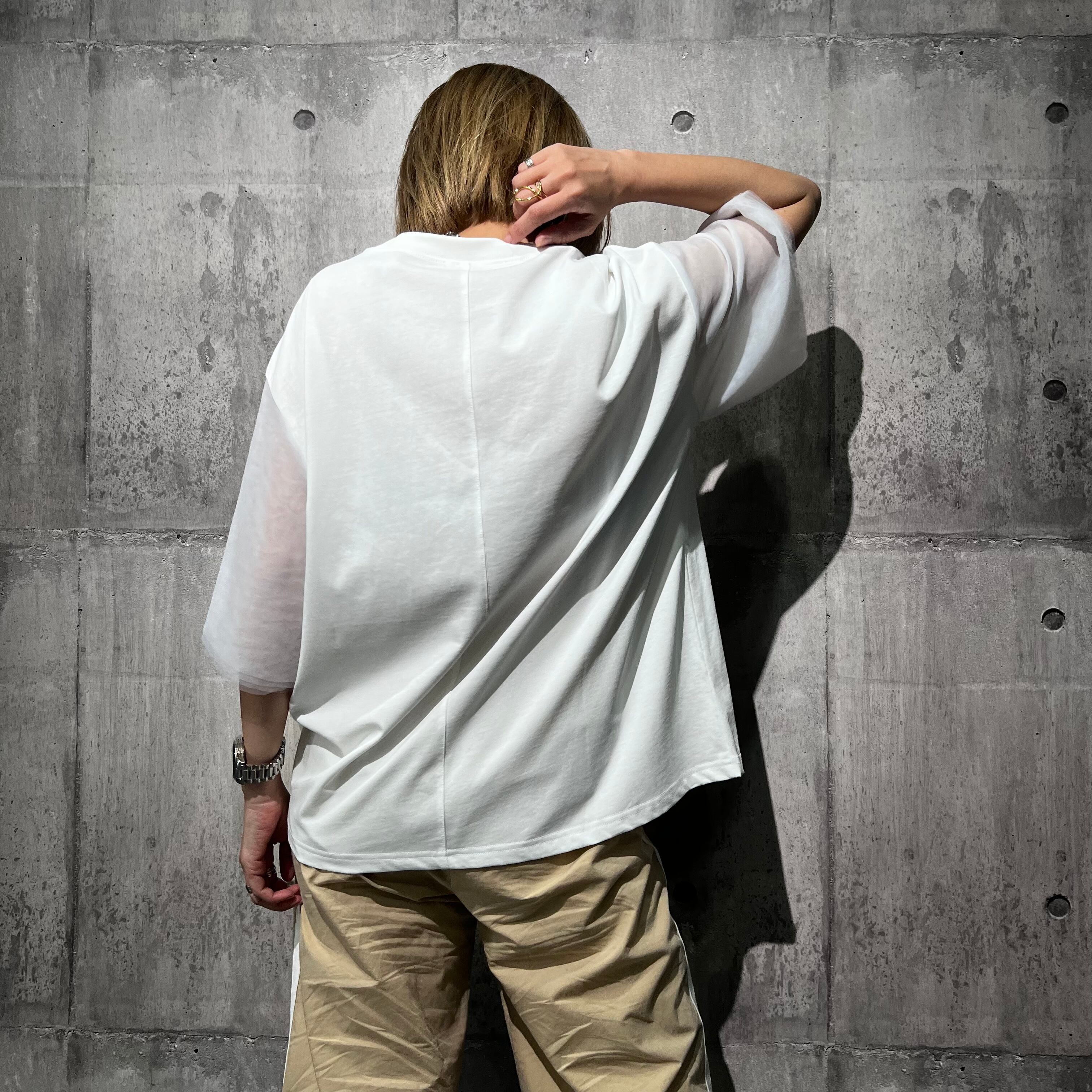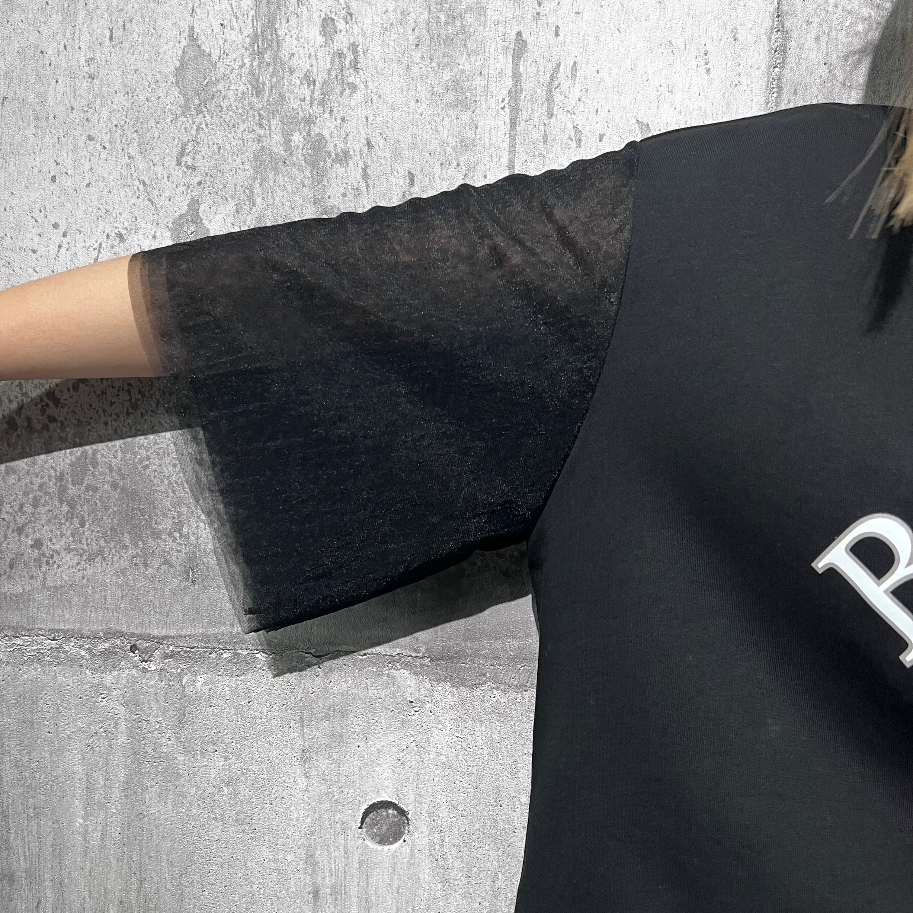 チュール生地を4重に重ねたスリーブが魅力的なロゴTシャツ。