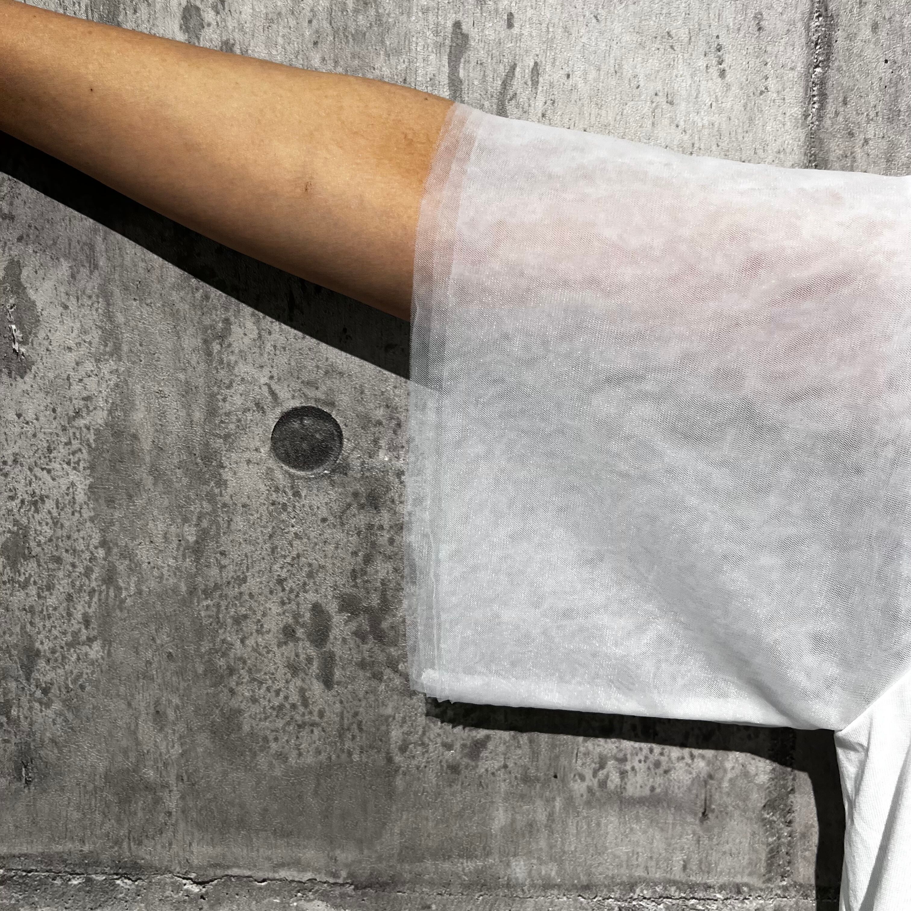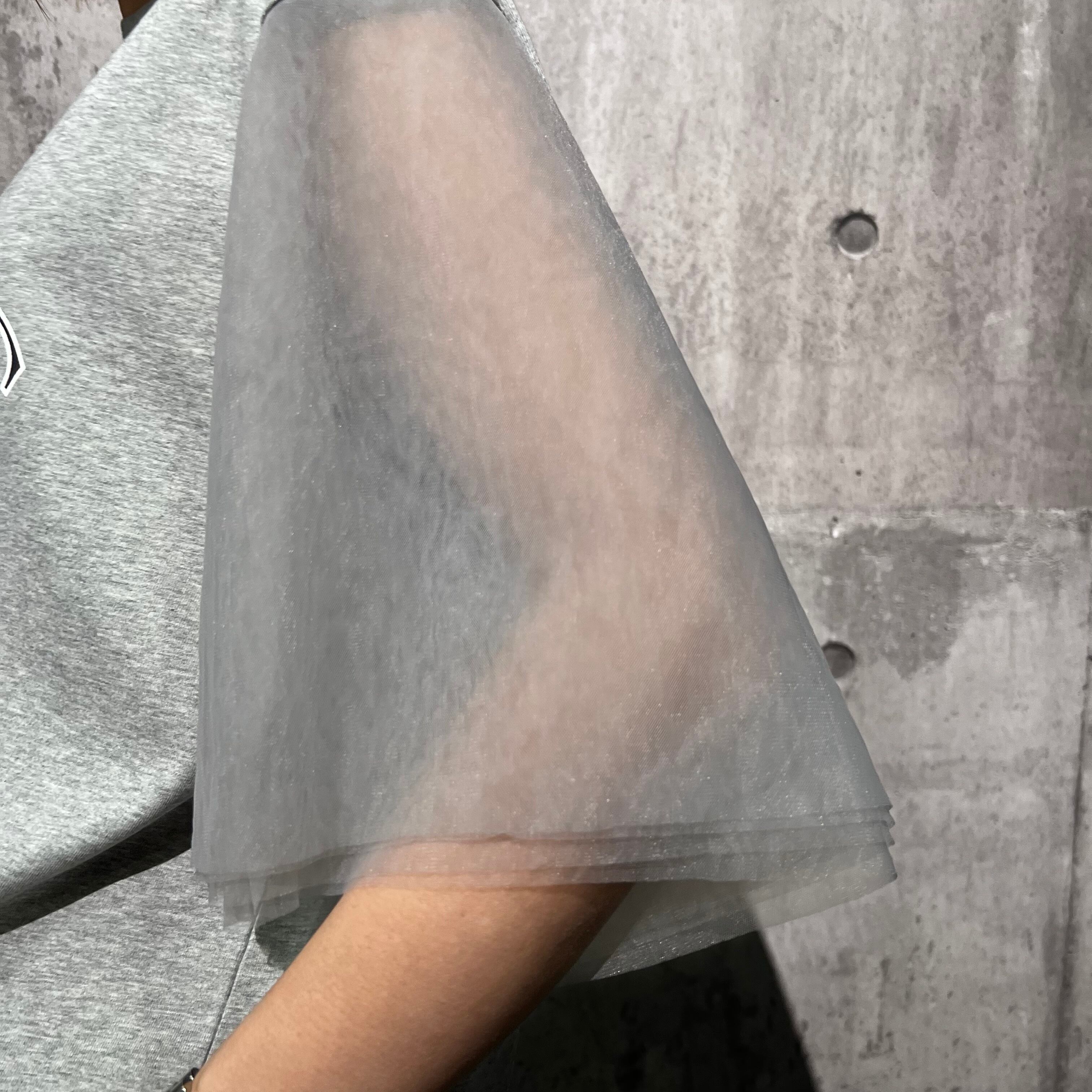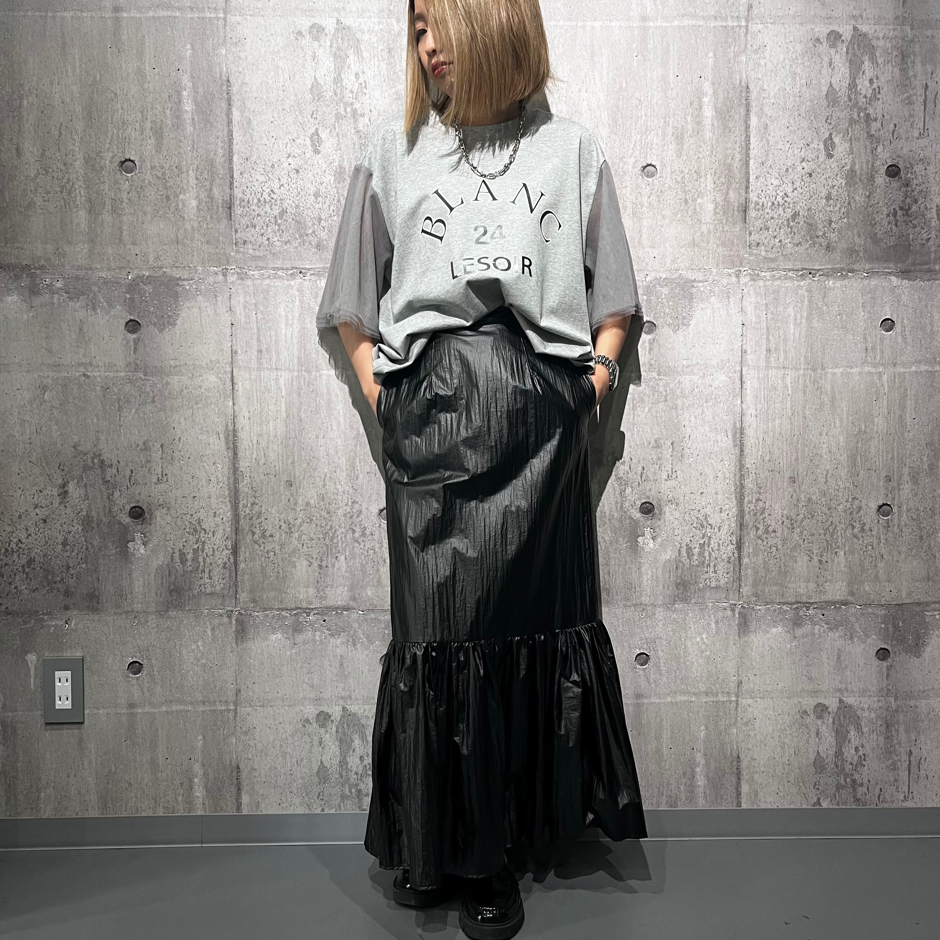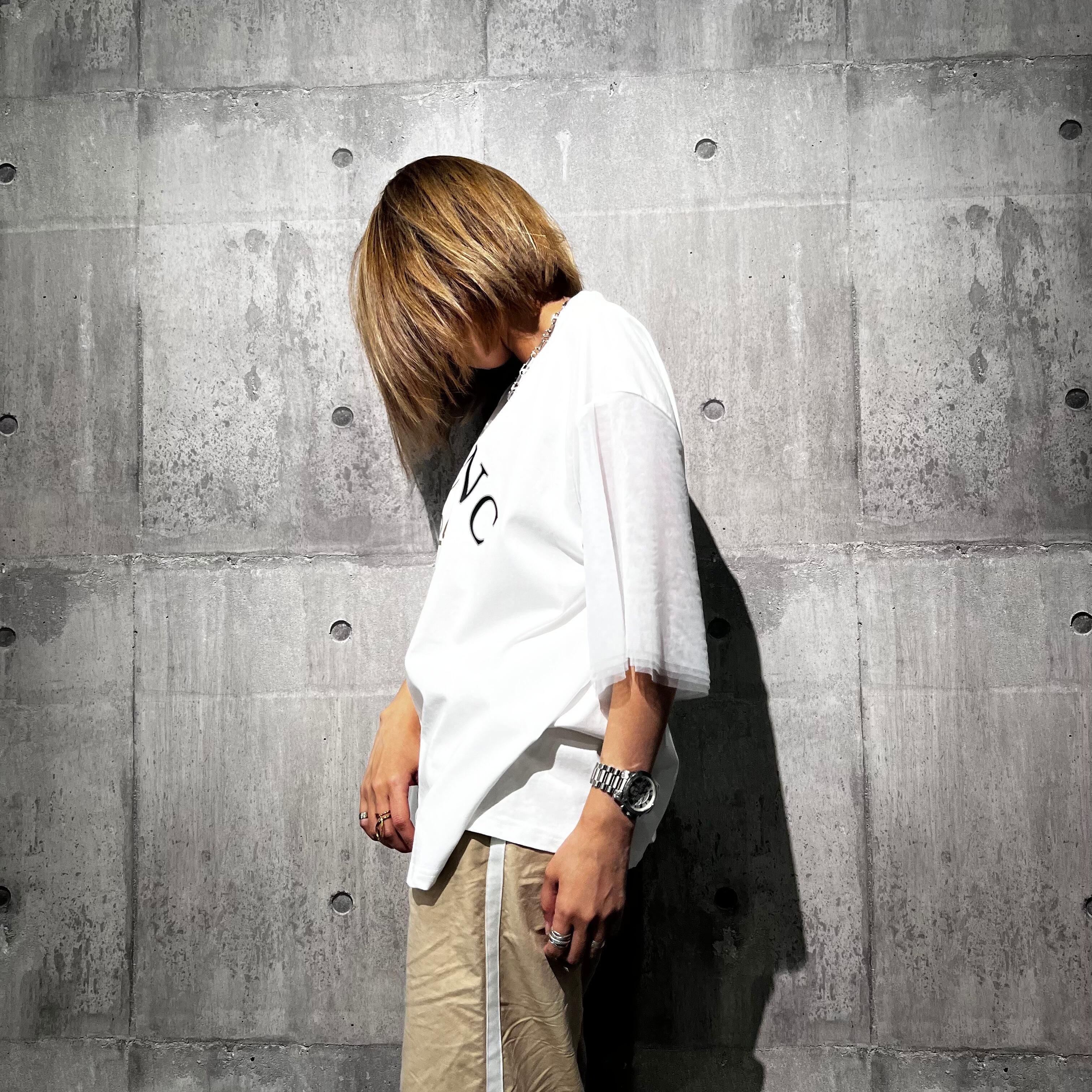 チュール生地を4重に重ねたスリーブが魅力的なロゴTシャツ。