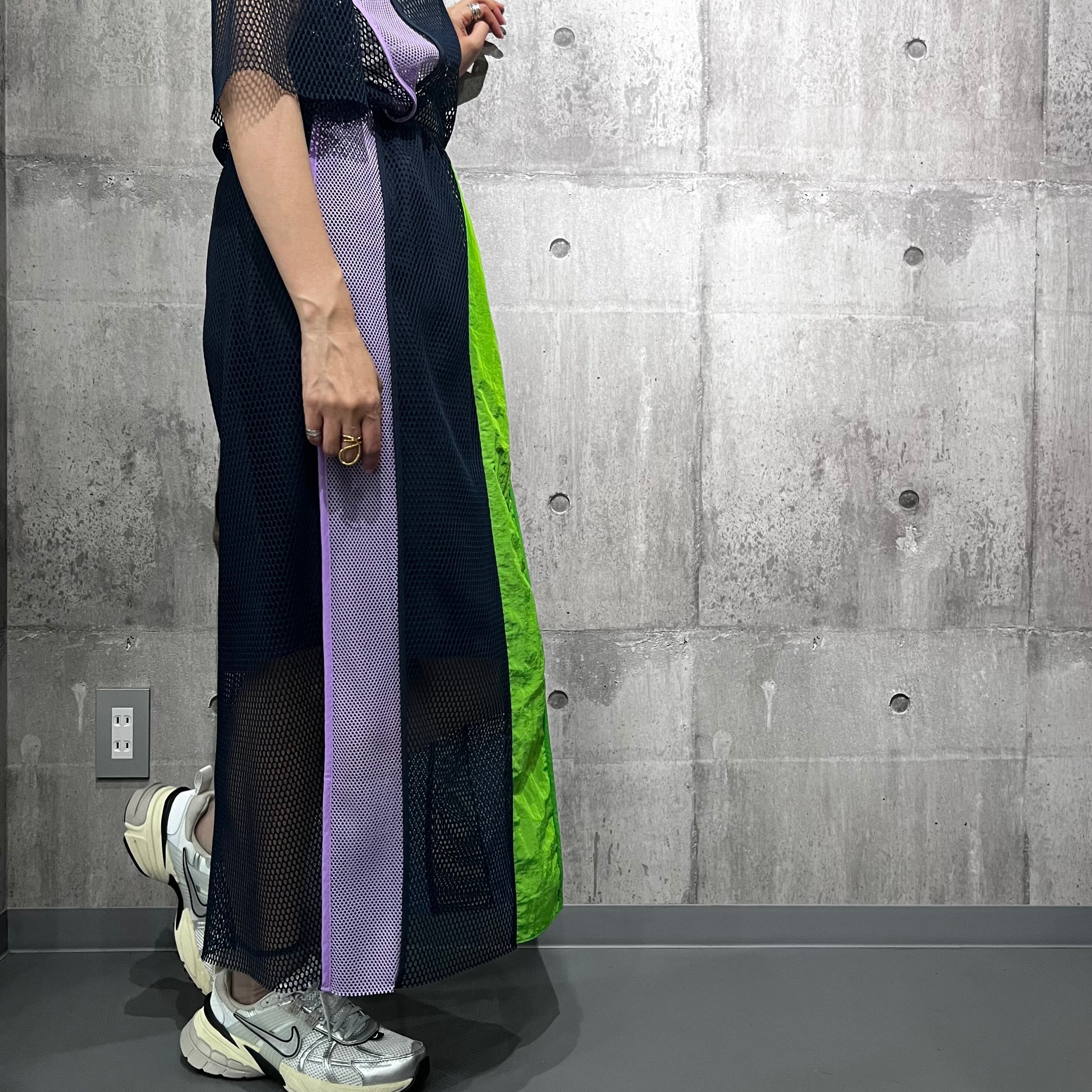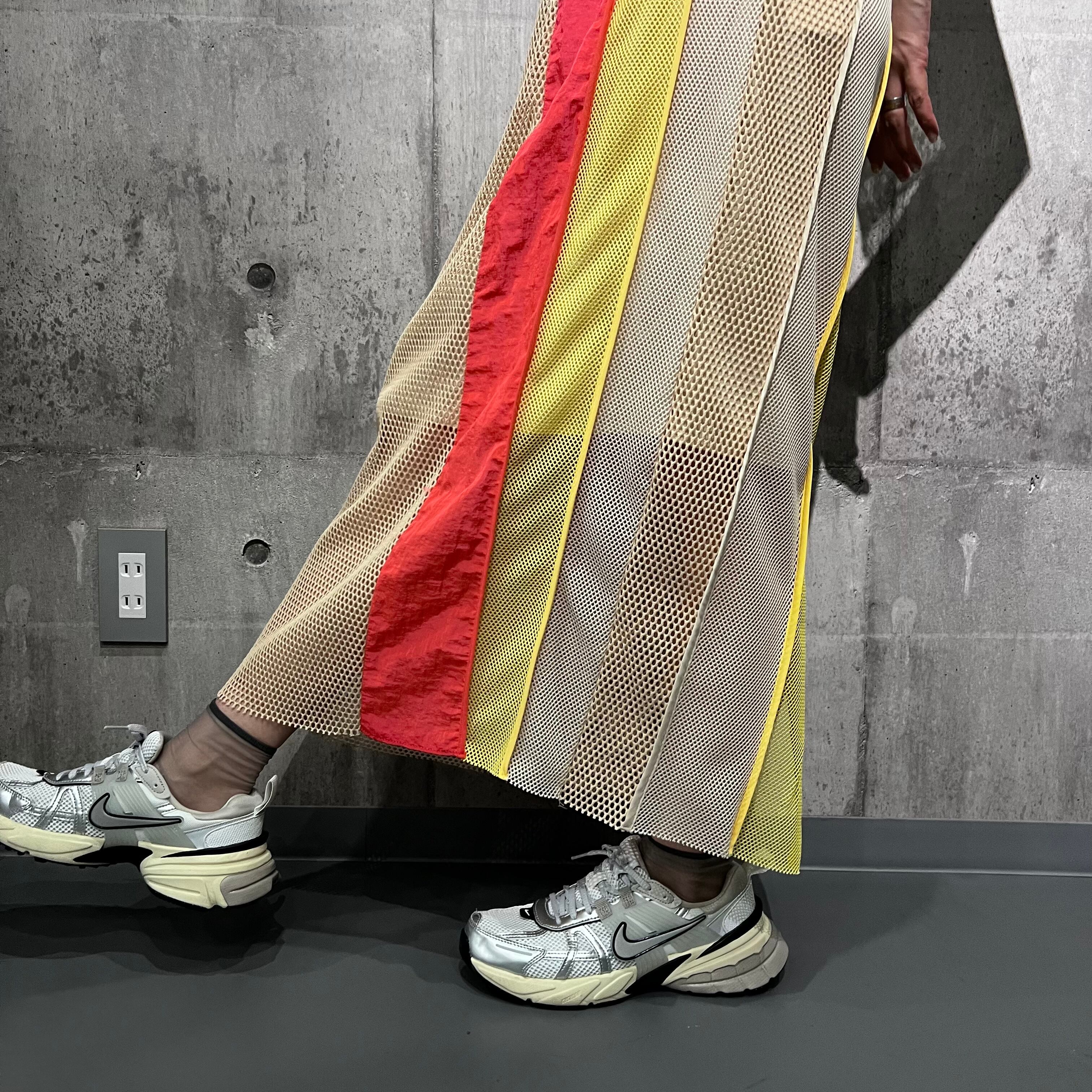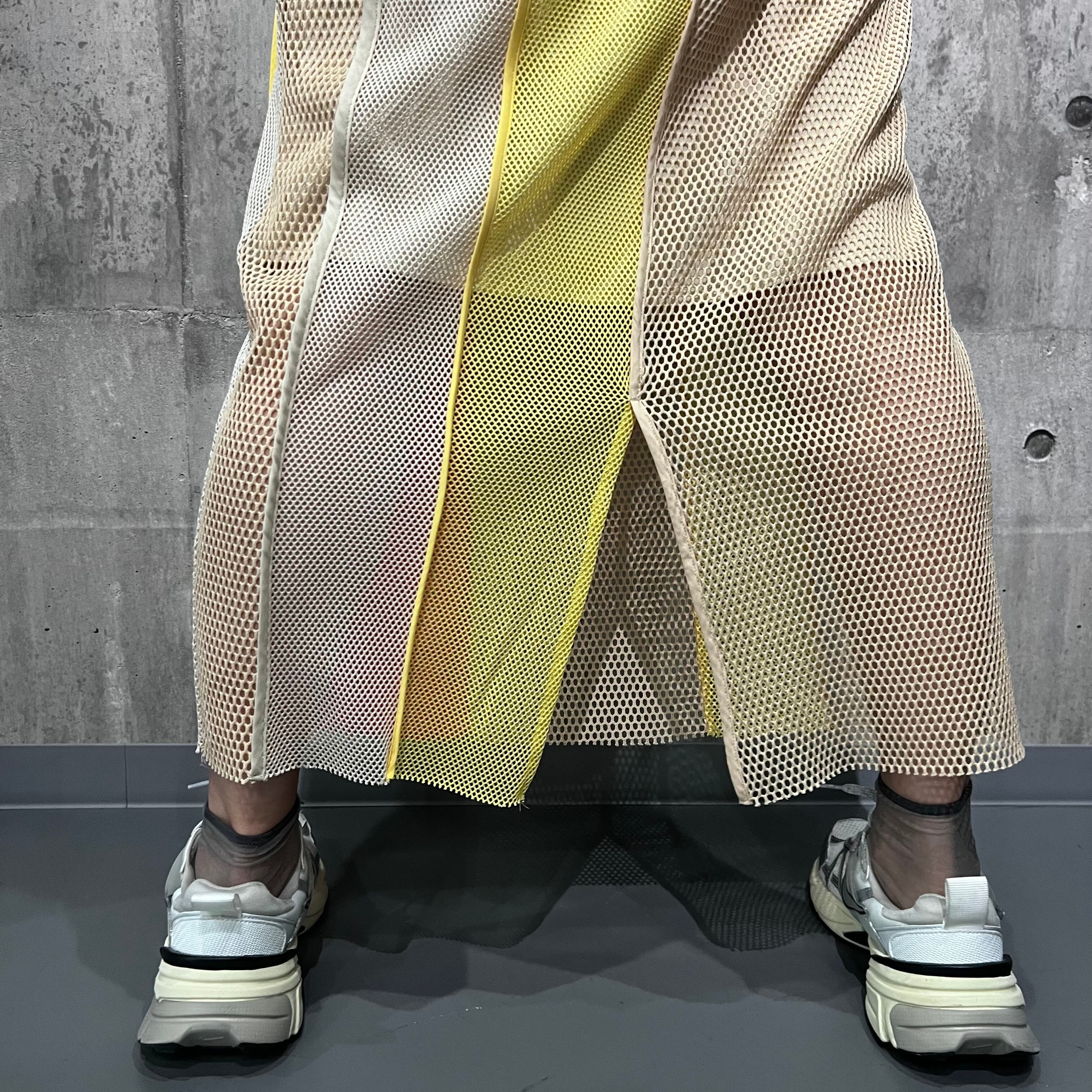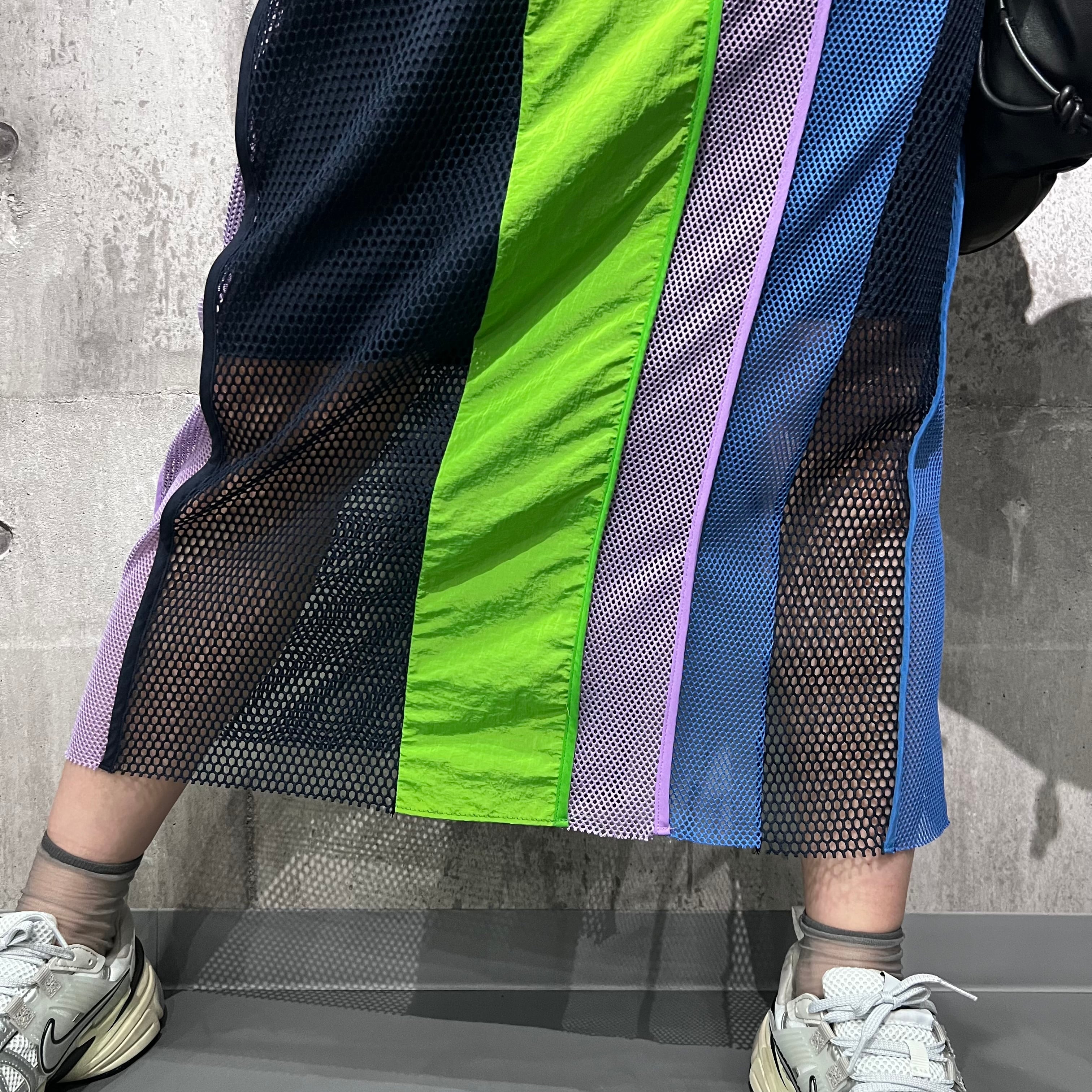 メッシュと生地の2種類の素材を使用した切り替えスカート。