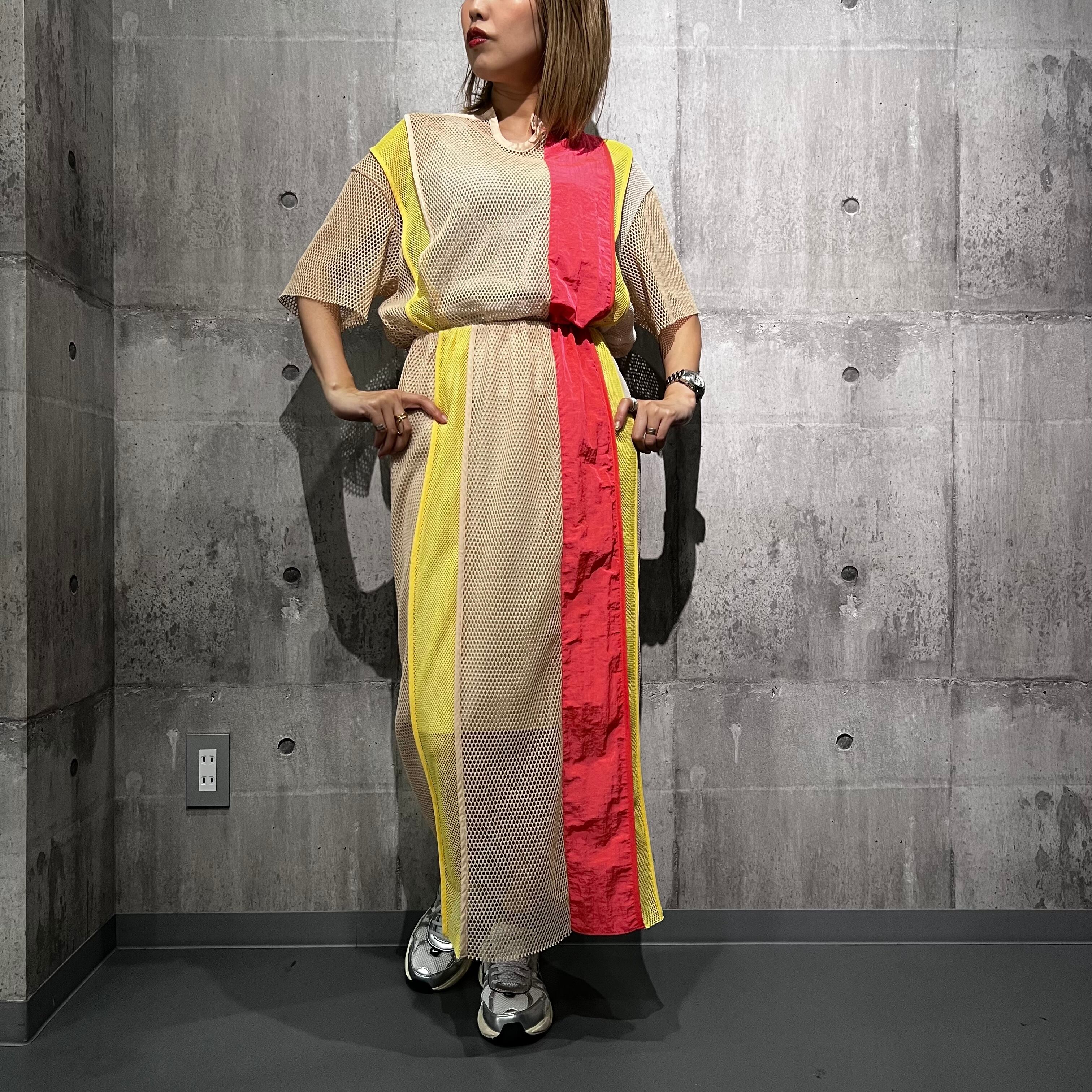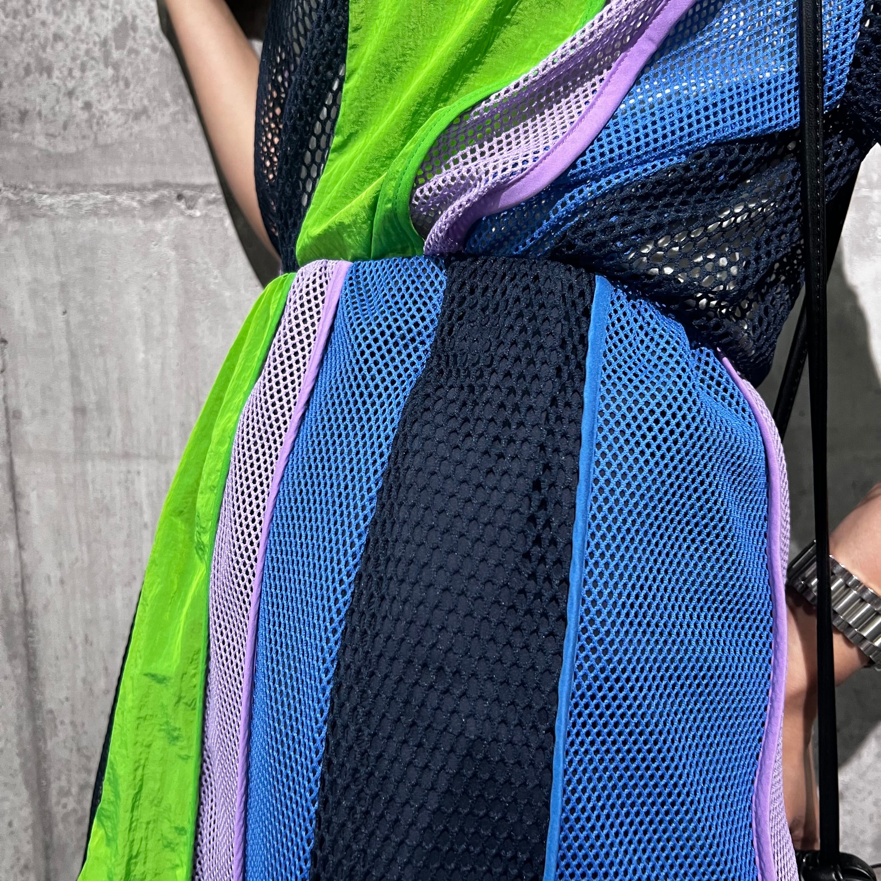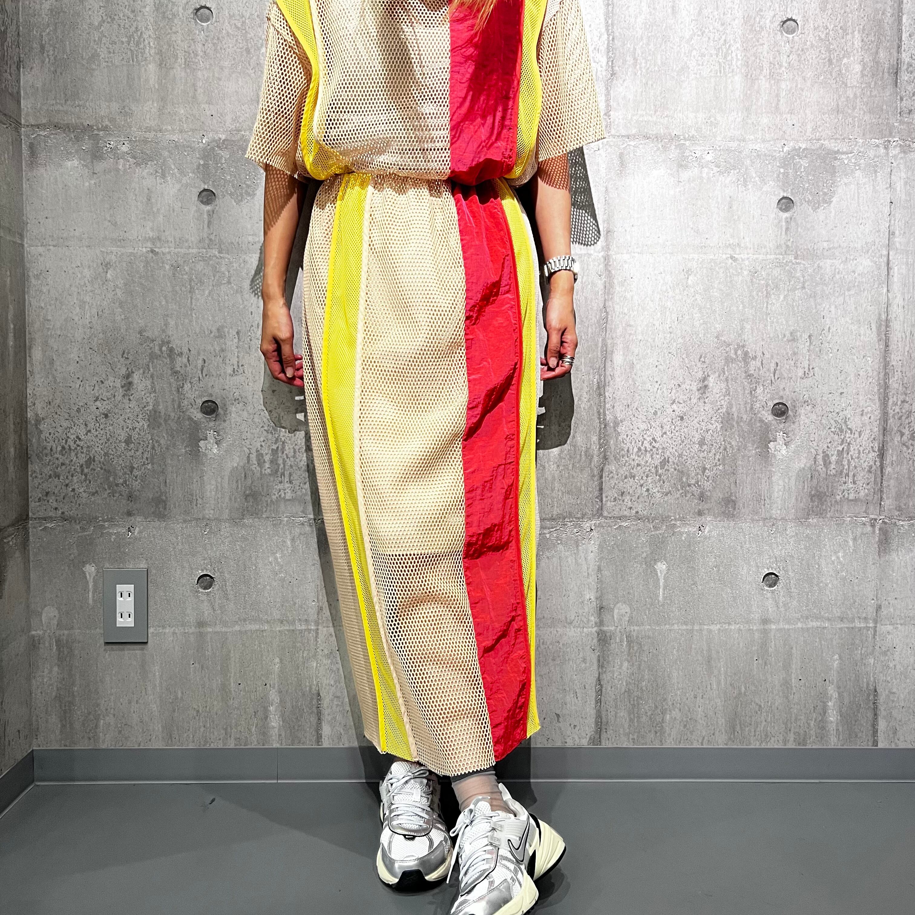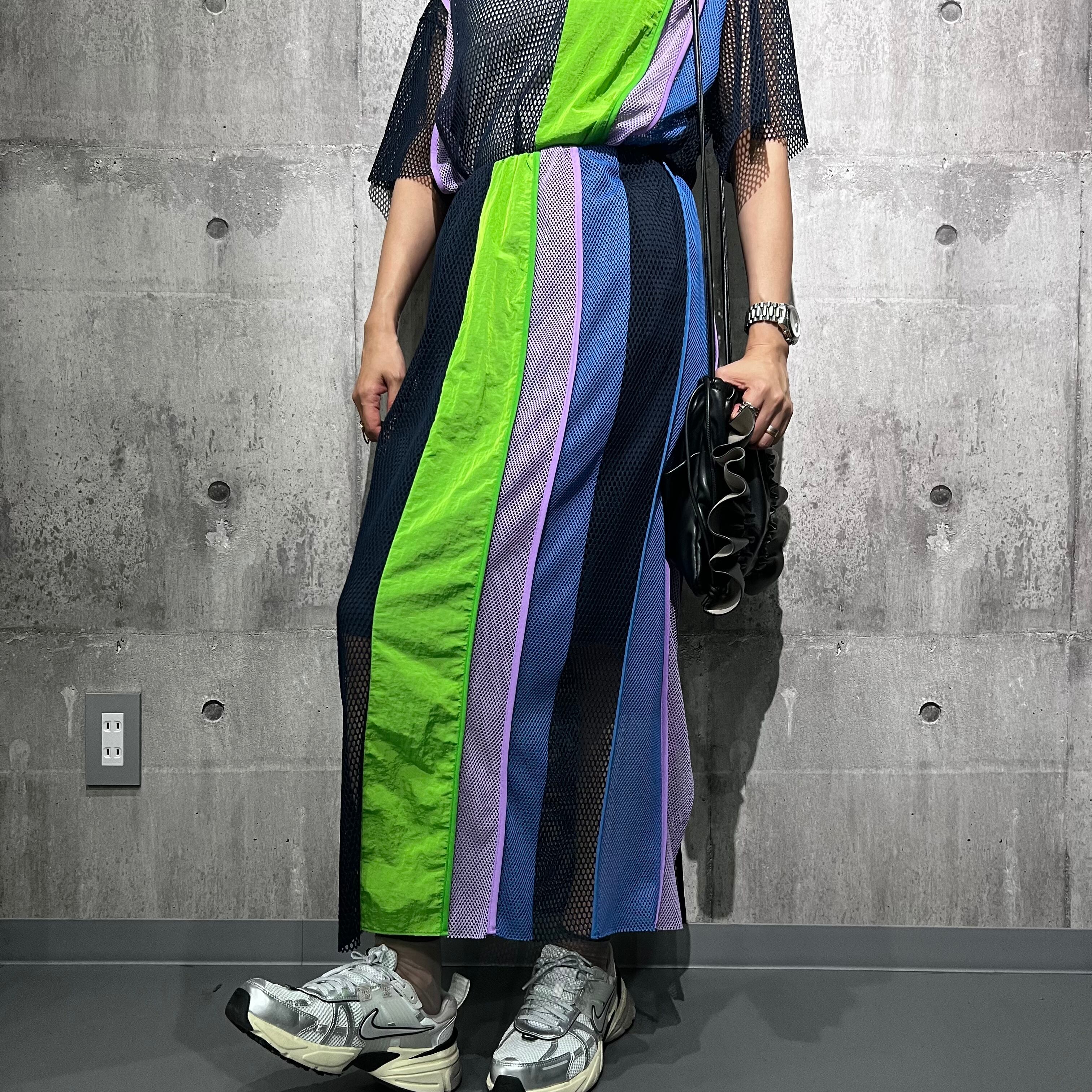 メッシュと生地の2種類の素材を使用した切り替えスカート。