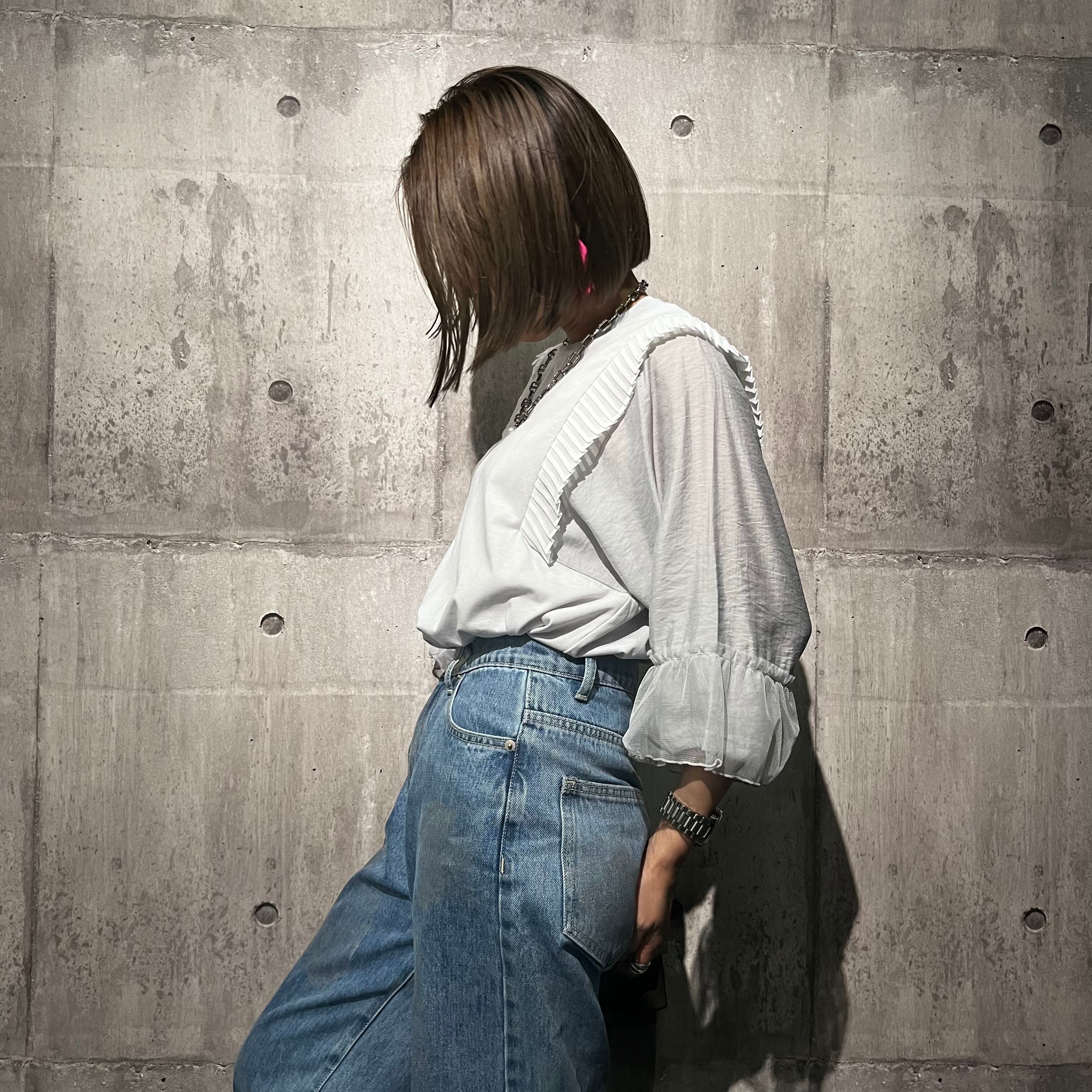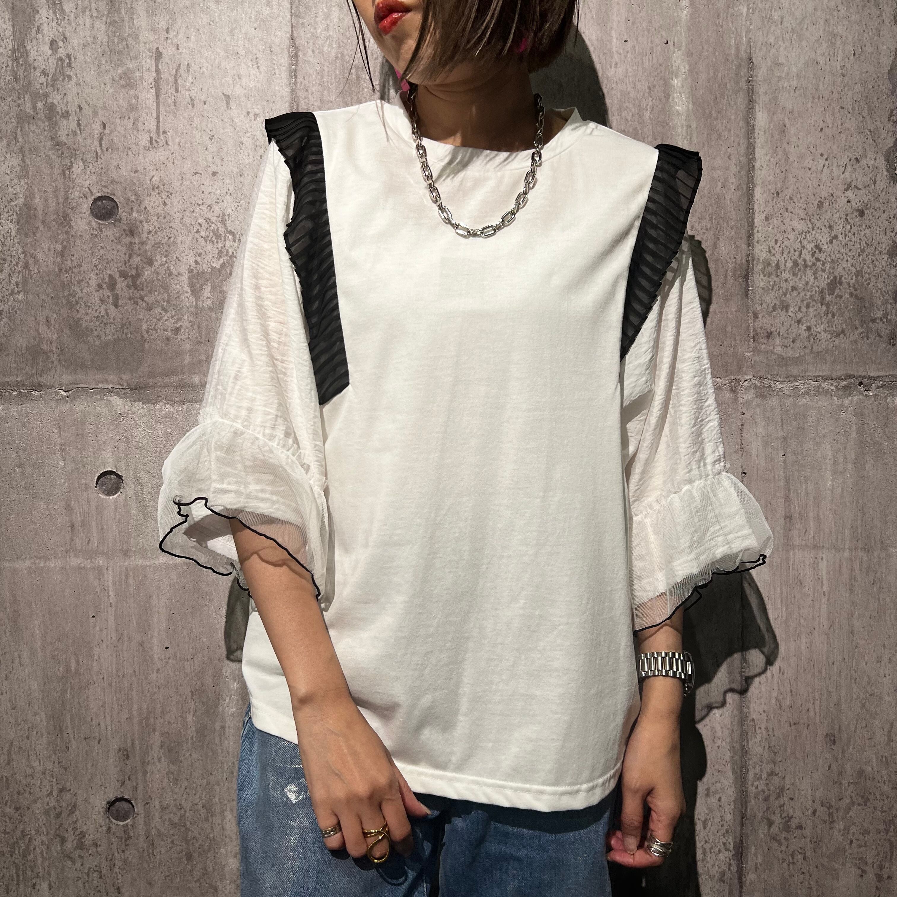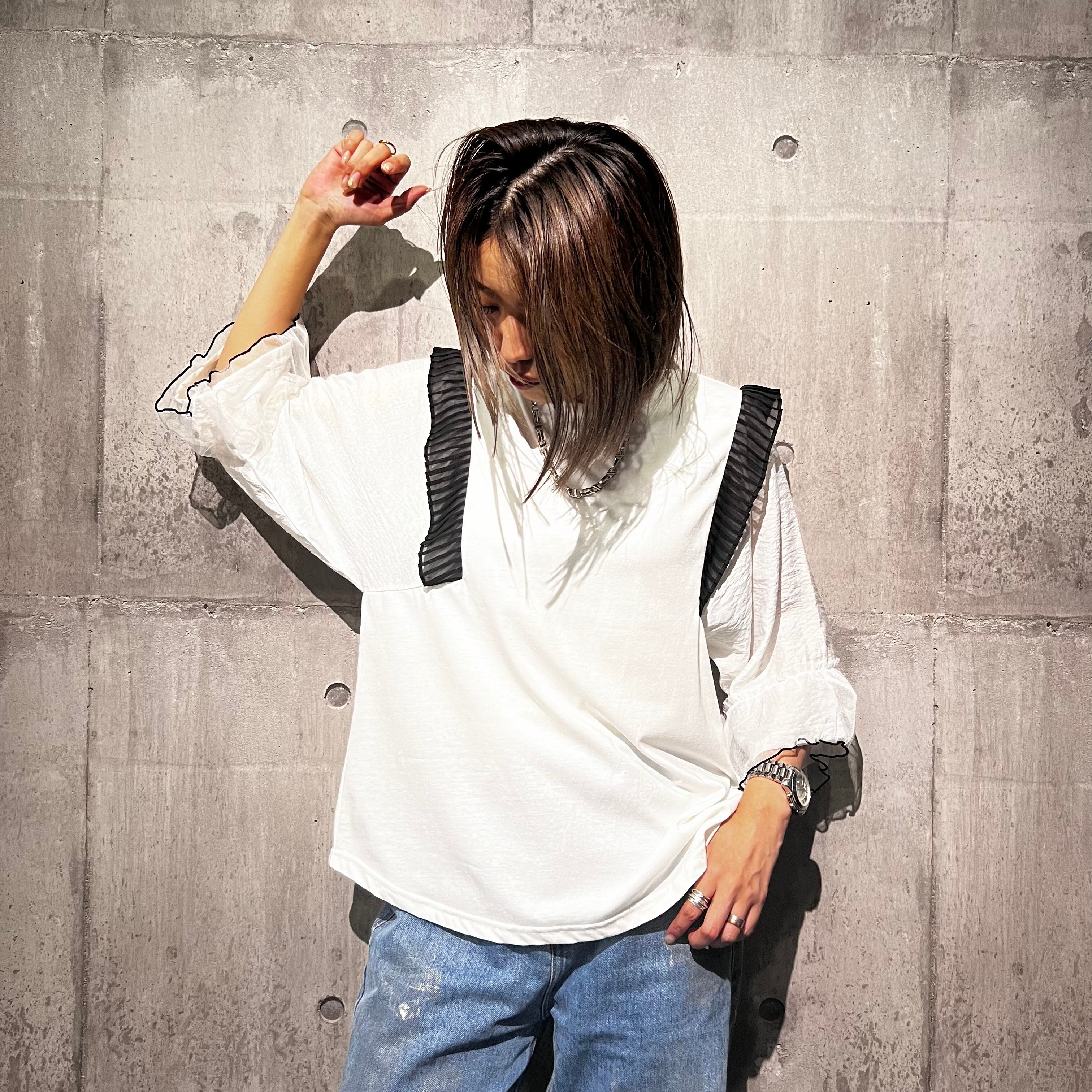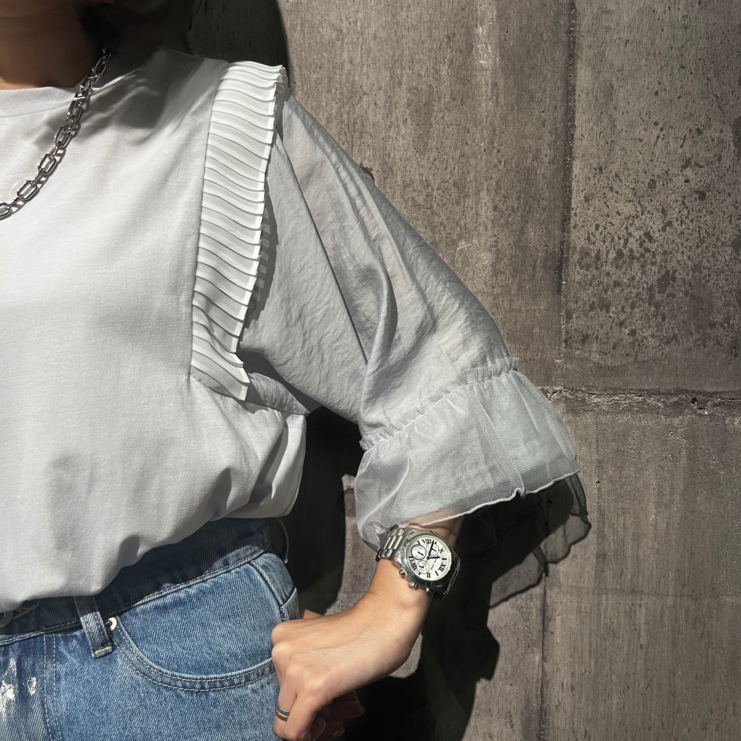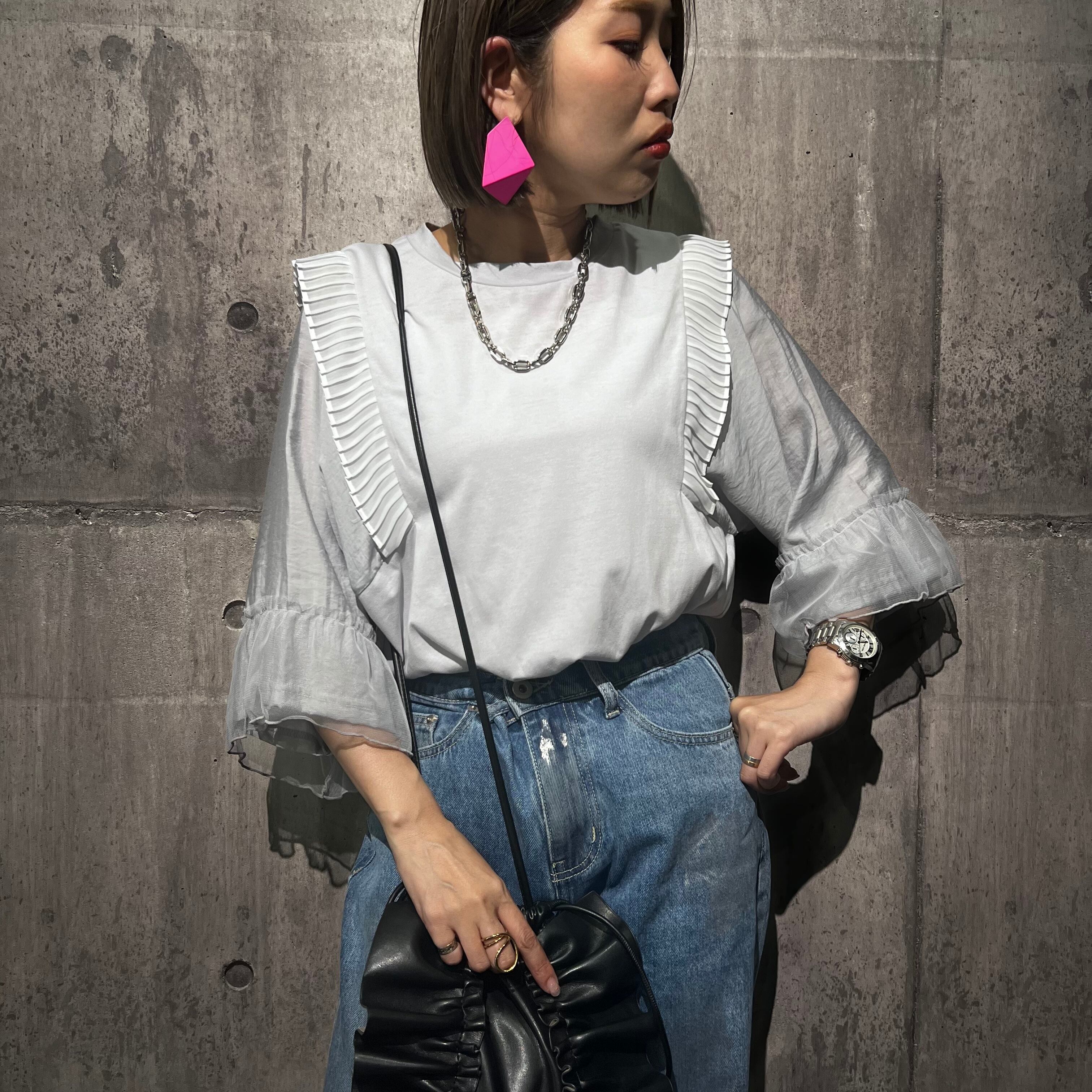 肩のプリーツディテールが可愛い、Tシャツ感覚で着れるデザイントップス。