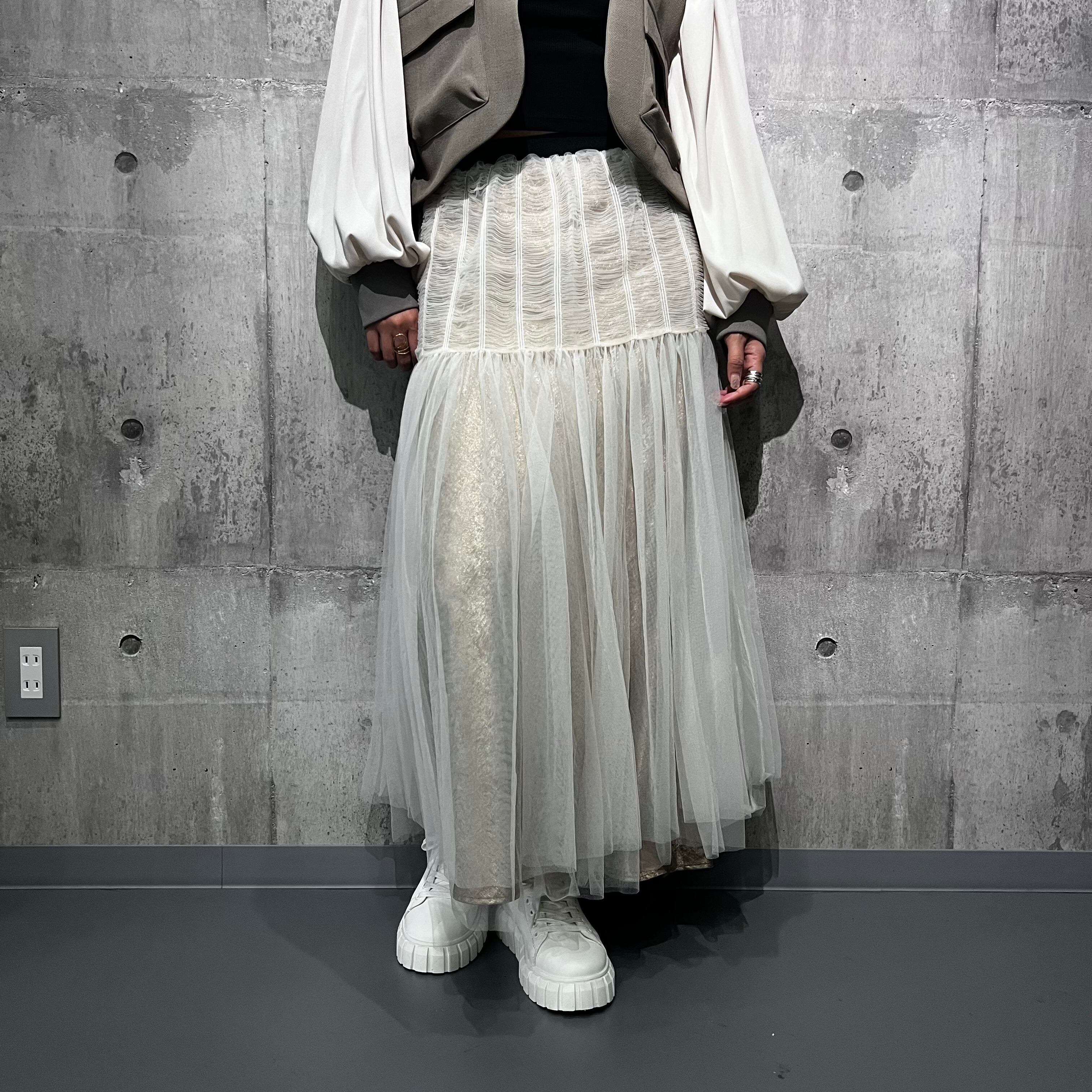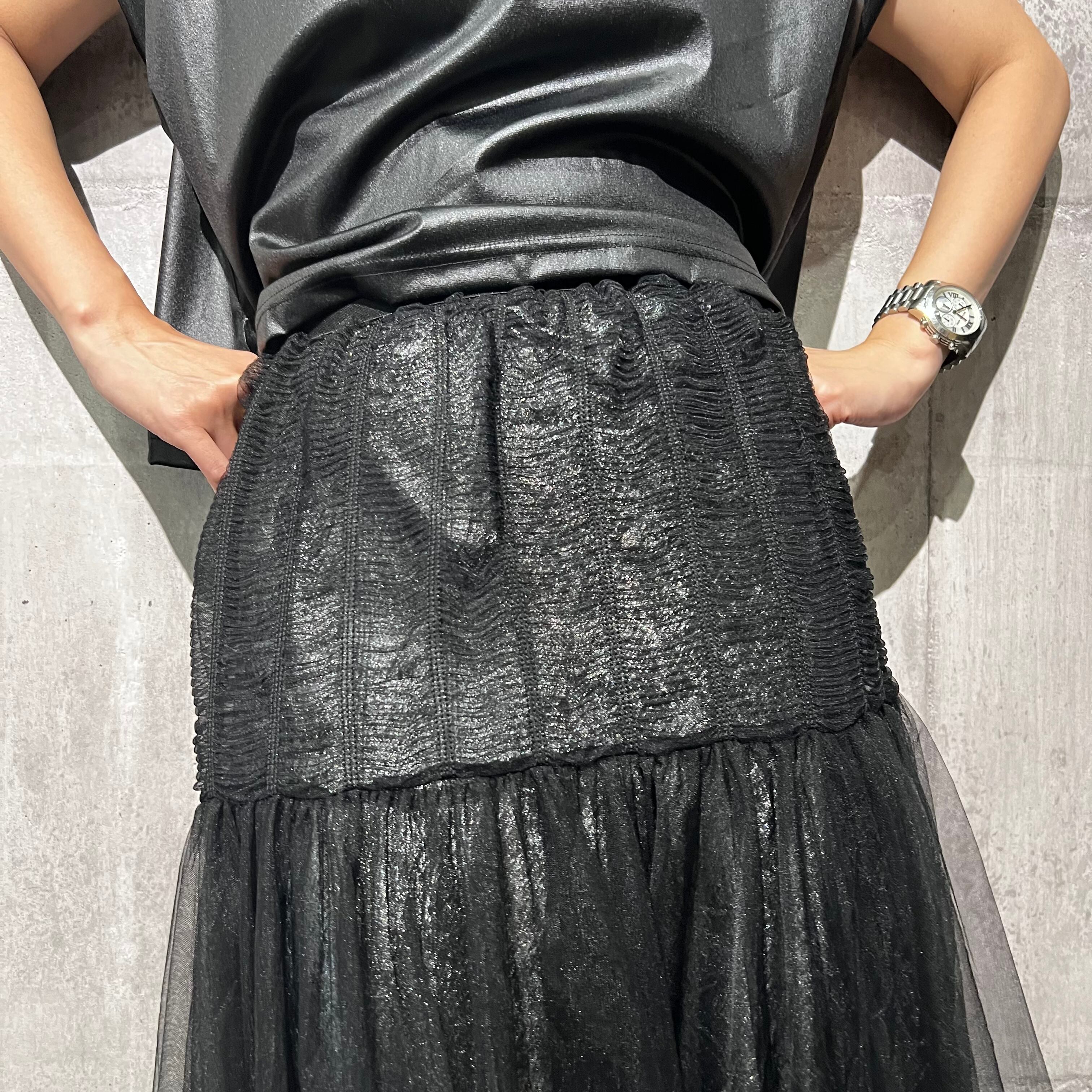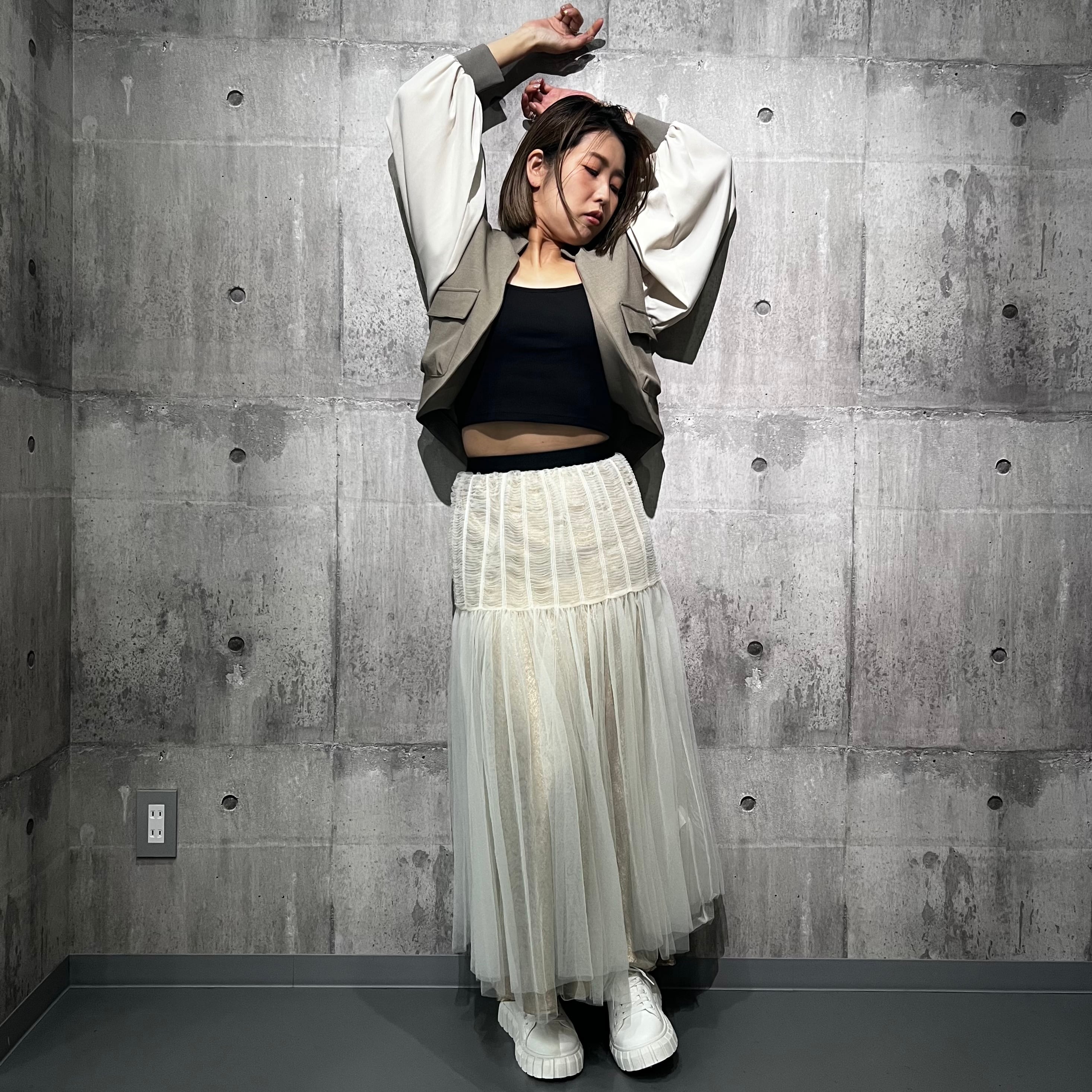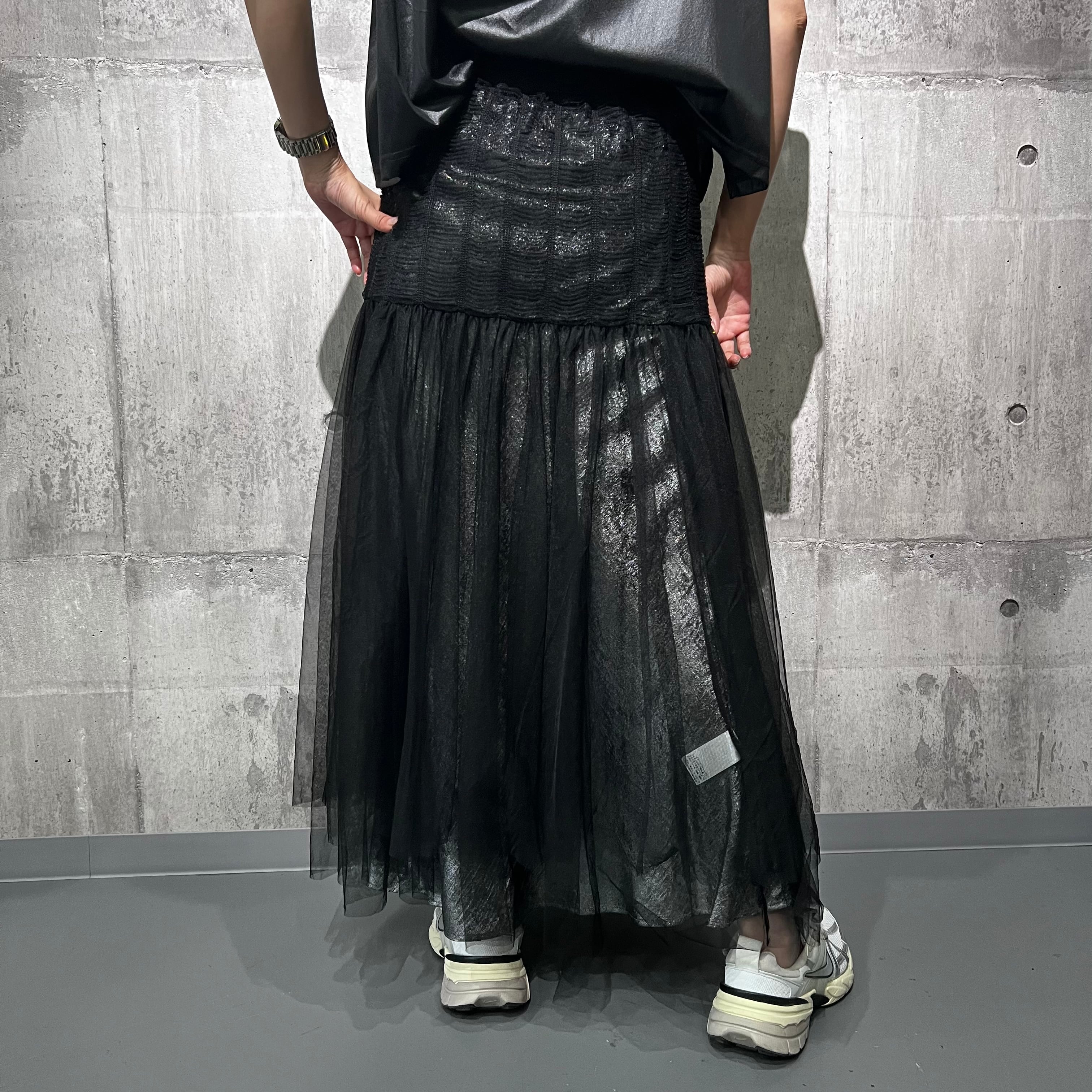 張り感あるナイロンチュール素材にシャーリング加工をほどこし、ウエストからヒップにかけて程よいフィット感を演出したスカート。