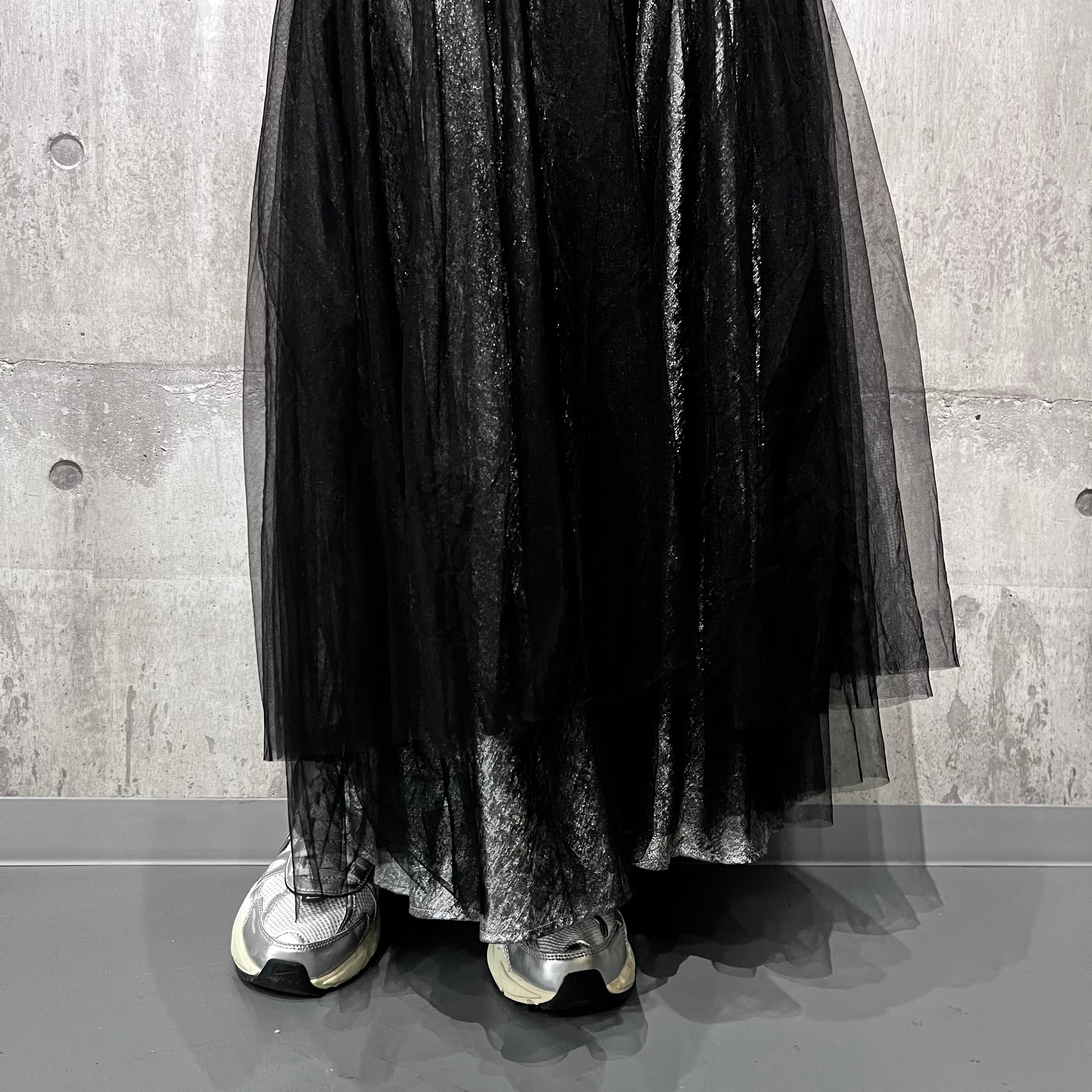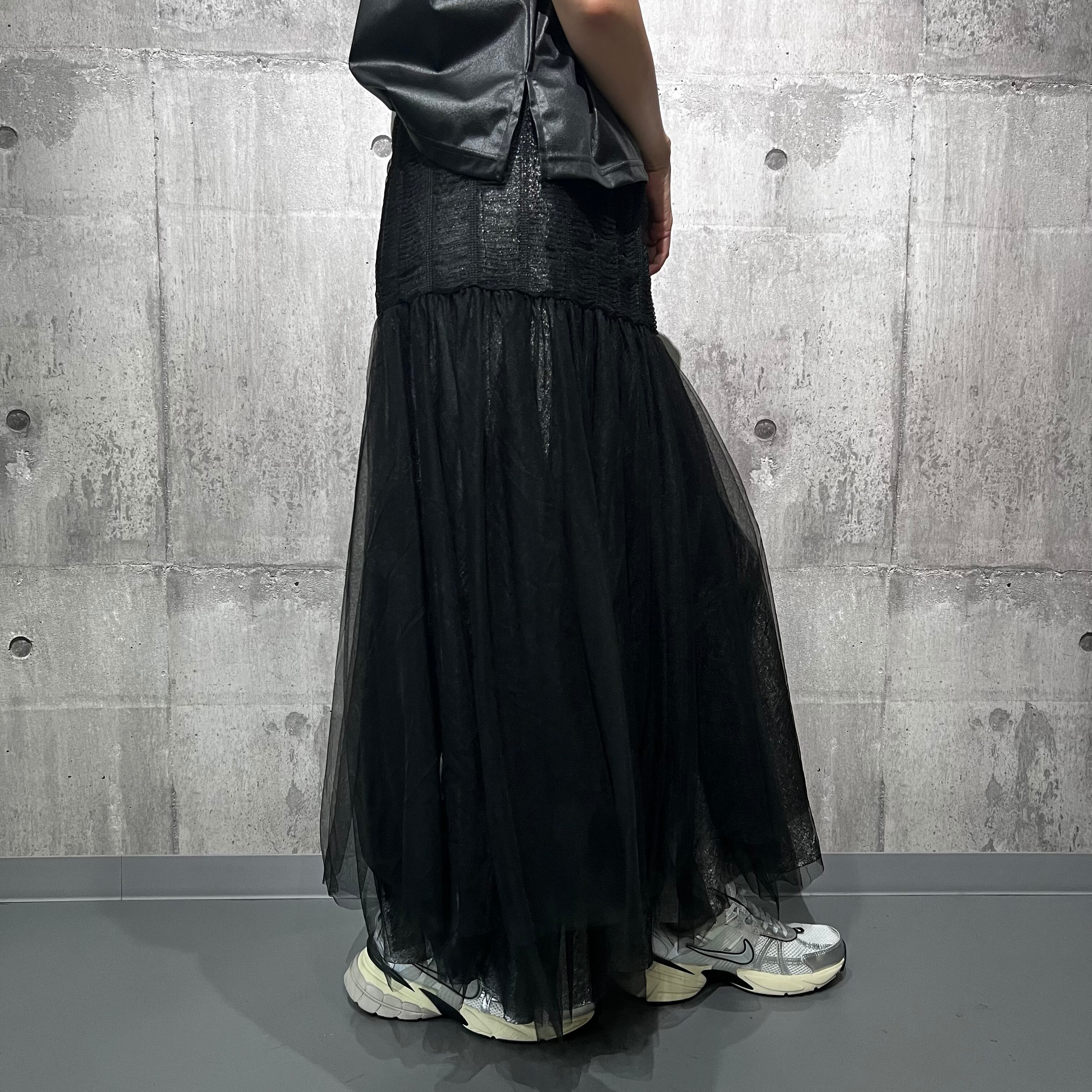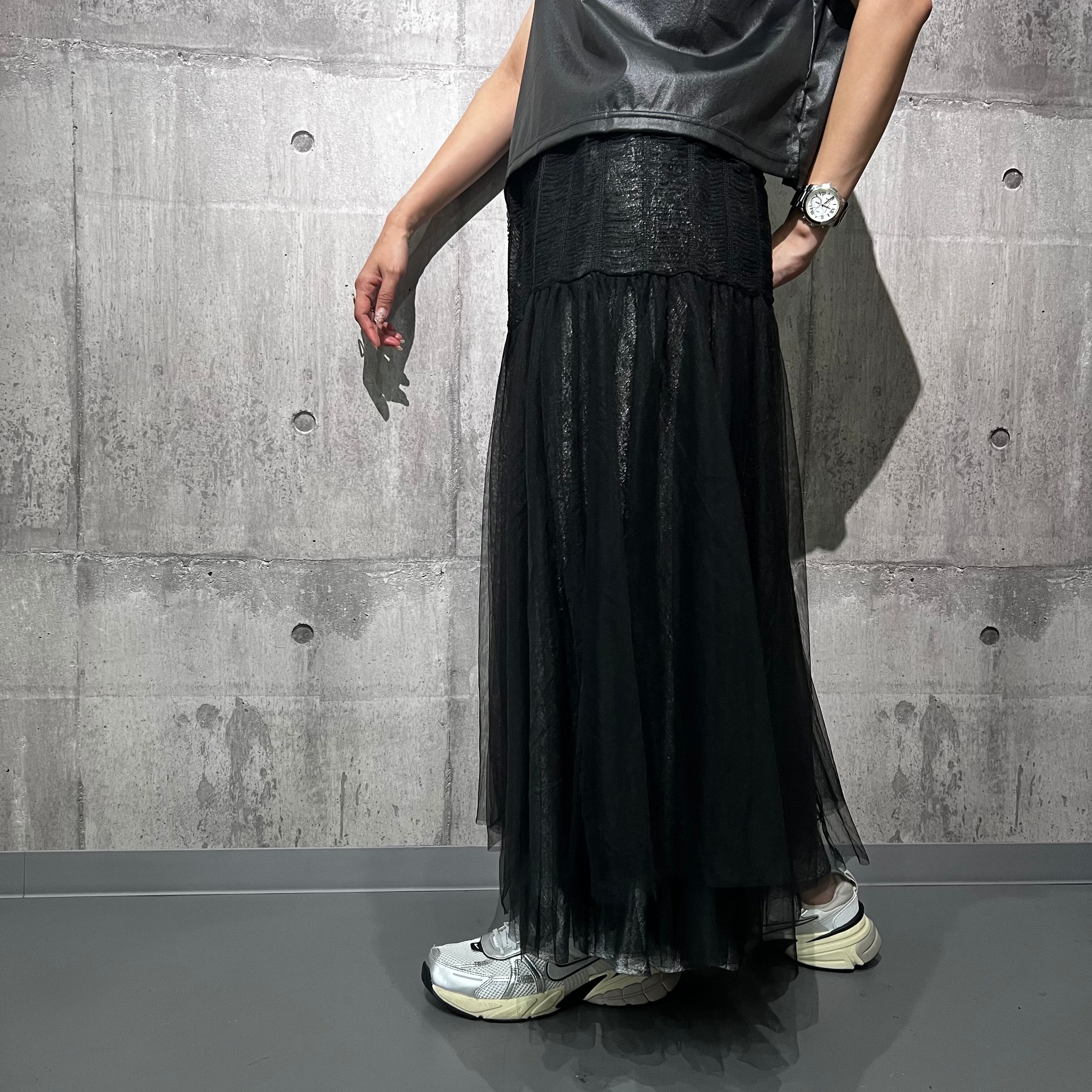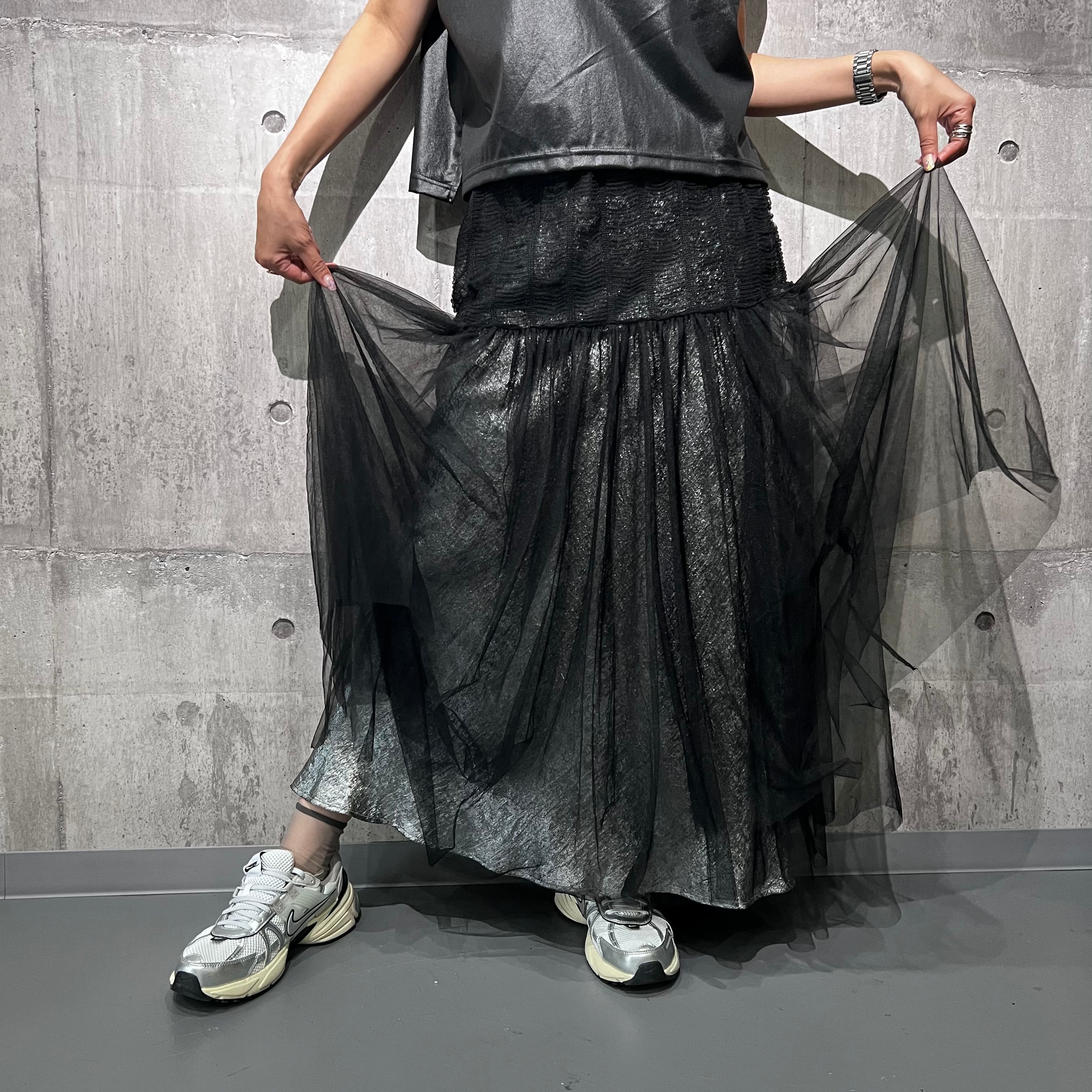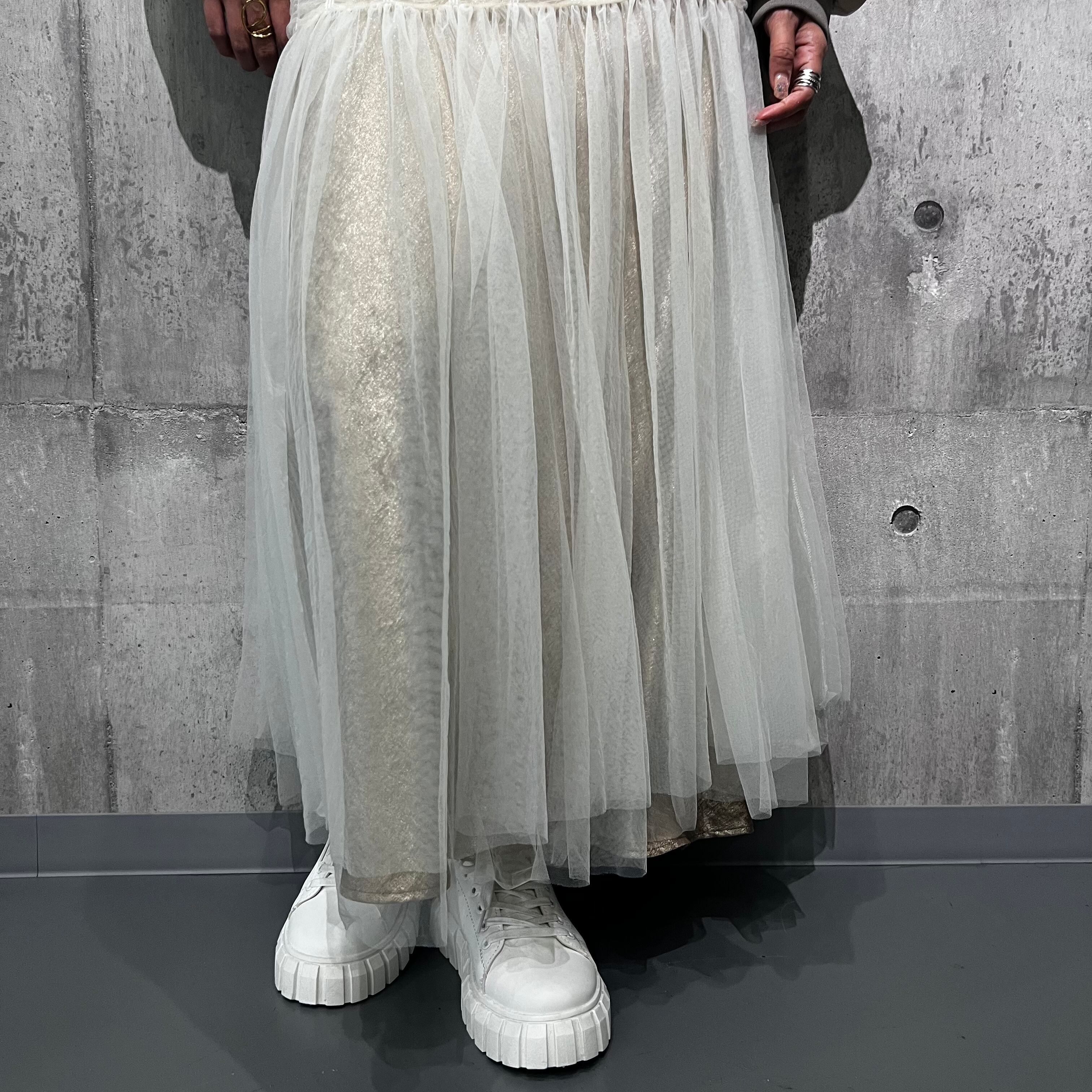 張り感あるナイロンチュール素材にシャーリング加工をほどこし、ウエストからヒップにかけて程よいフィット感を演出したスカート。