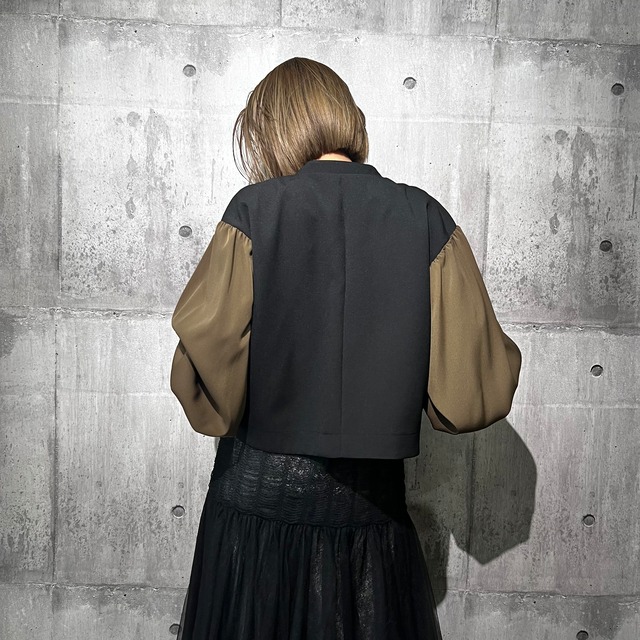 ふんわりとした2重織りポリエステルツイルとアンティークデシンで仕上げた軽やかでフォーマル感もあるジャケットです。