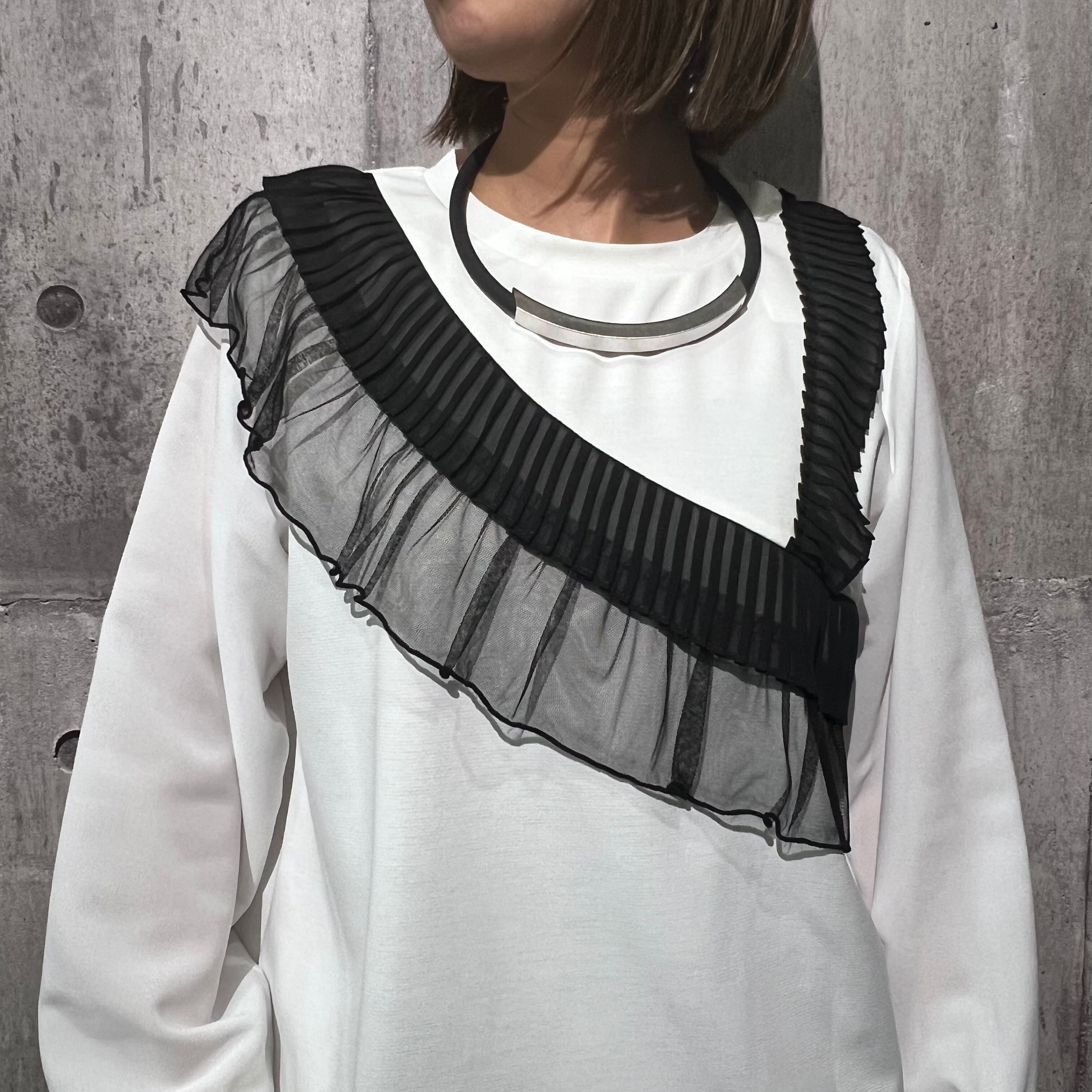 大胆なプリーツとチュールのフリルデザインが目を引く1着です。