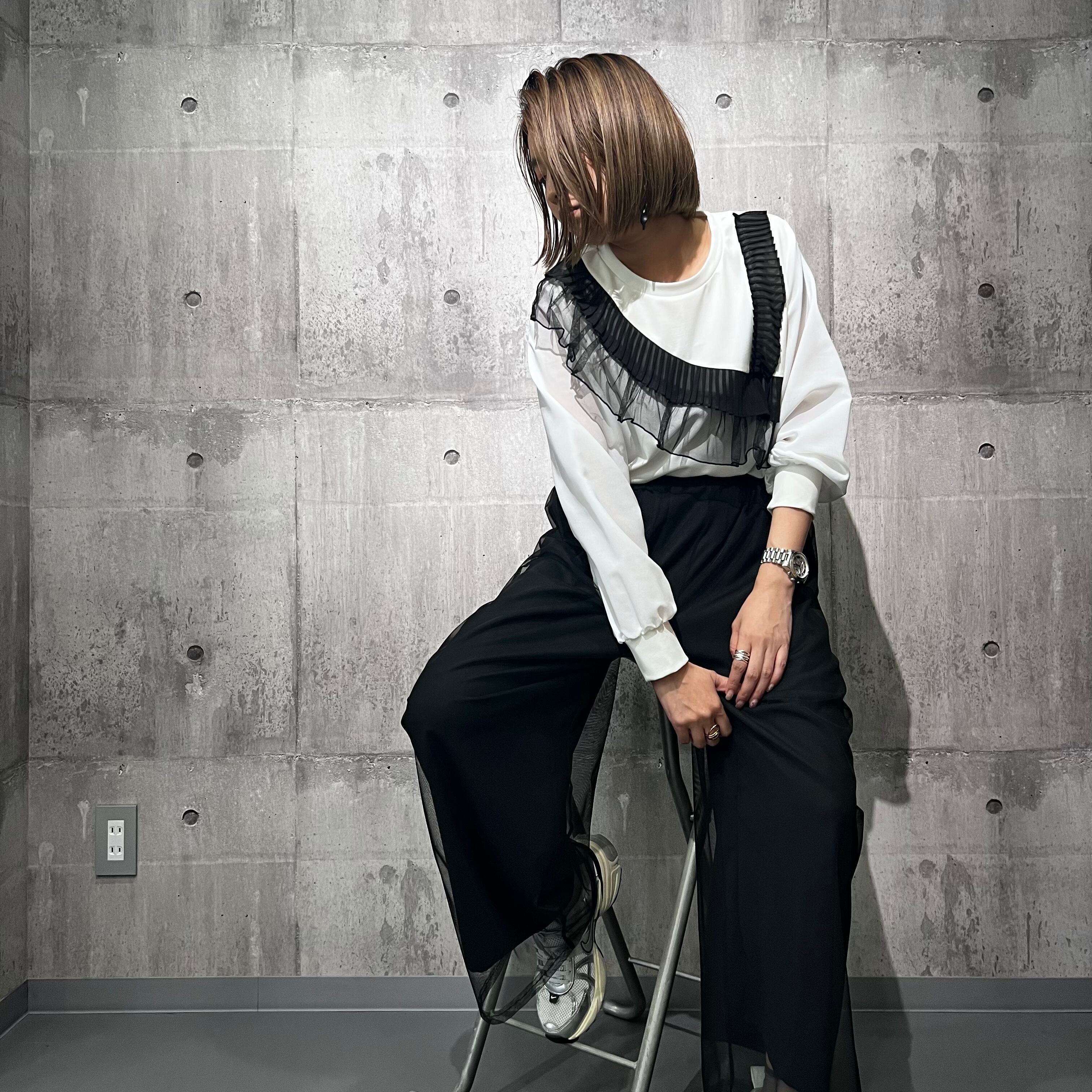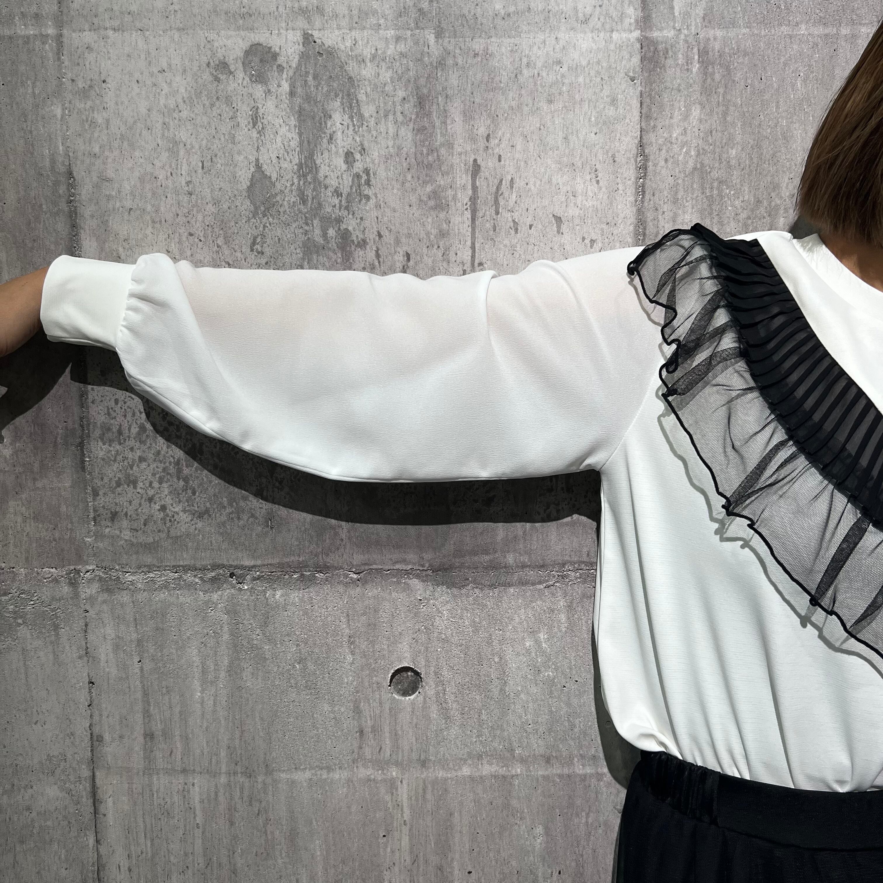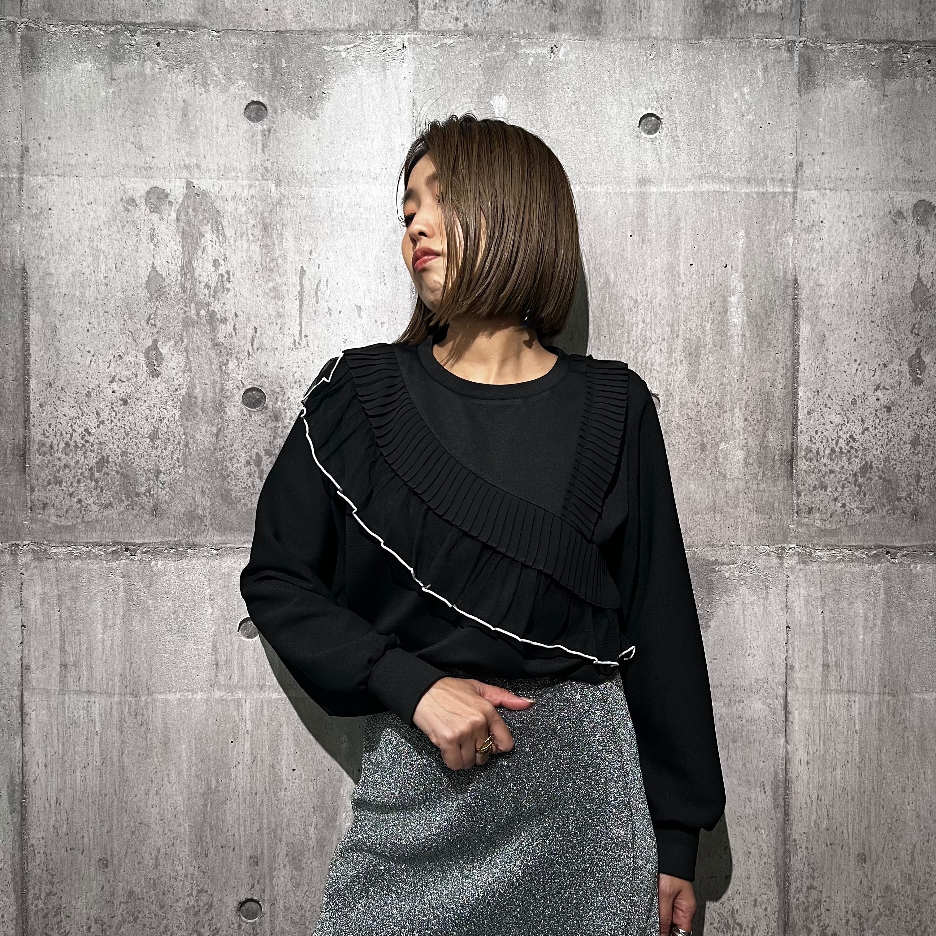 トレンドのアシメデザインをプリーツフリルで大人っぽく仕上げたデザイントップス。