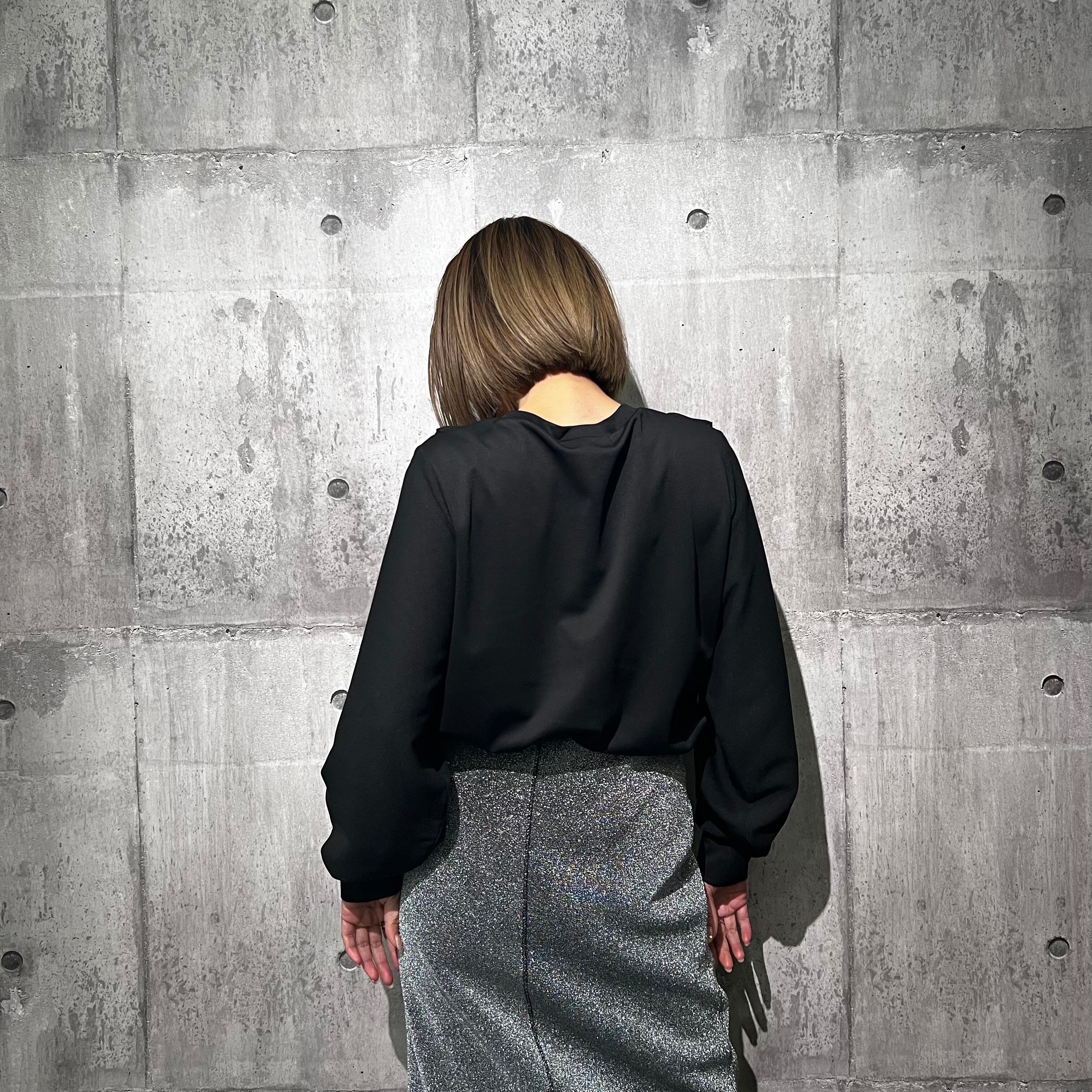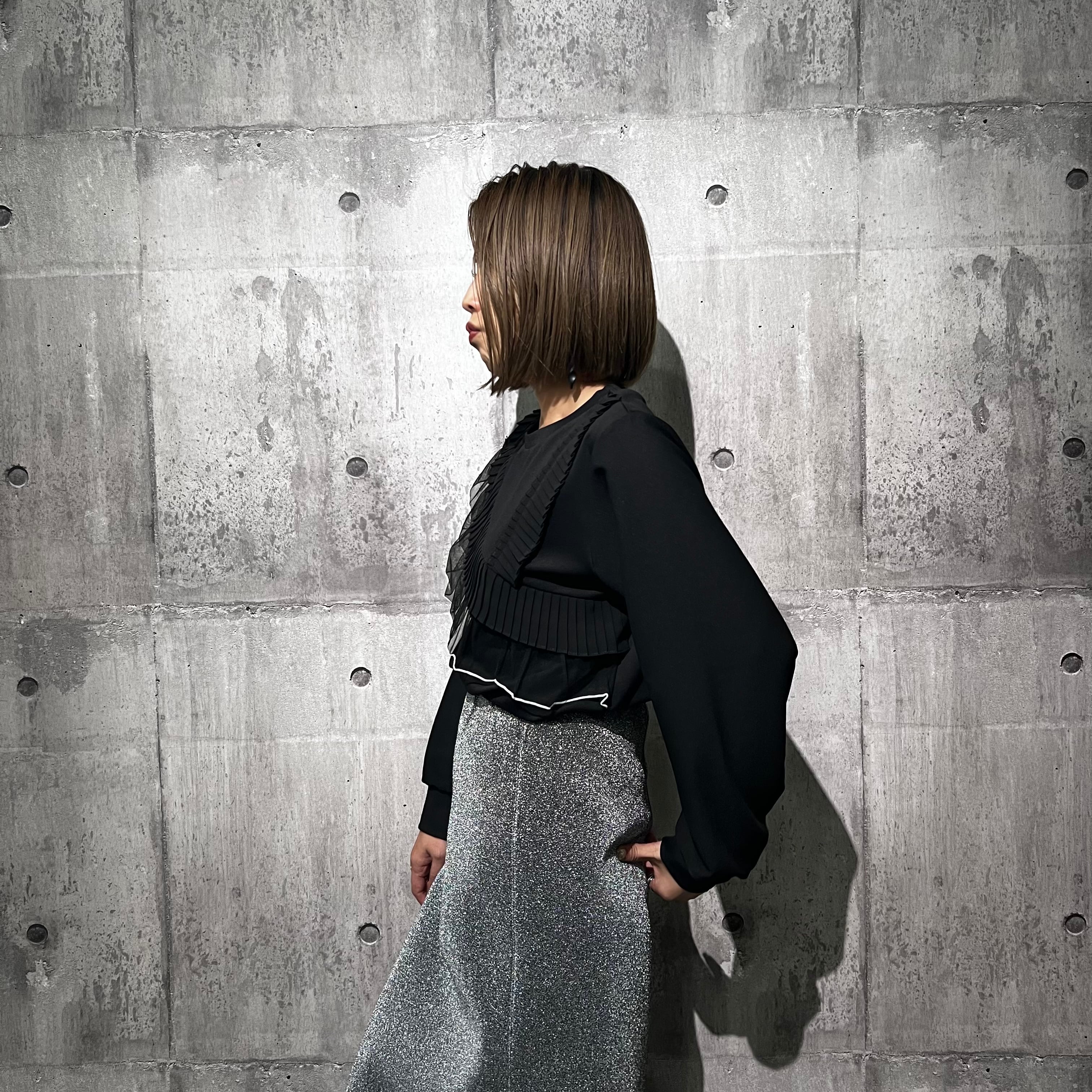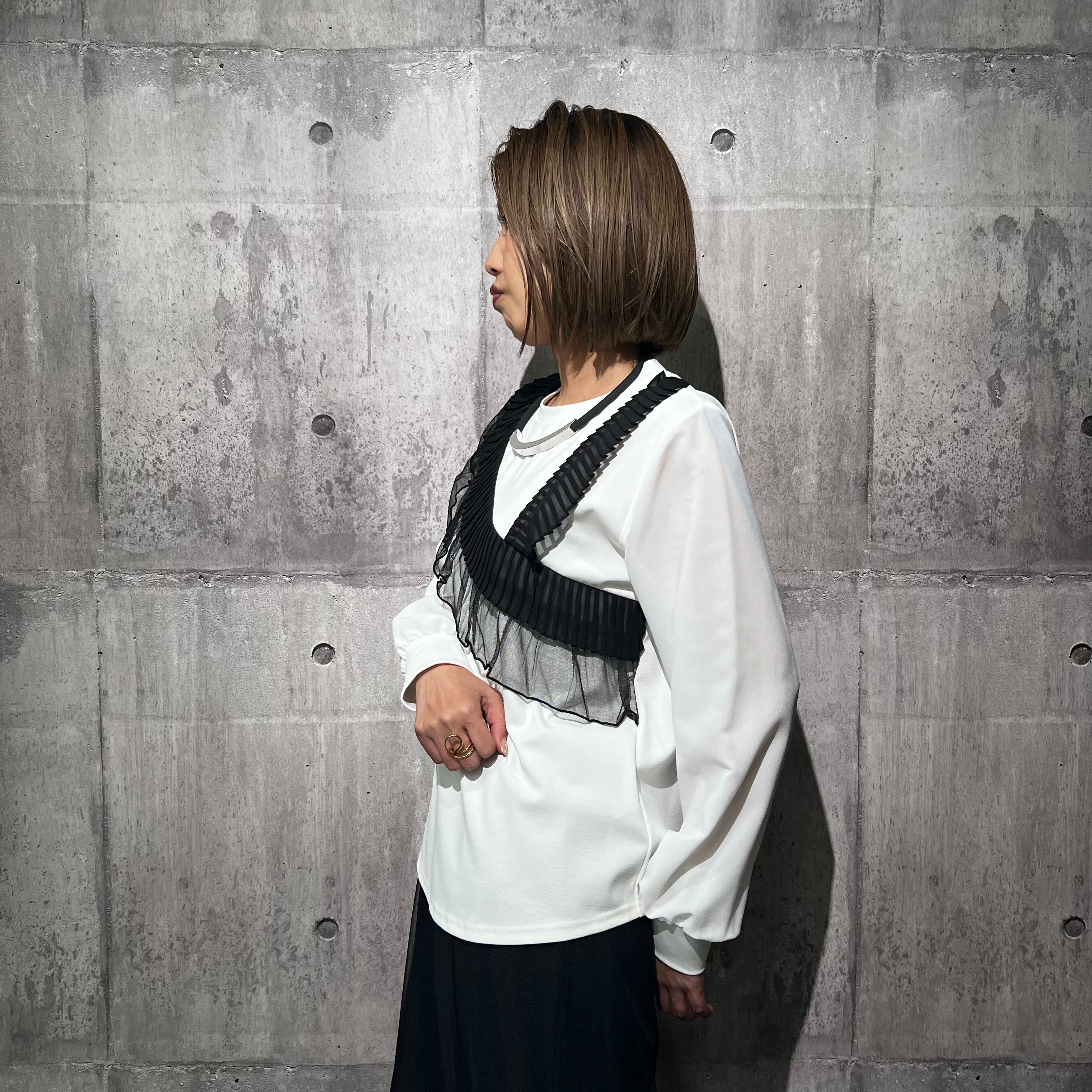 トレンドのアシメデザインをプリーツフリルで大人っぽく仕上げたデザイントップス。