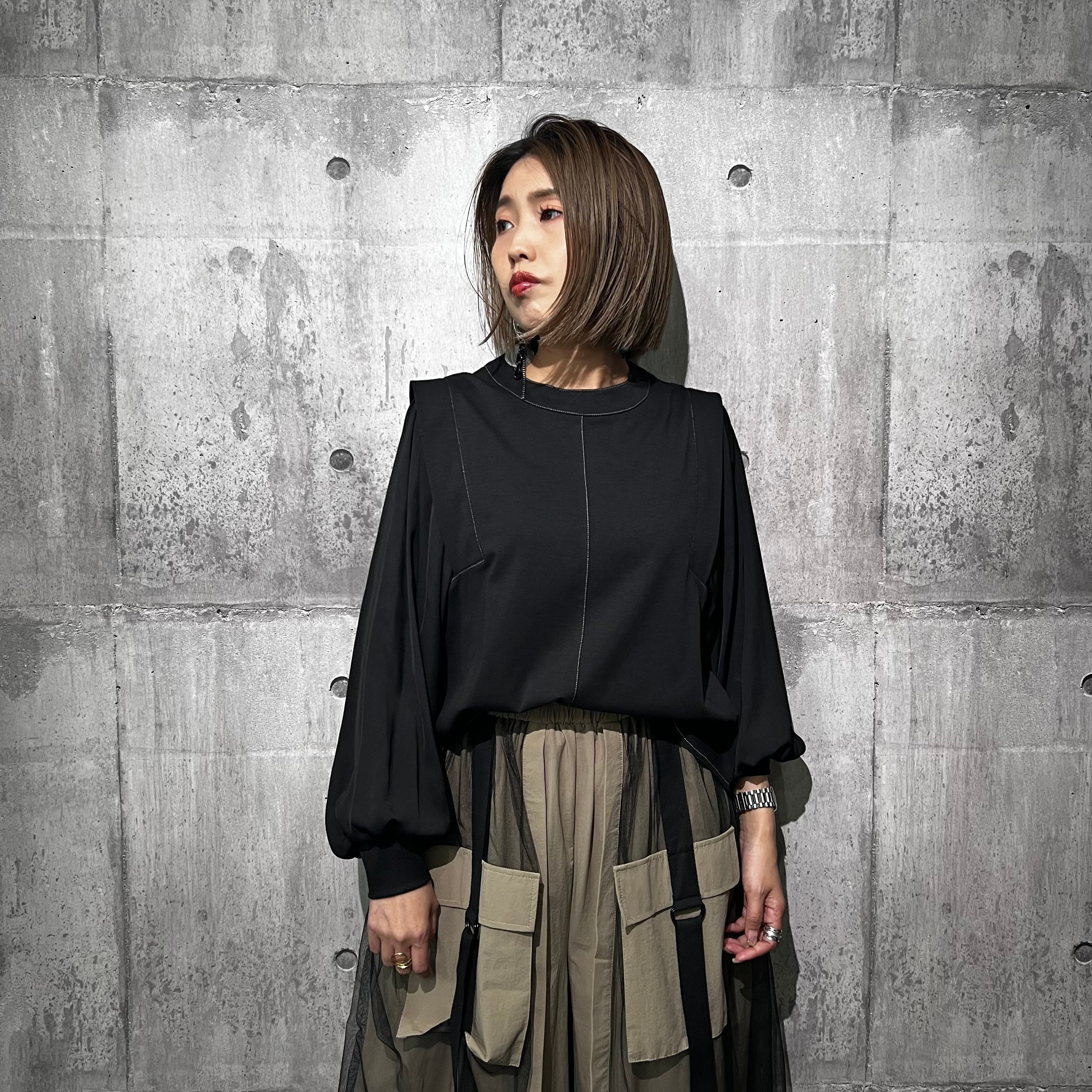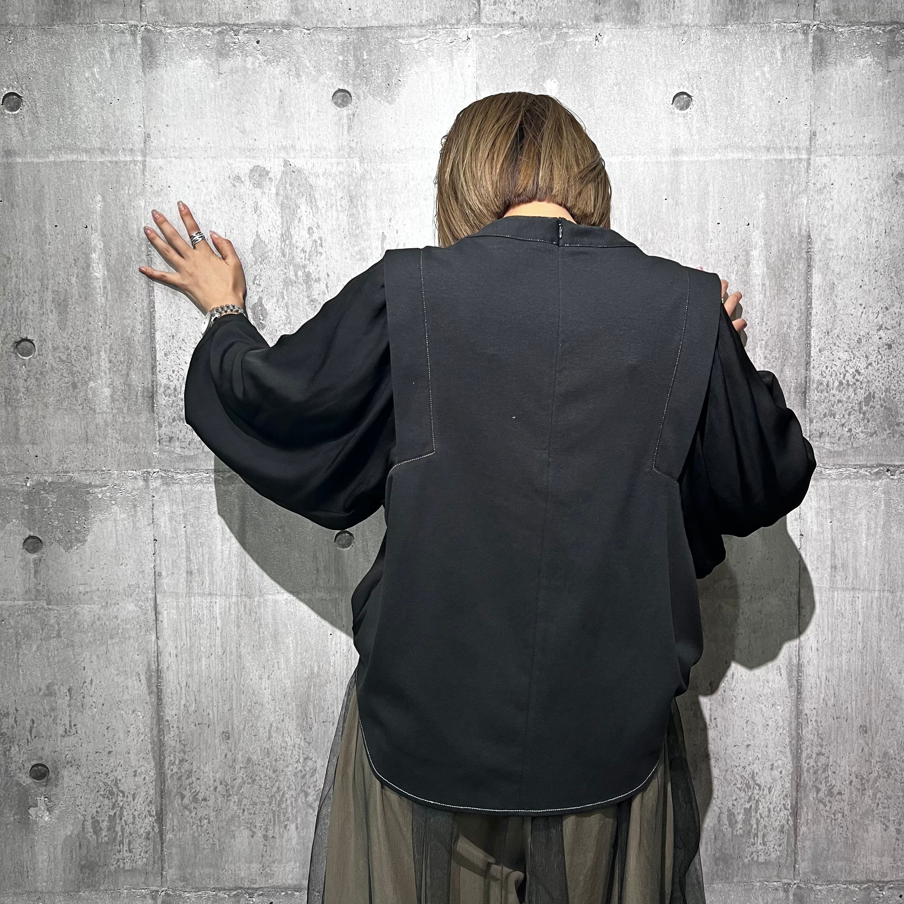 ベストとボリュームスリーブブラウスをレイヤードしたデザイン。