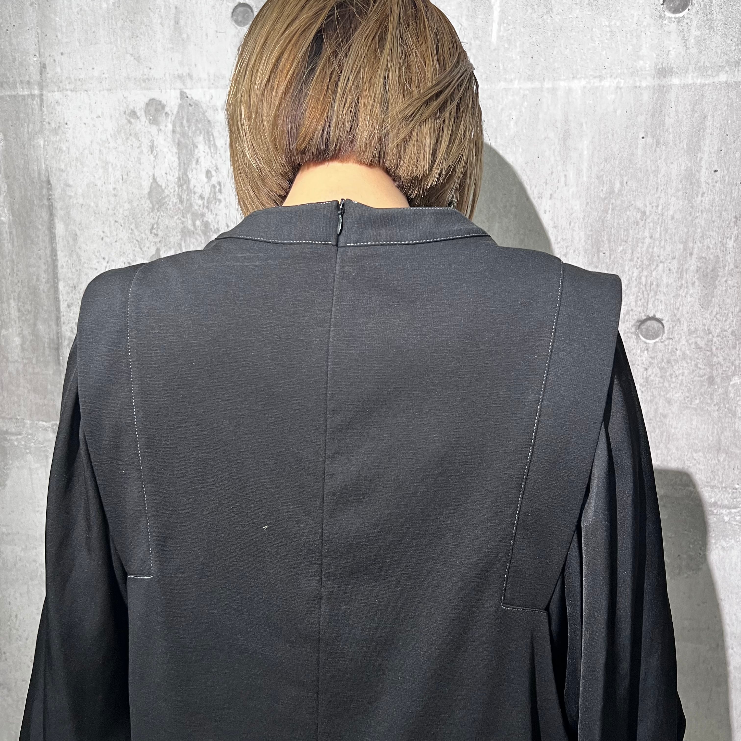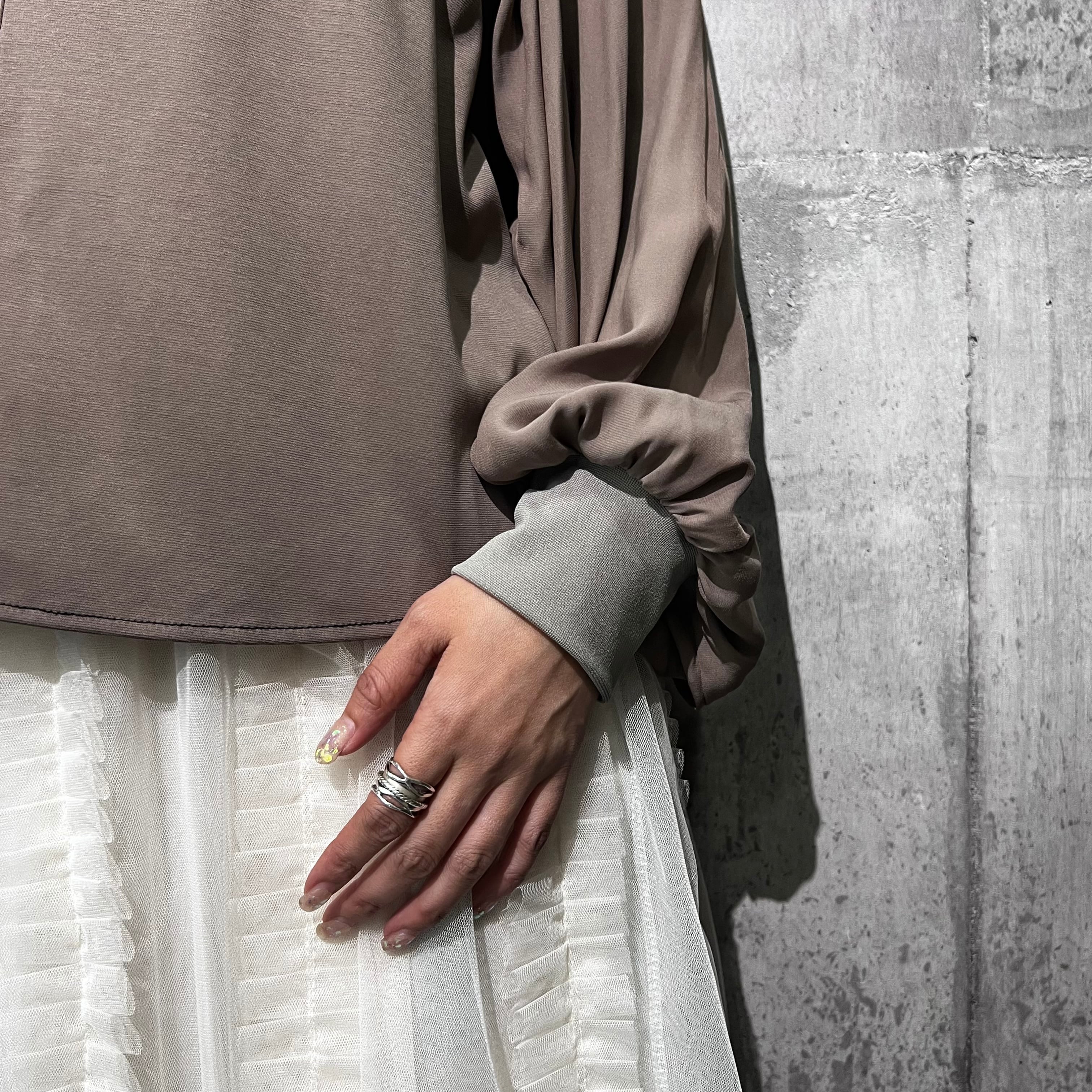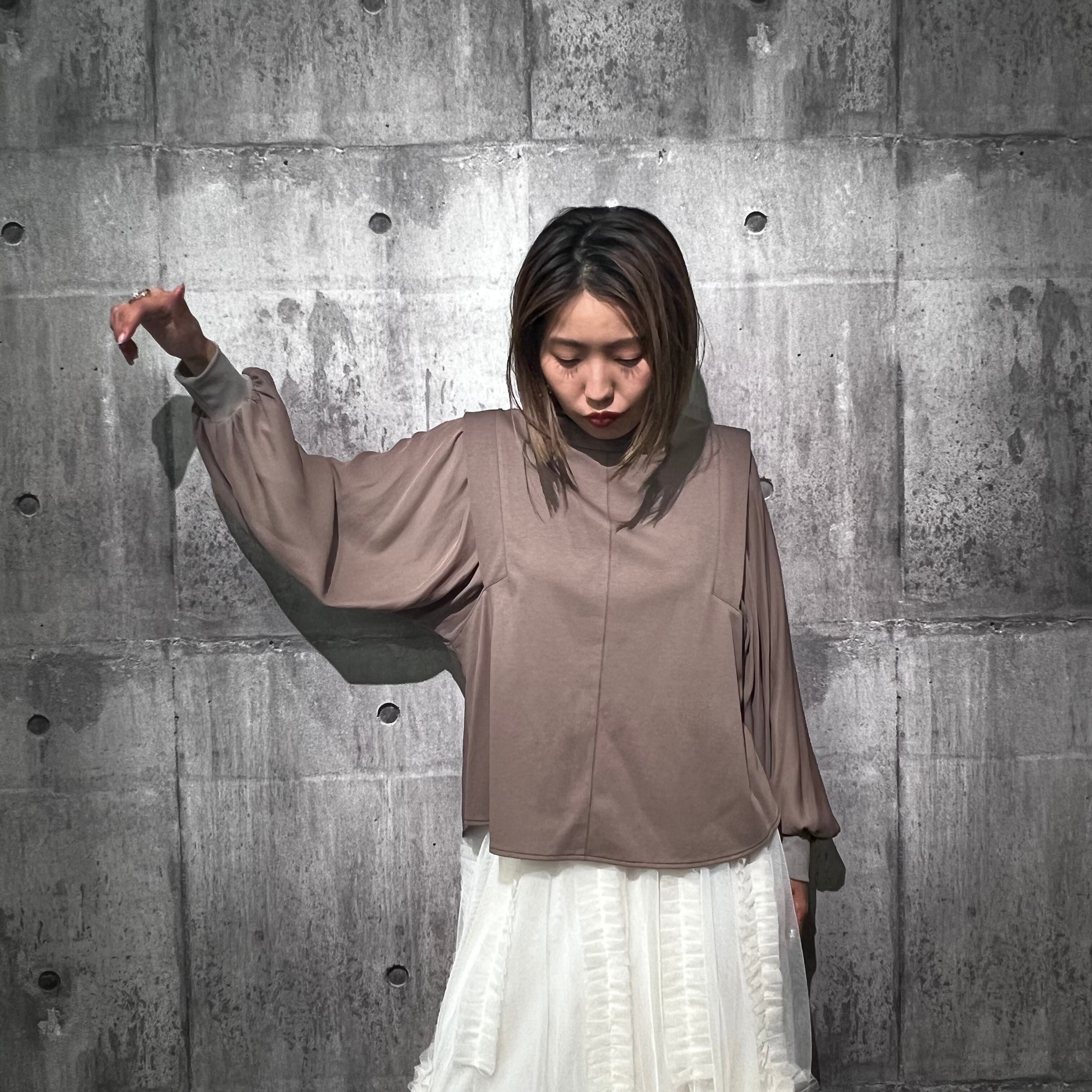 つるっとしたきれいめなポンチ素材に、袖は柔らかいジョーゼット。