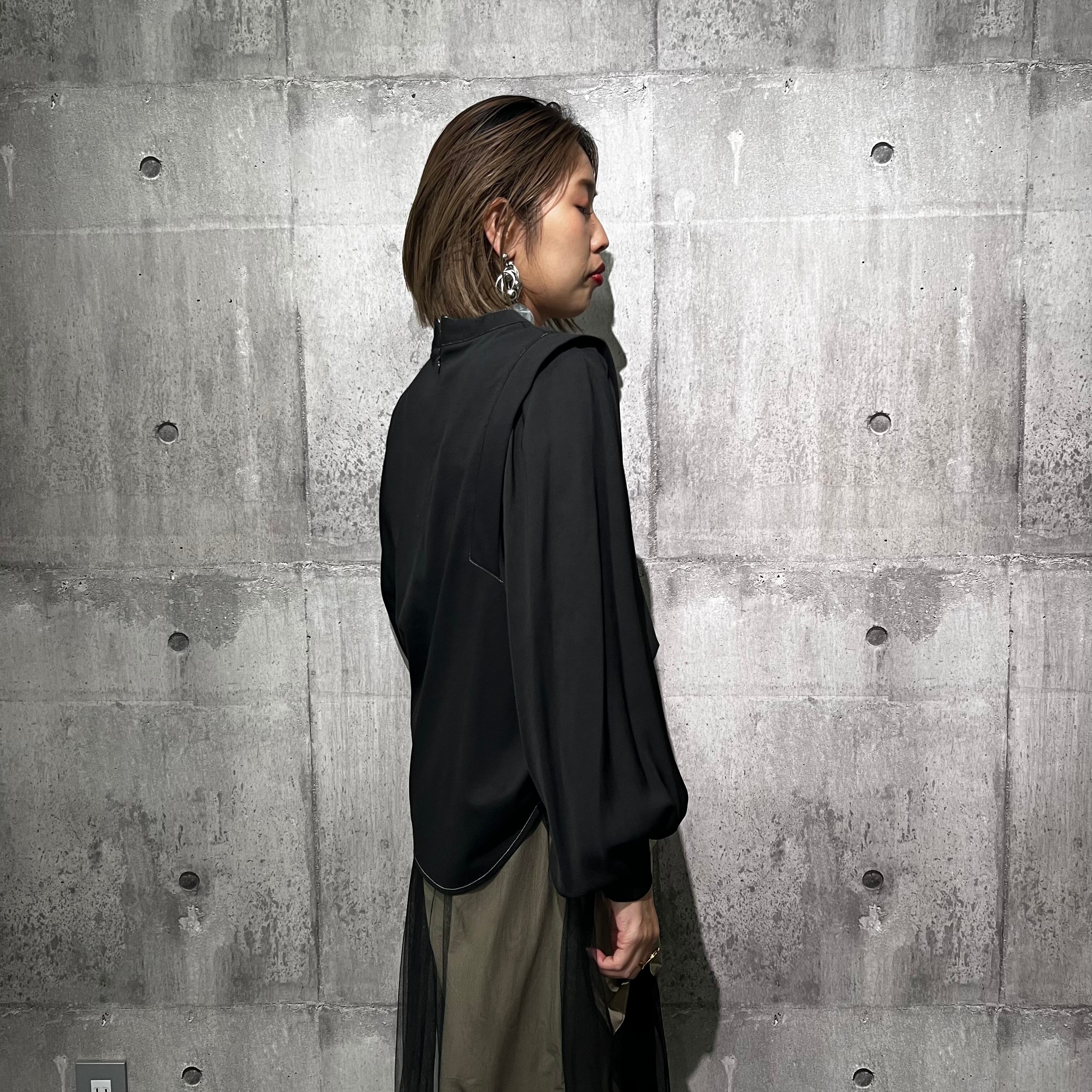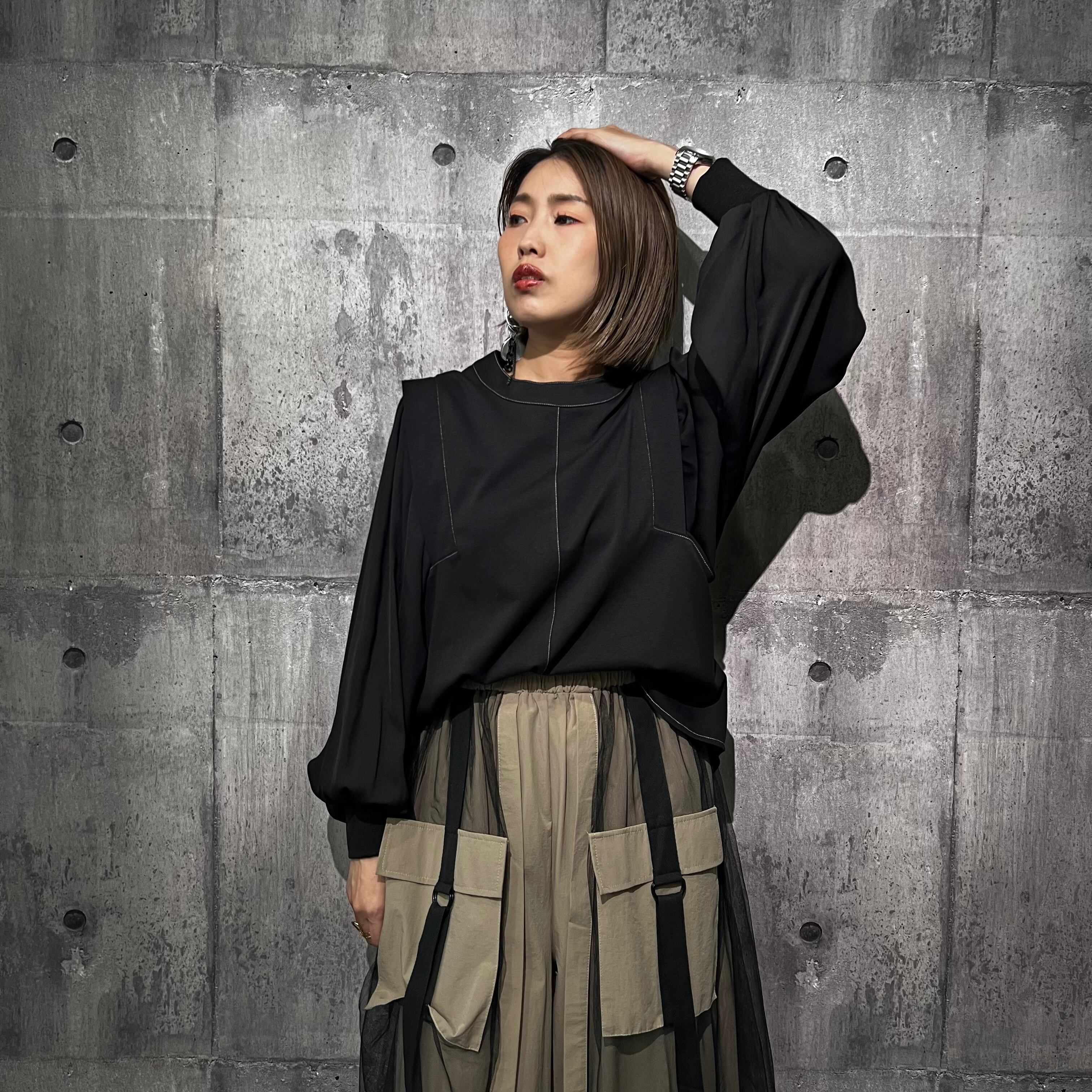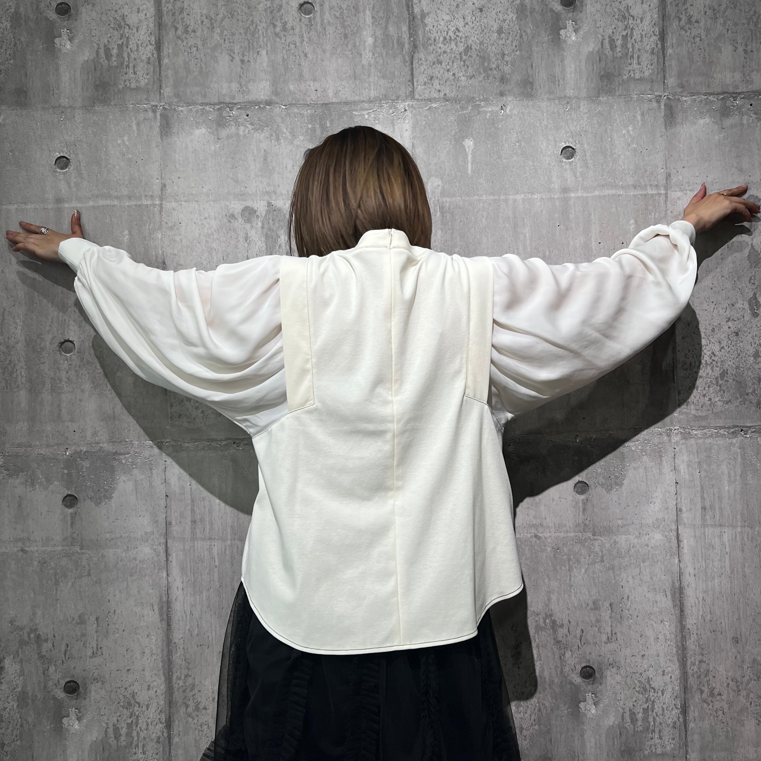 つるっとしたきれいめなポンチ素材に、袖は柔らかいジョーゼット。