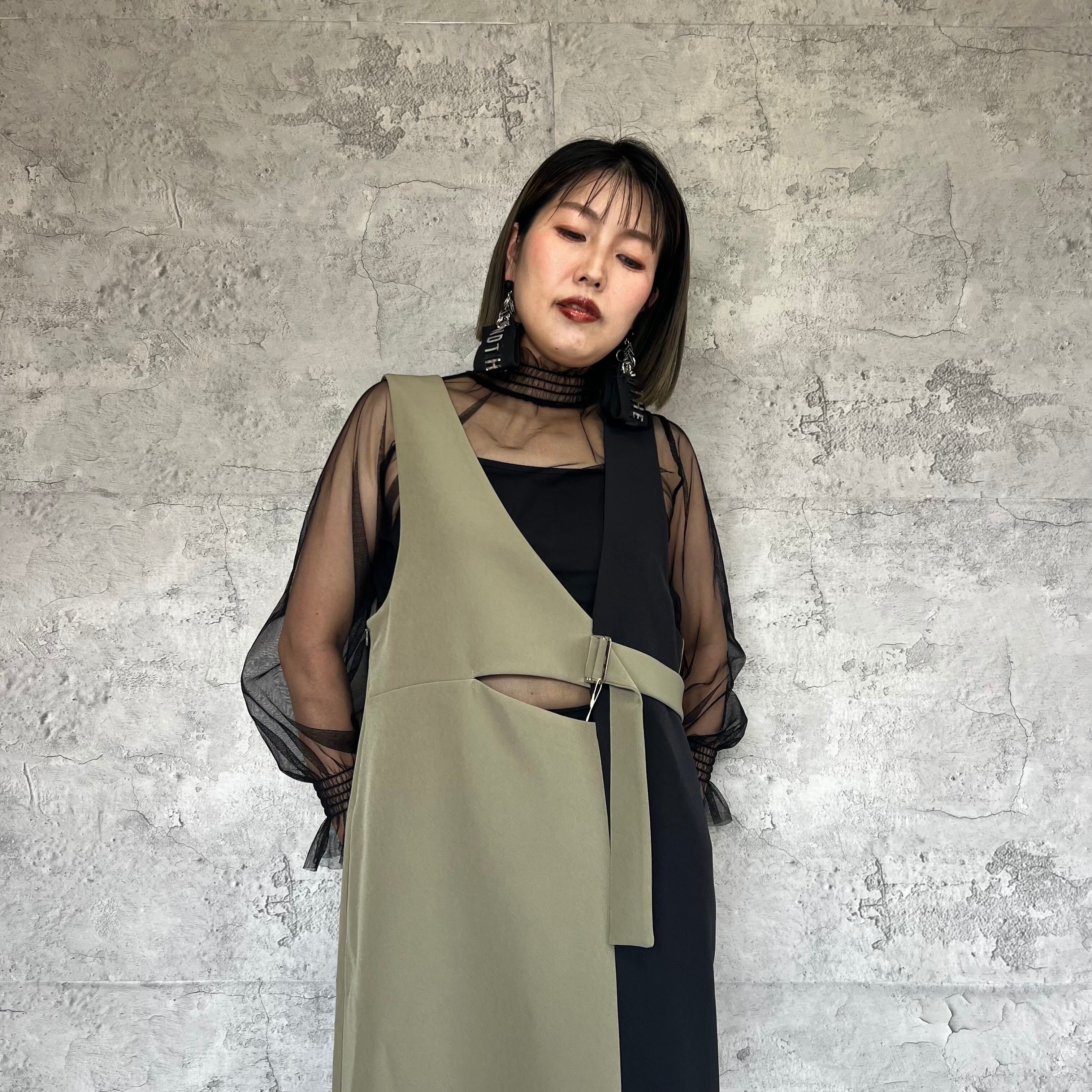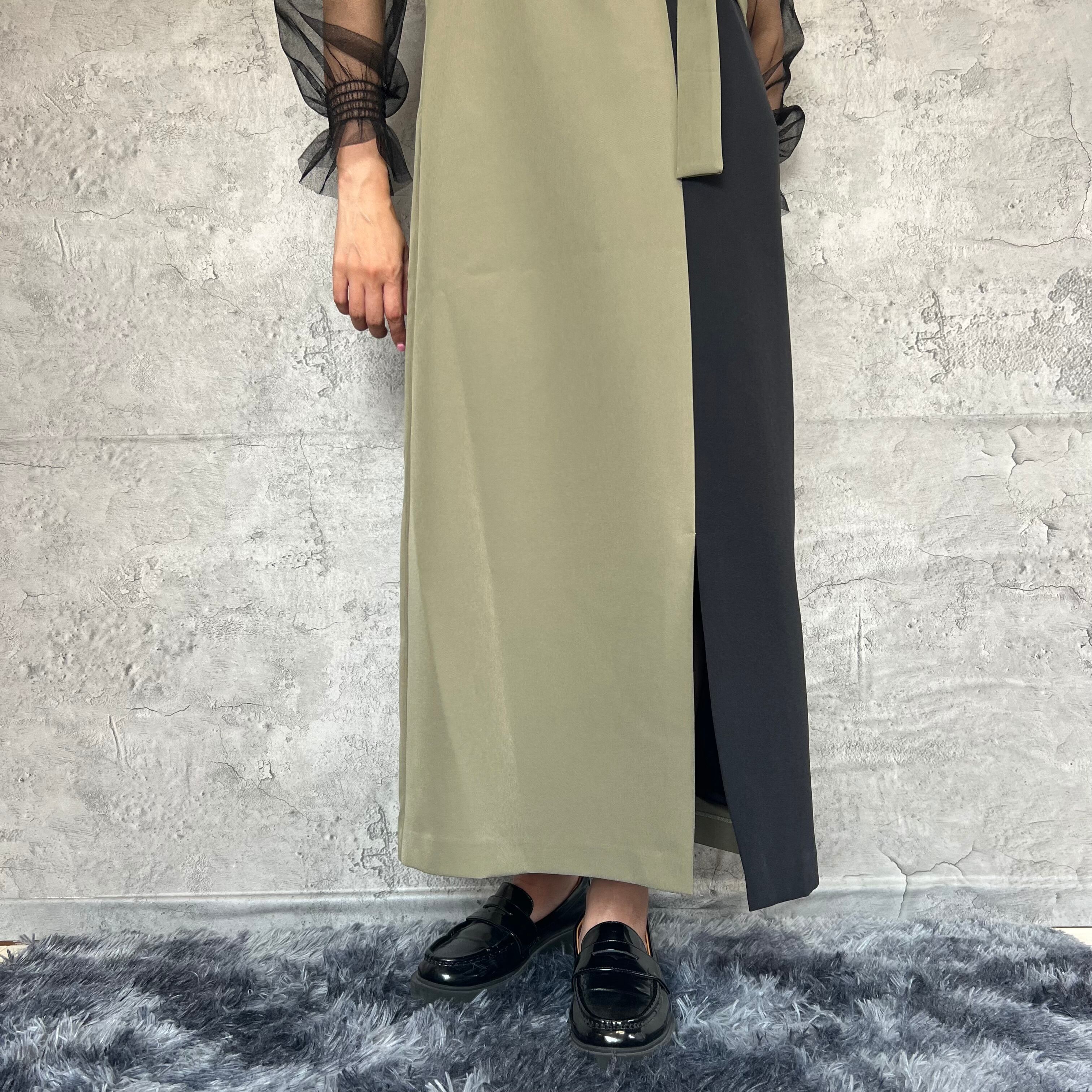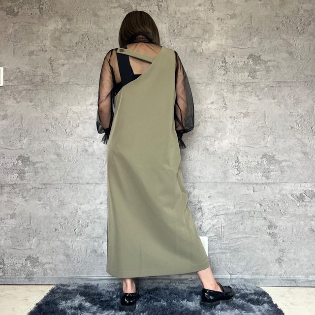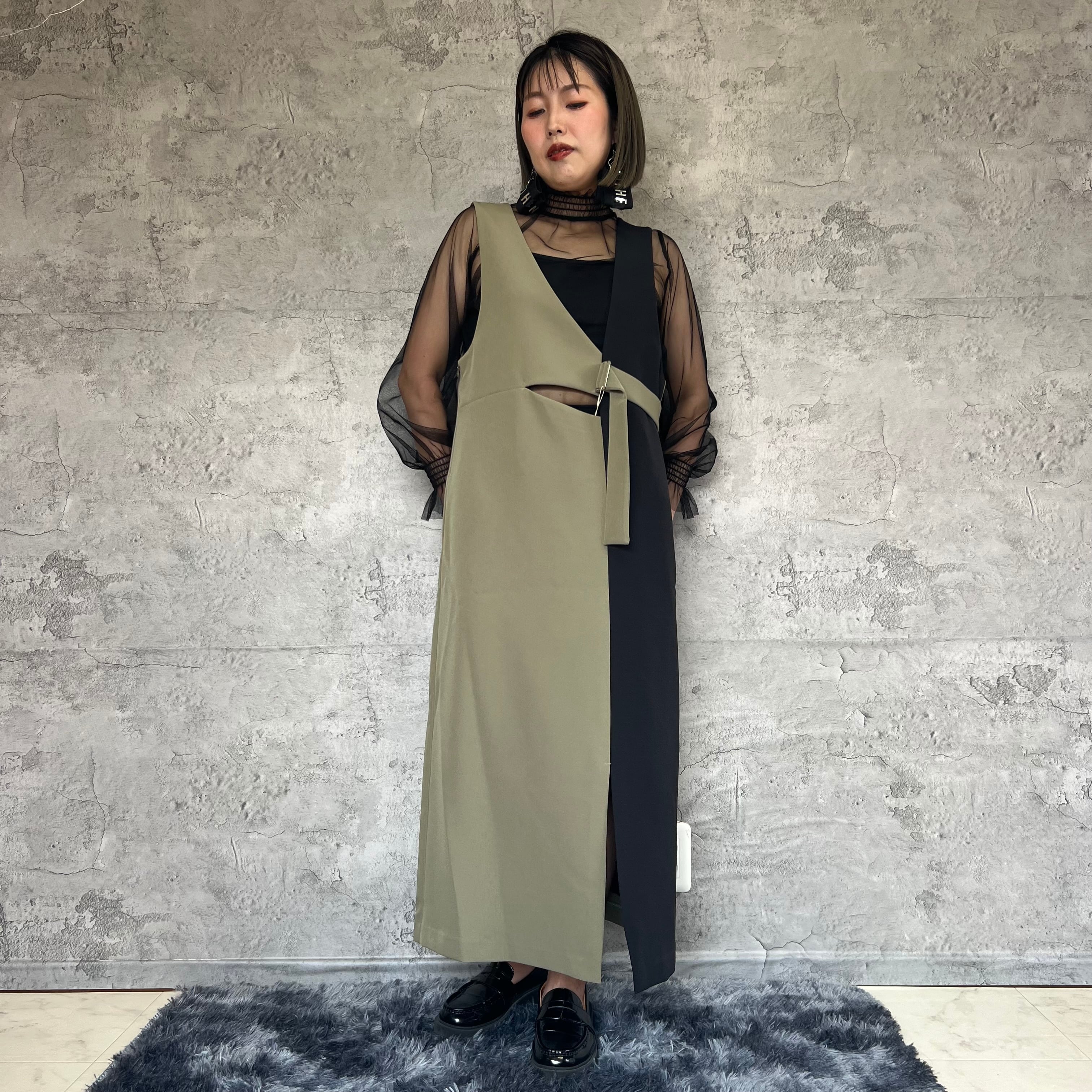 独特なデザインが目を引くアシンメトリーラインで、どこかレトロでありながらも今っぽいスタイリングを楽しめます。裾野スリット部分がエレガントさを演出してます。