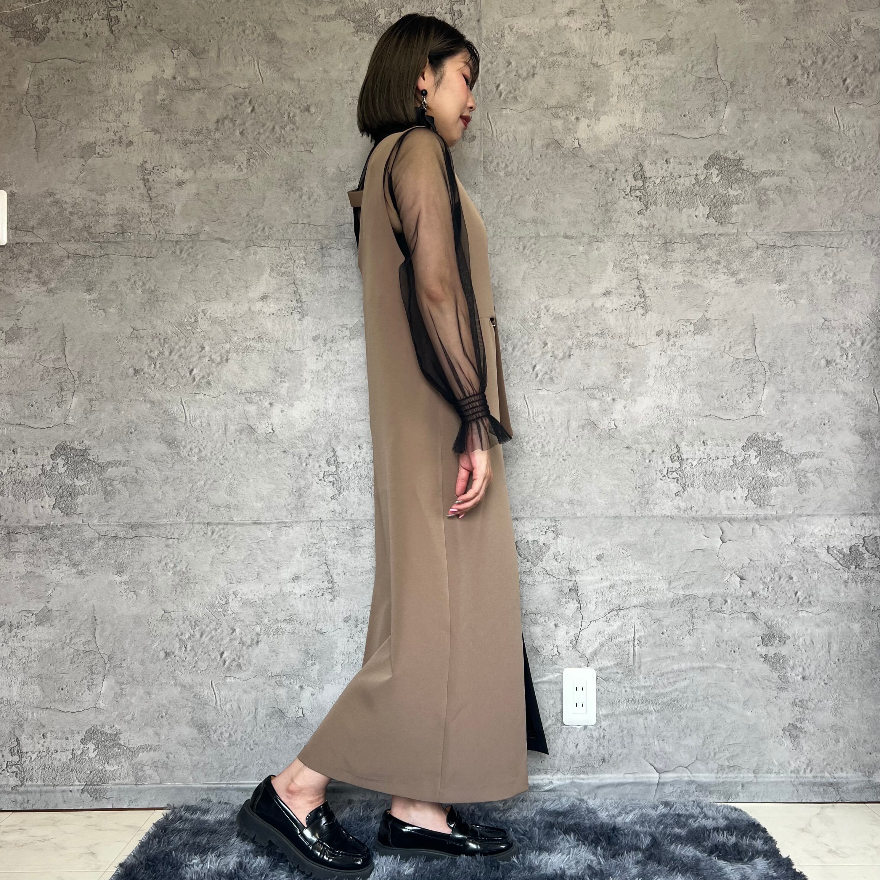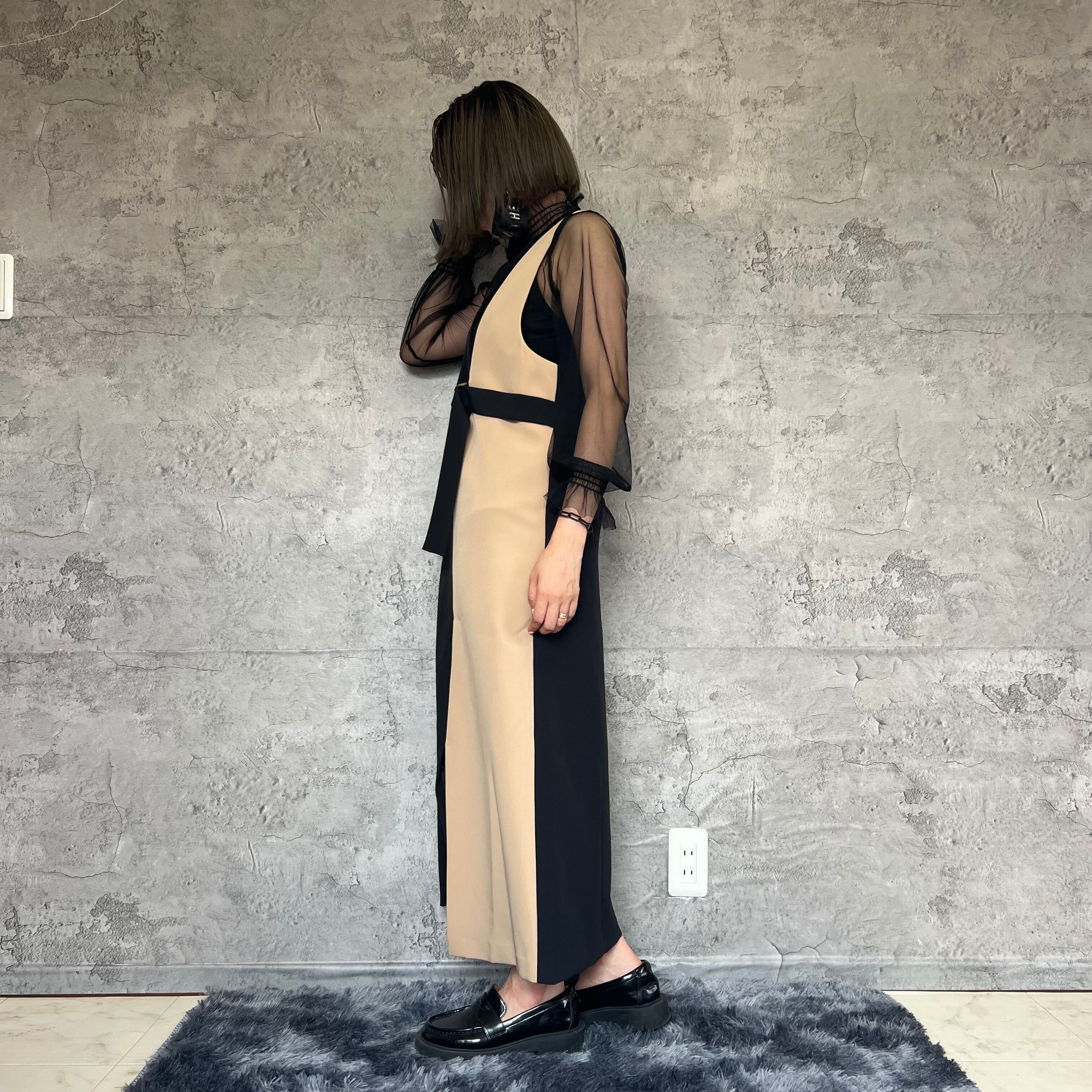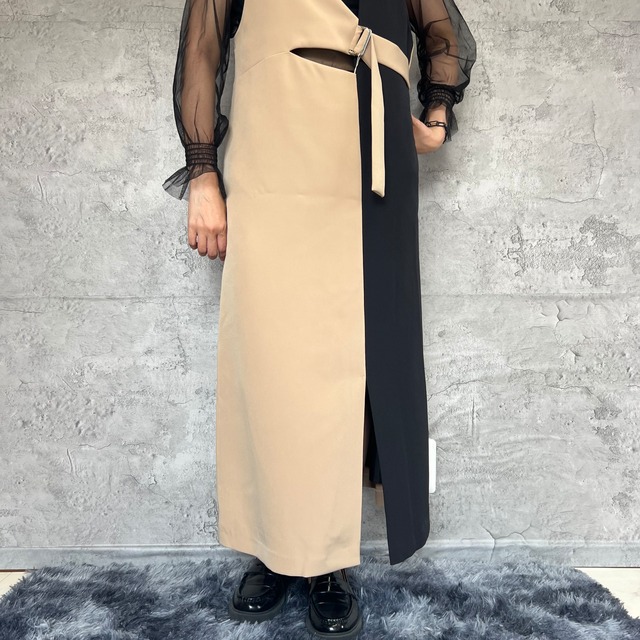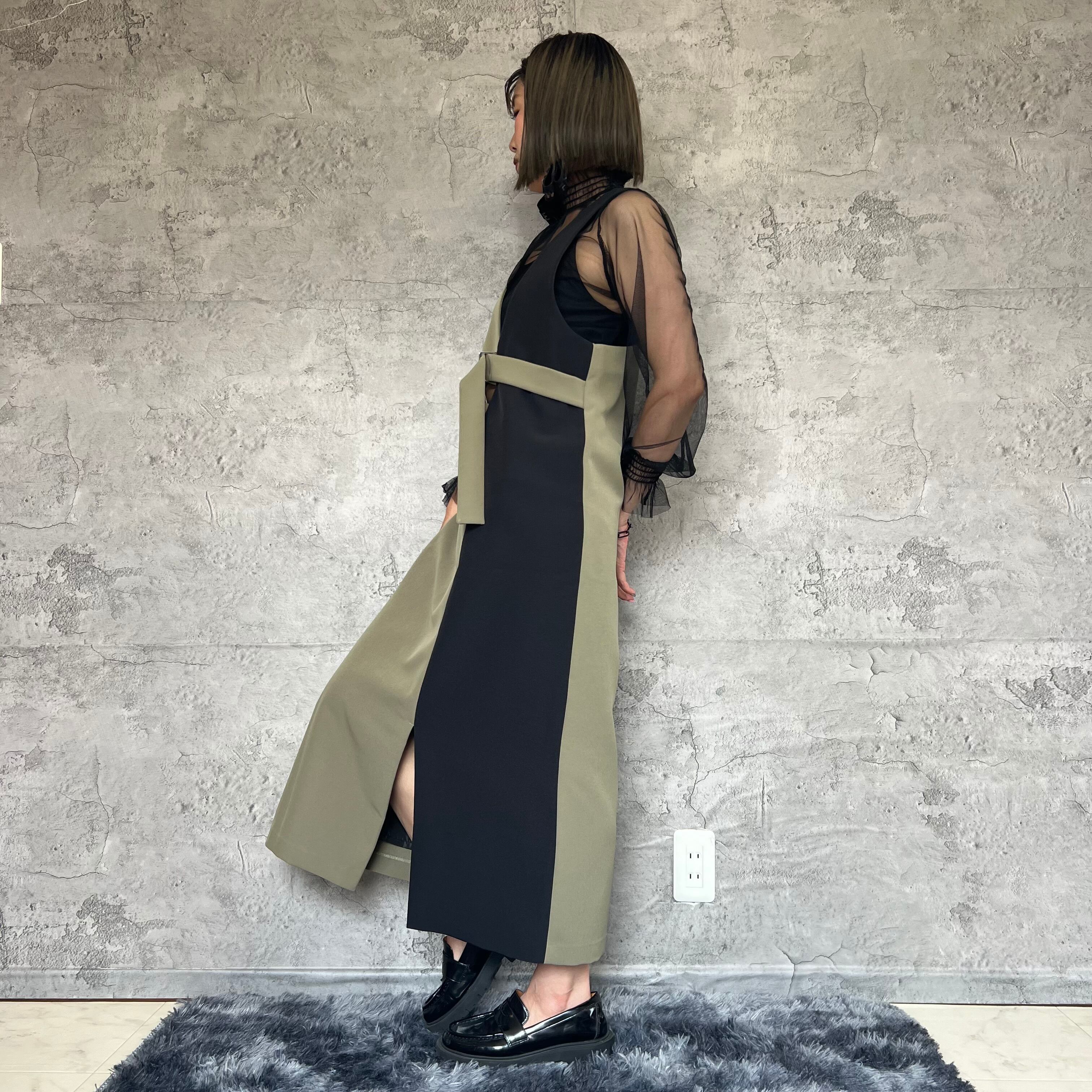 独特なデザインが目を引くアシンメトリーラインで、どこかレトロでありながらも今っぽいスタイリングを楽しめます。裾野スリット部分がエレガントさを演出してます。
