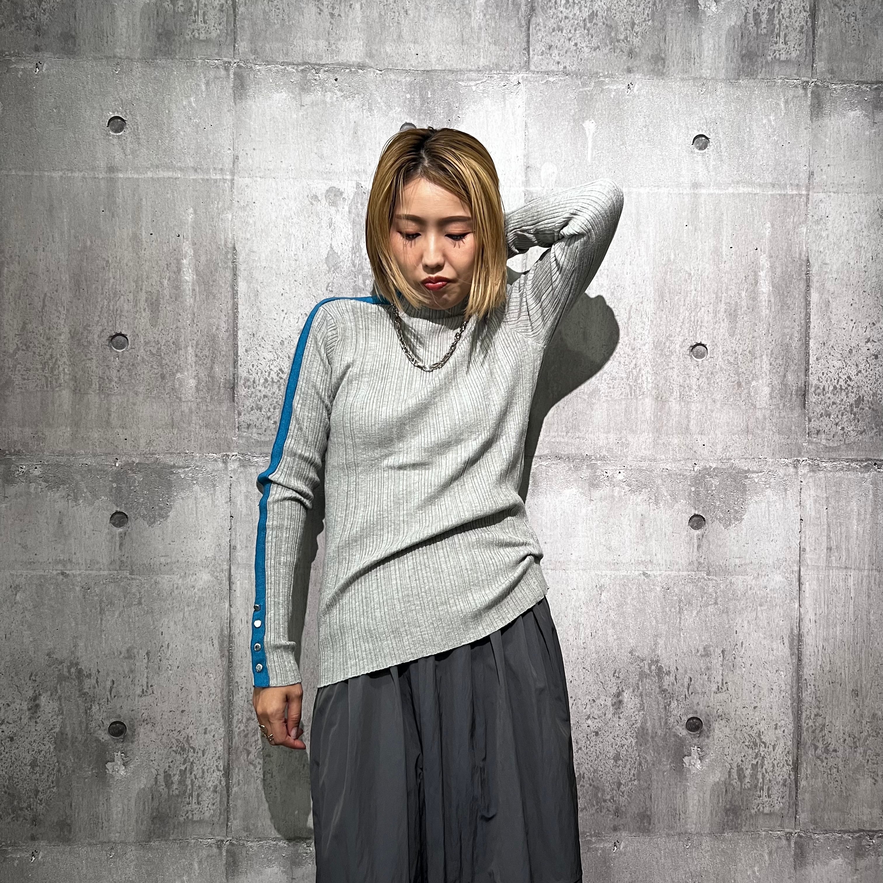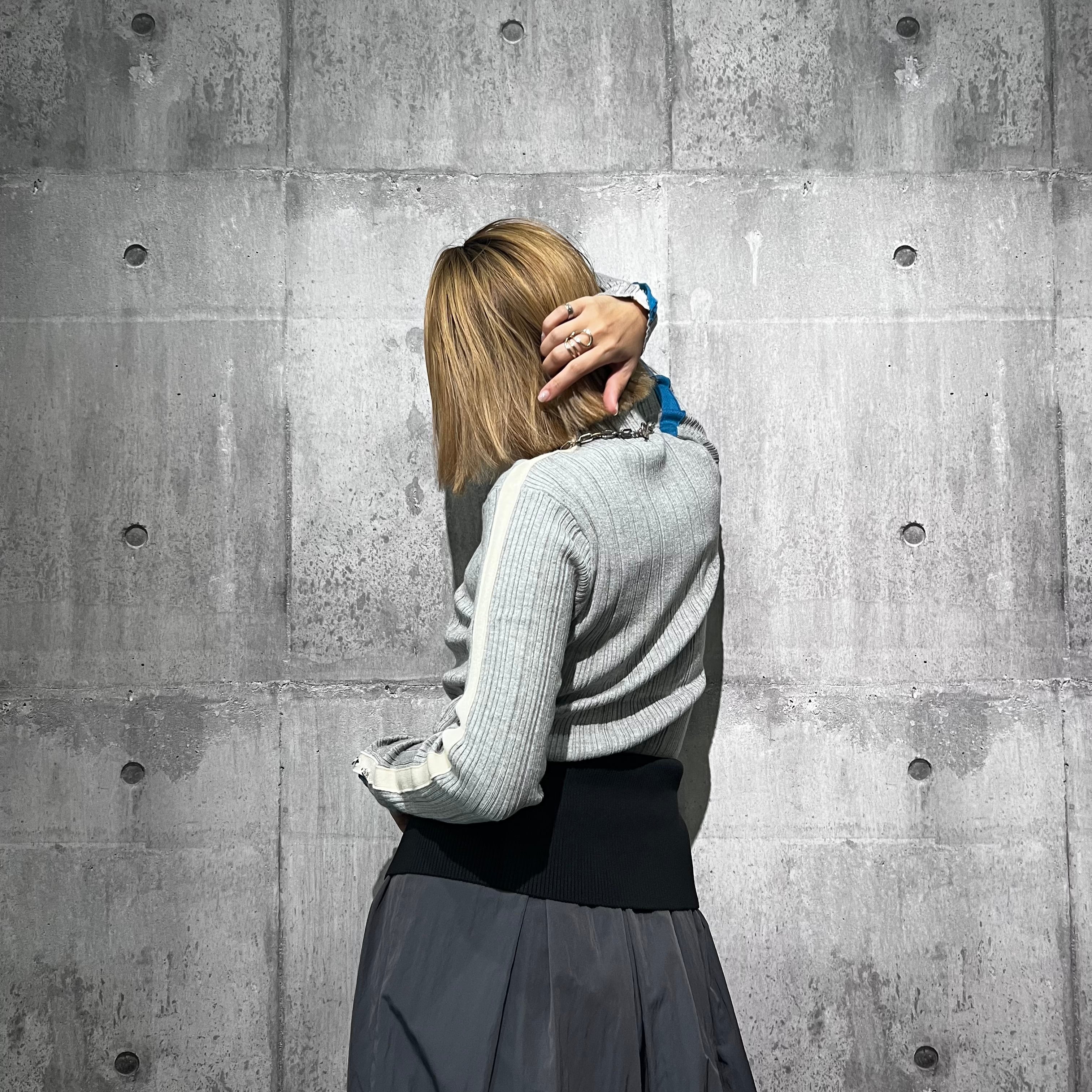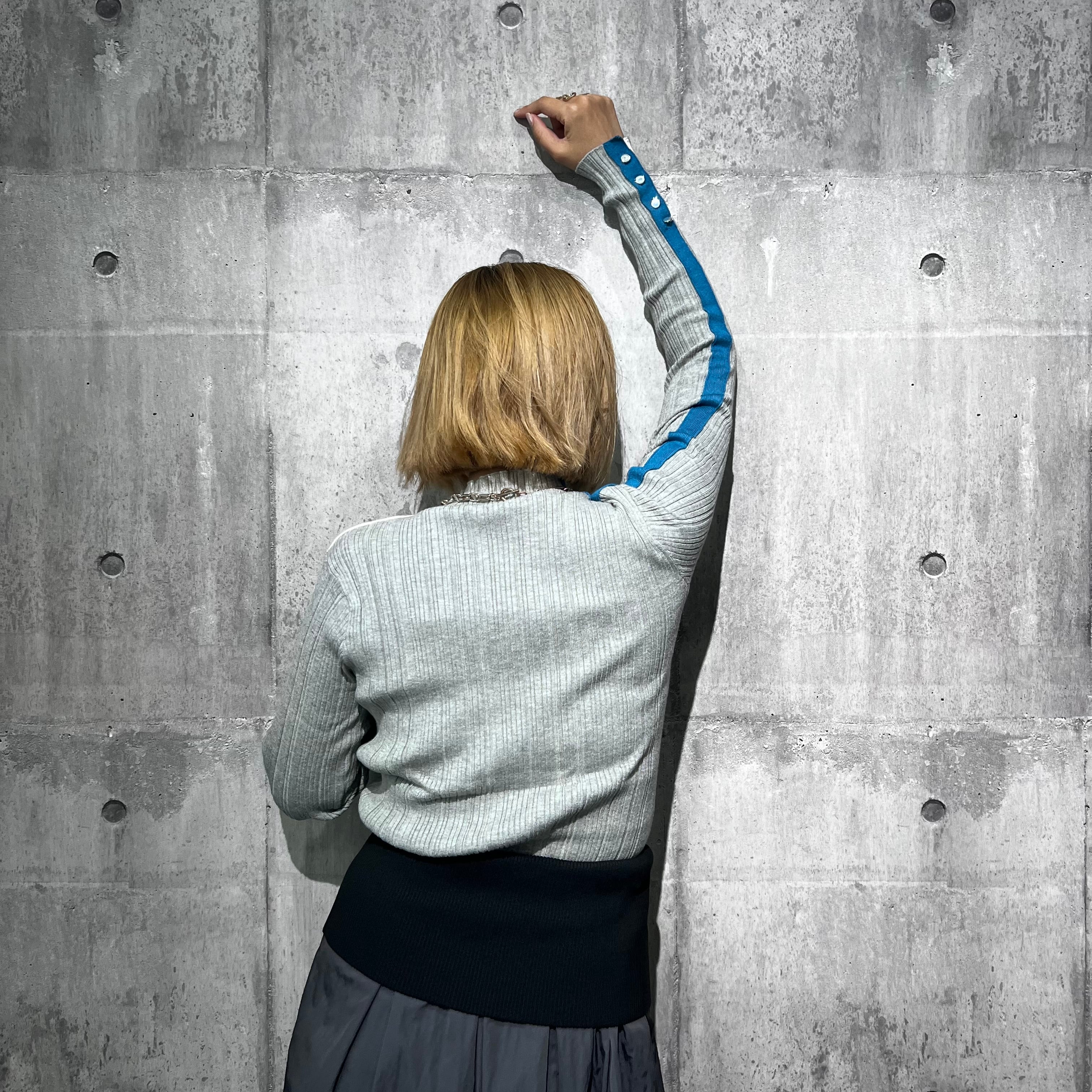 袖に左右アシンメトリーの配色を施し、シンプルな中にポイントのあるデザイン。
