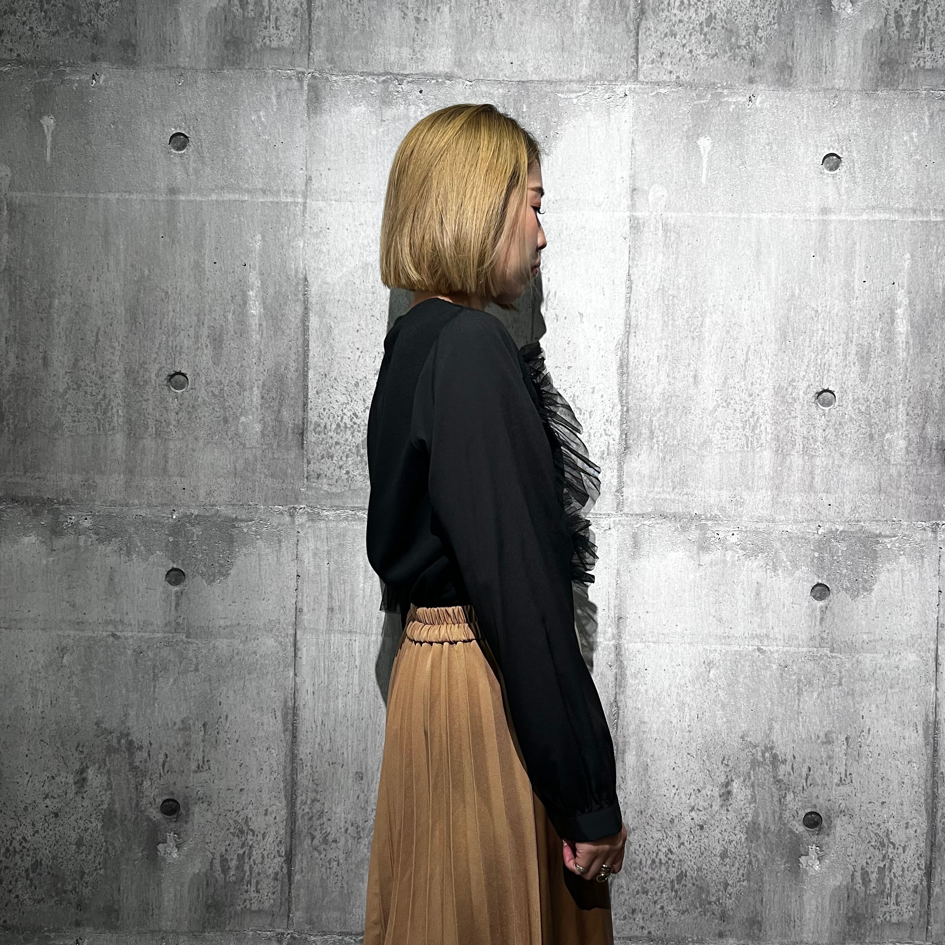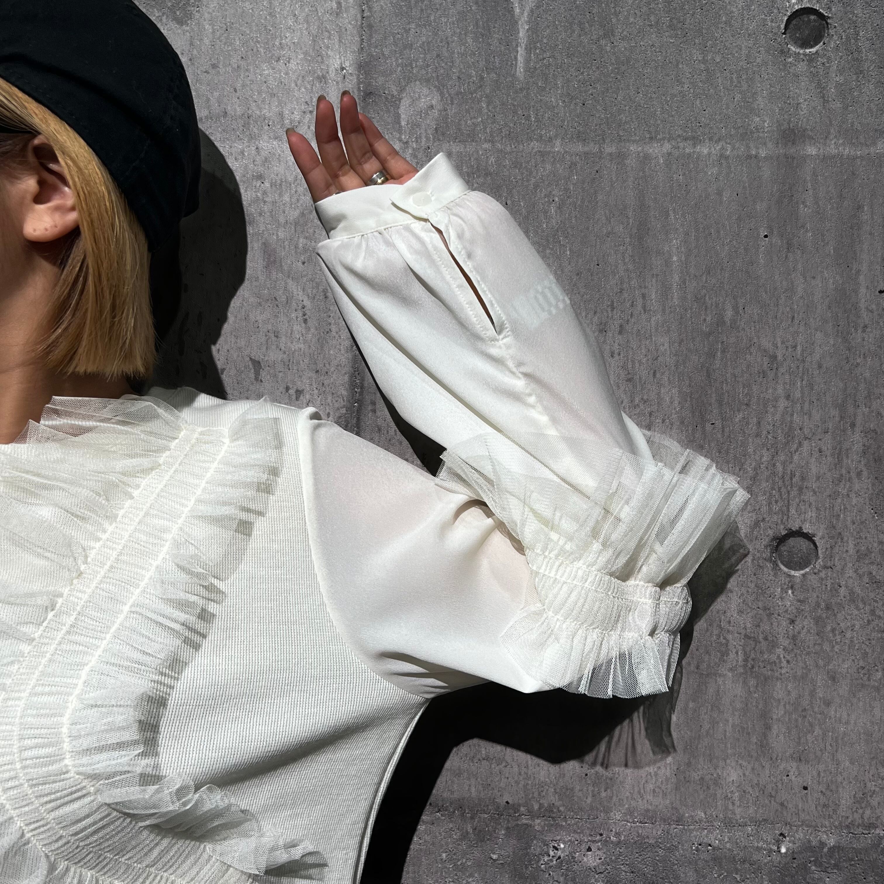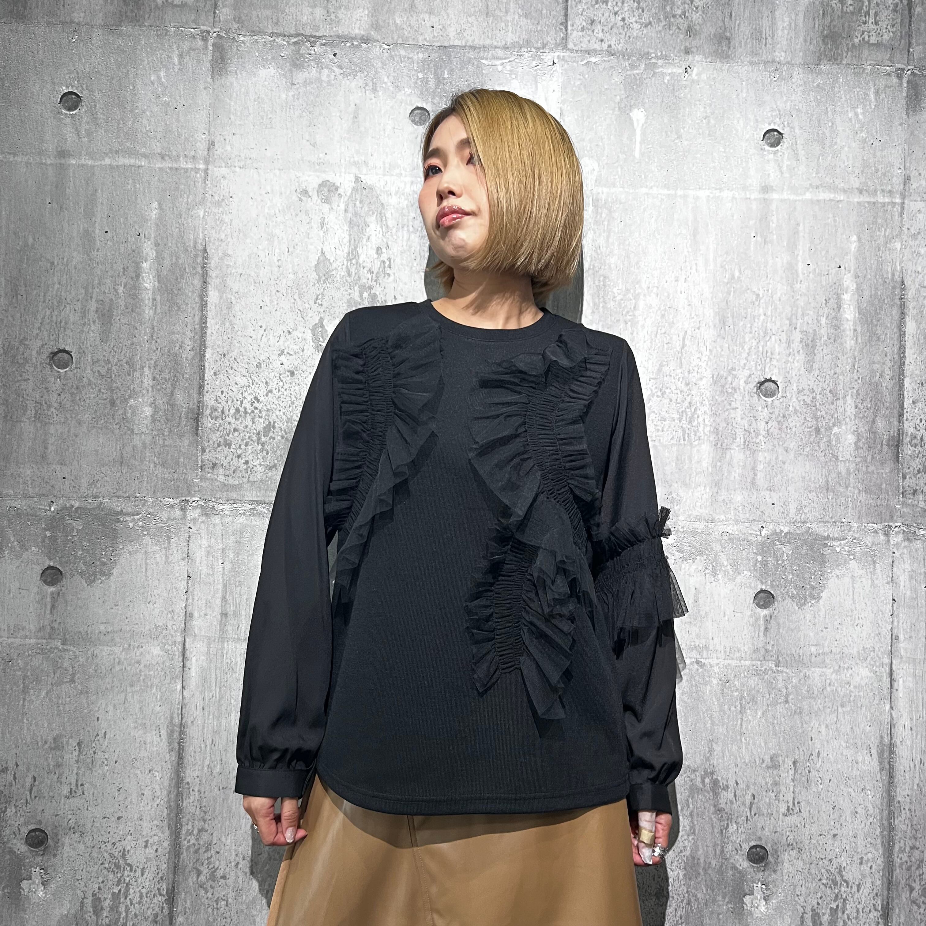 シャーリング加工を施したチュールフリルを大胆に配置したニットソートップス。