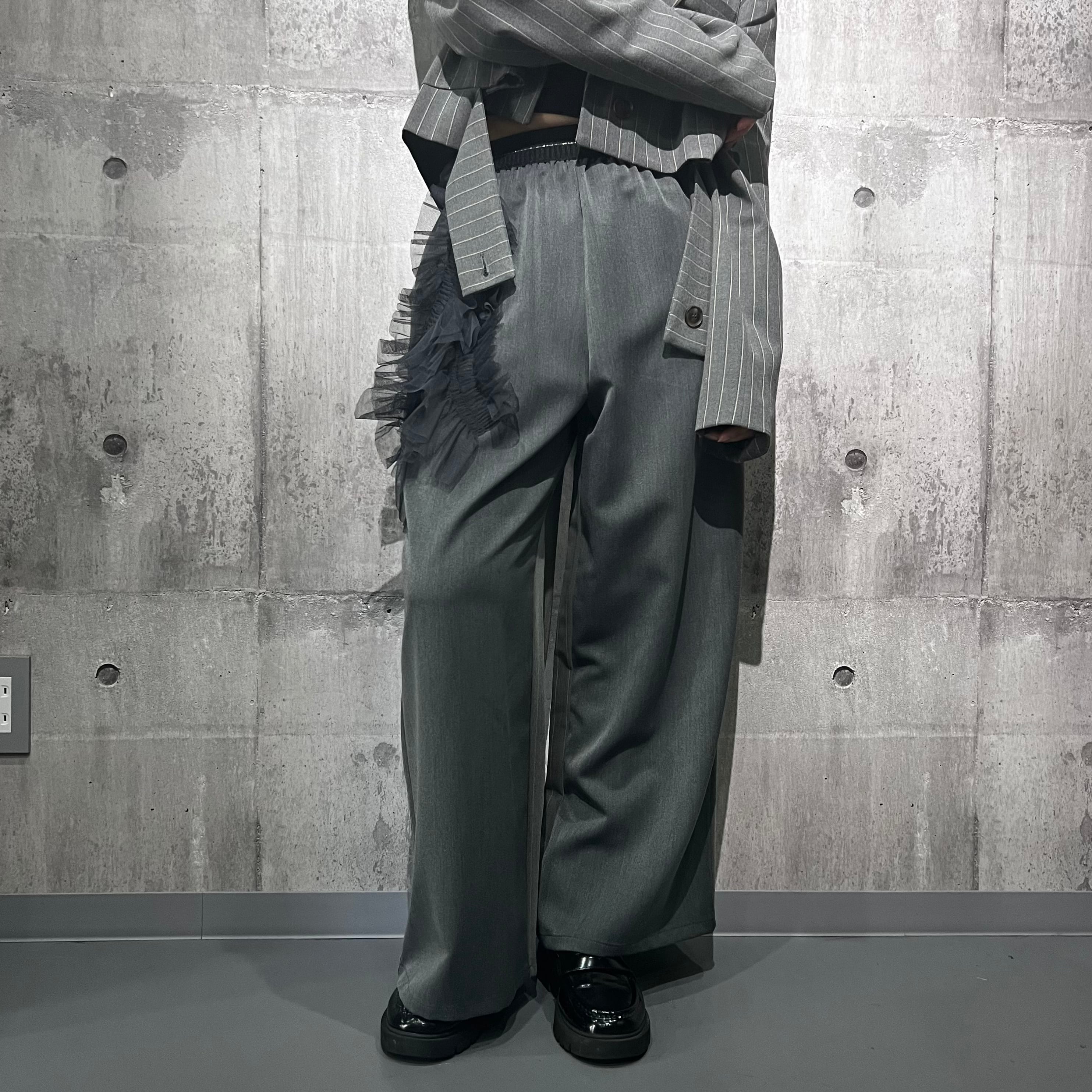 シャーリング加工を施したチュールフリルを大胆に配置したスラックスパンツ。