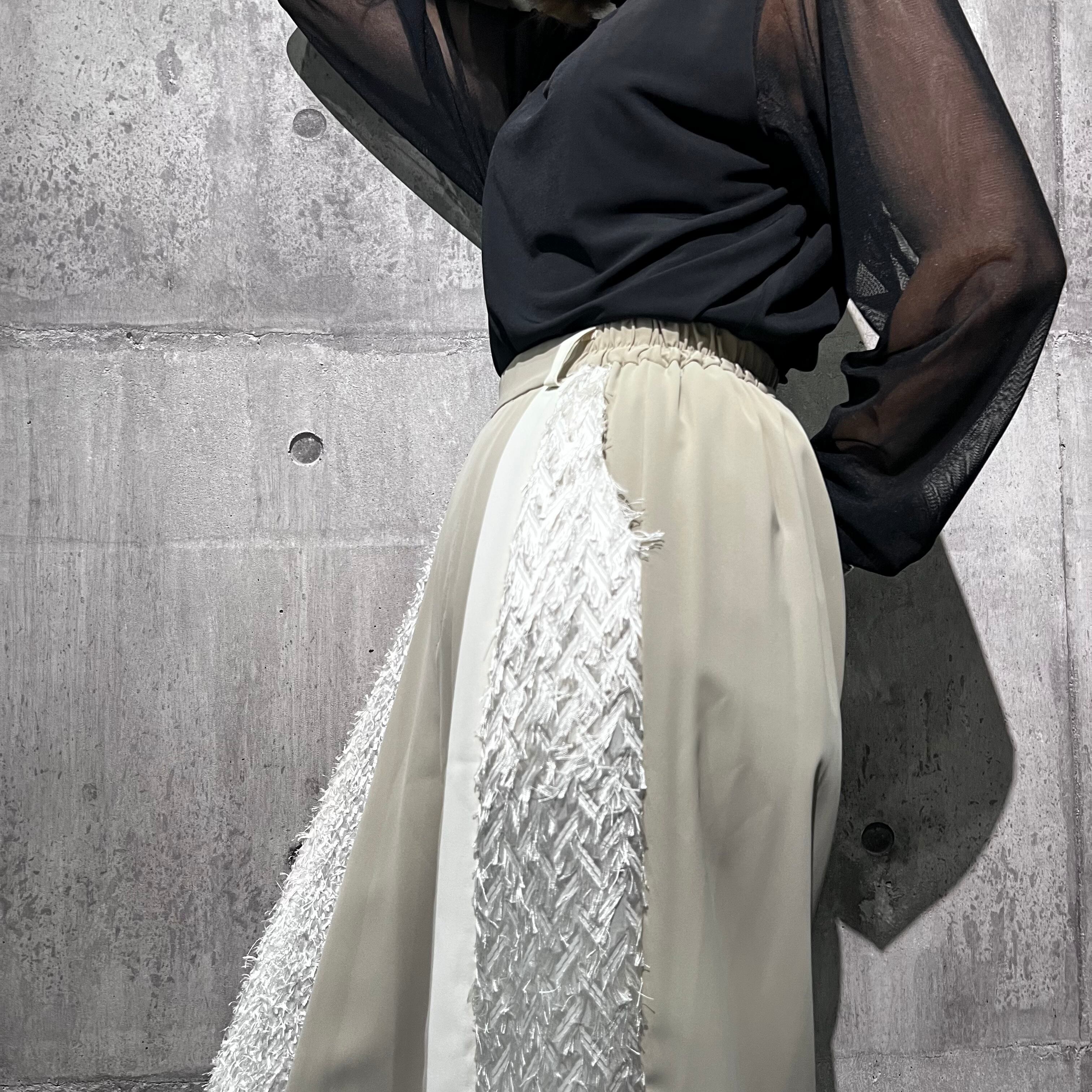 体型カバー力と、縦の切り替えで脚長効果もあるユルさの中にも上品さのある仕上がりです。